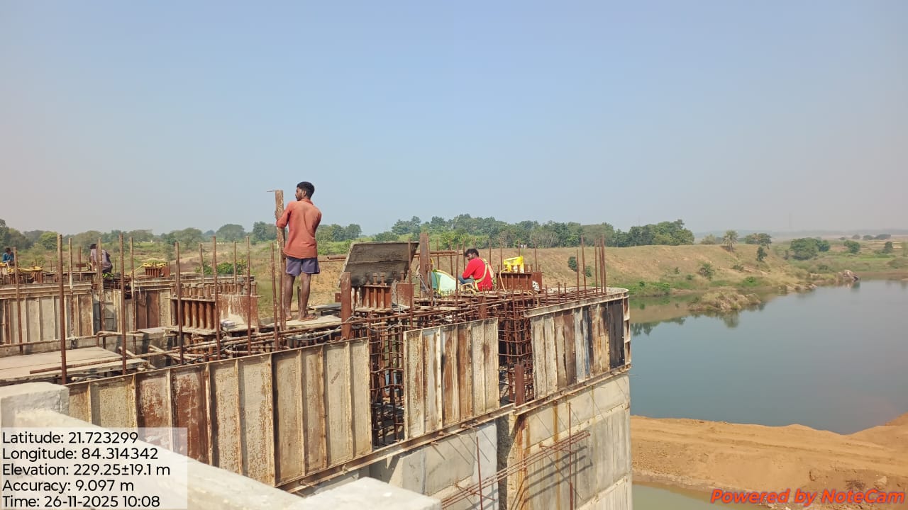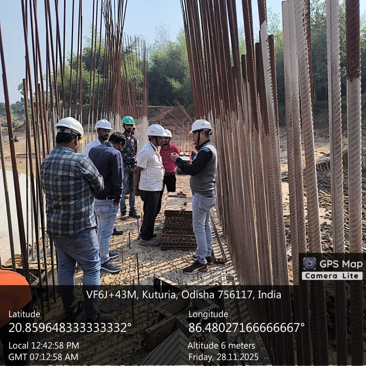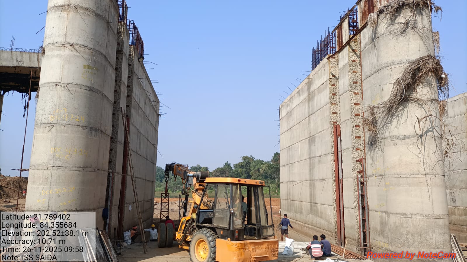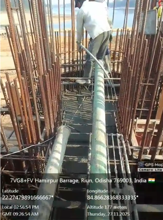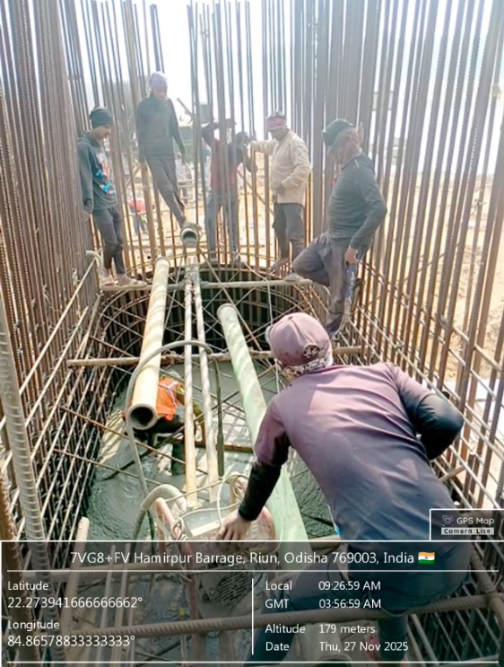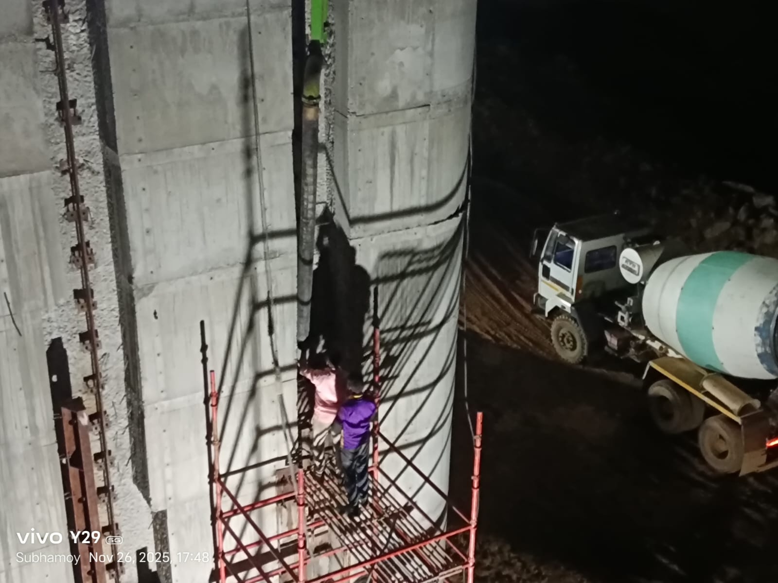 Concrete casting with RCC M25A20 grade at Pier no.12/mid. right divide wall for 7th lift at U/S side and 8th lift at D/S side from RL-241.60m to RL-242.95m is in progress through concrete pump in presence of JE,KID, Site Engineers of PMC & EPC agency. Slump achieved 87mm on 26.11.2025