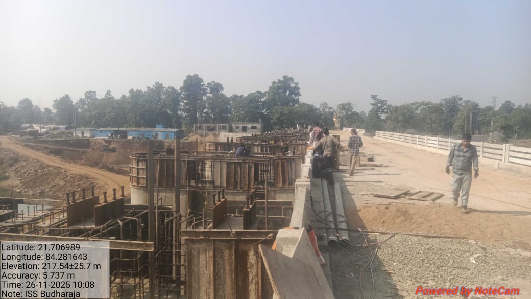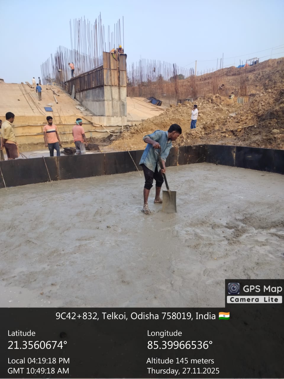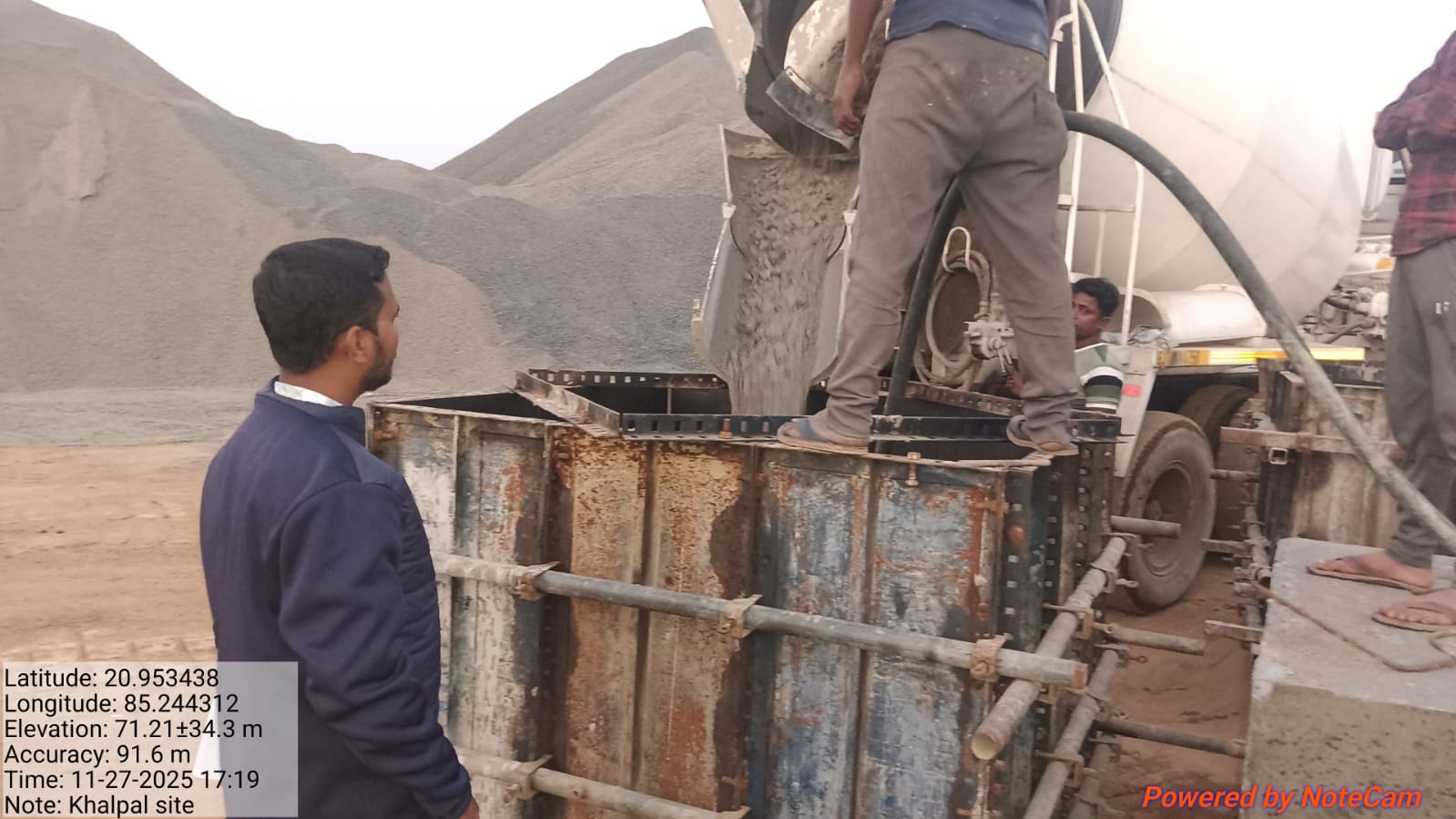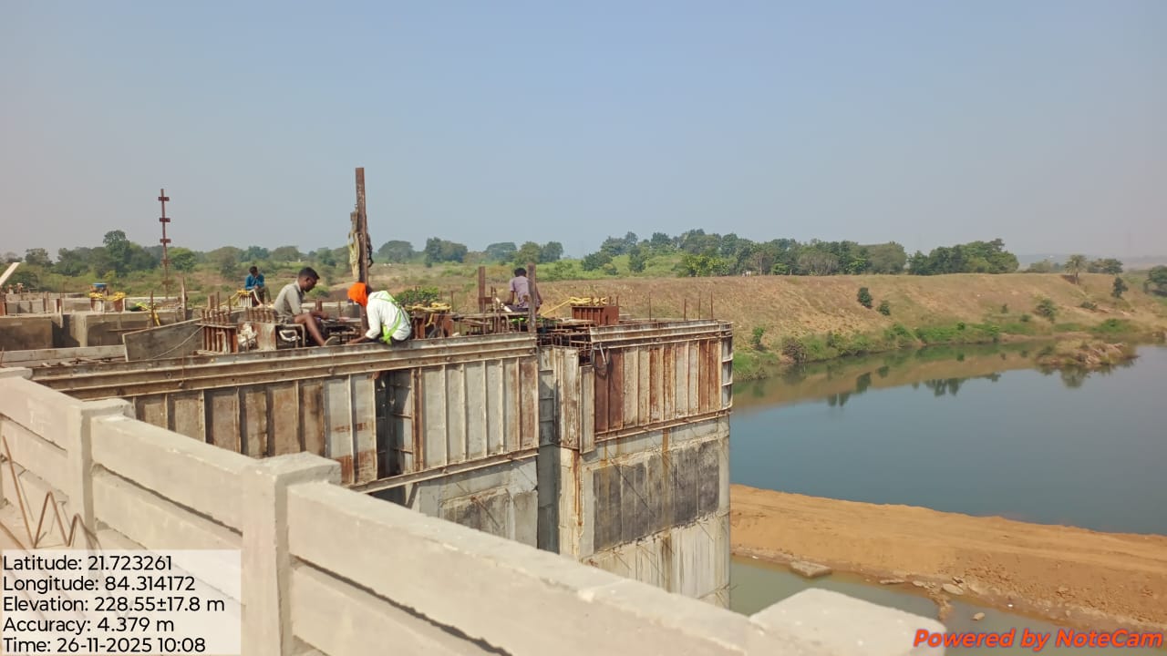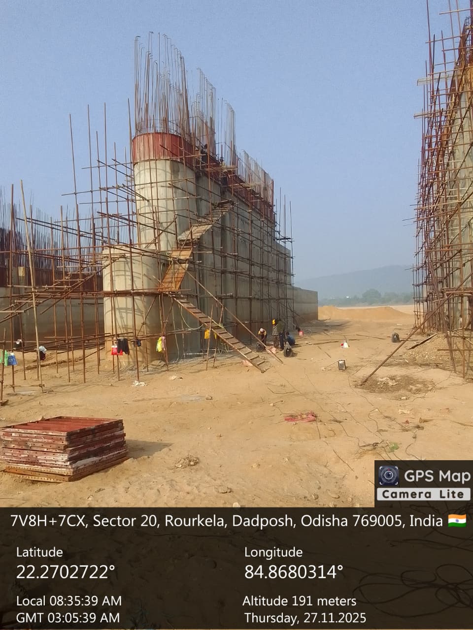 Concrete casting with RCC M25A20 grade at Pier no.12/mid. right divide wall for 7th lift at U/S side and 8th lift at D/S side from RL-241.60m to RL-242.95m is in progress through concrete pump in presence of JE,KID, Site Engineers of PMC & EPC agency. Slump achieved 87mm on 26.11.2025