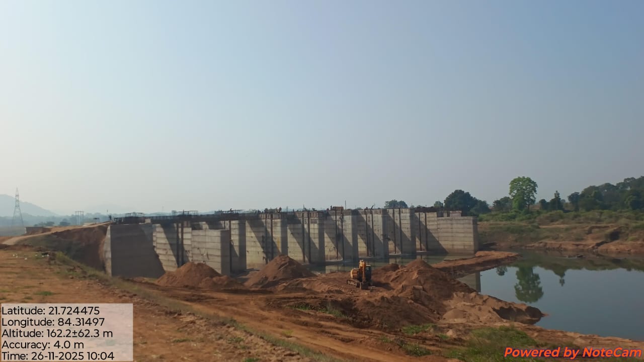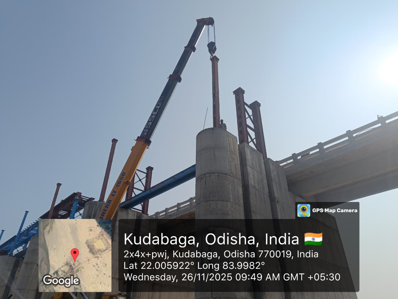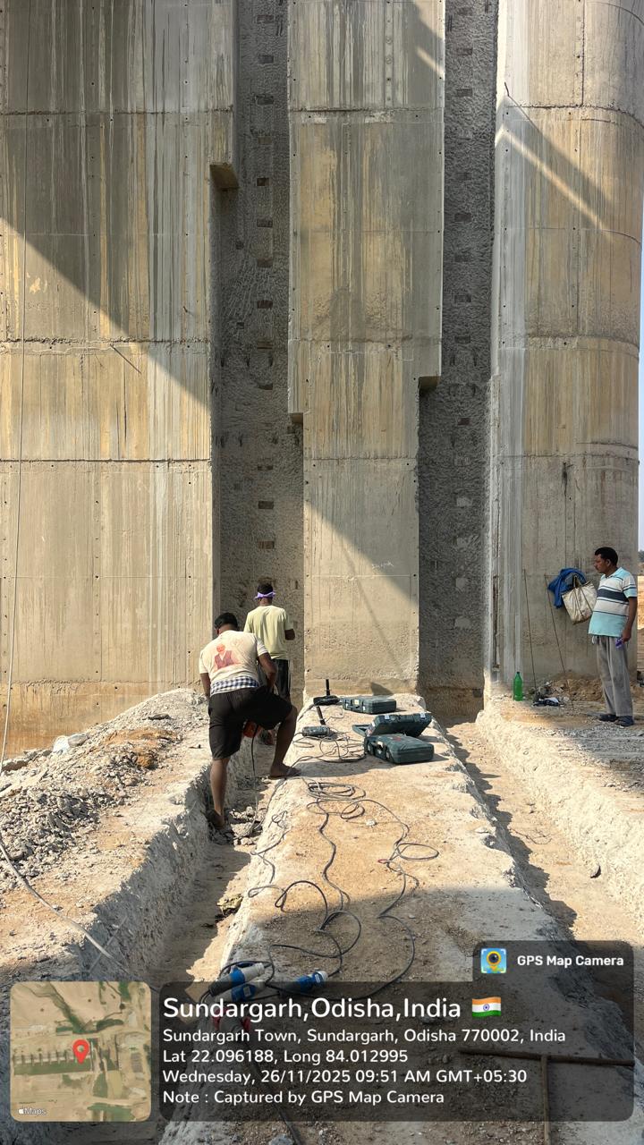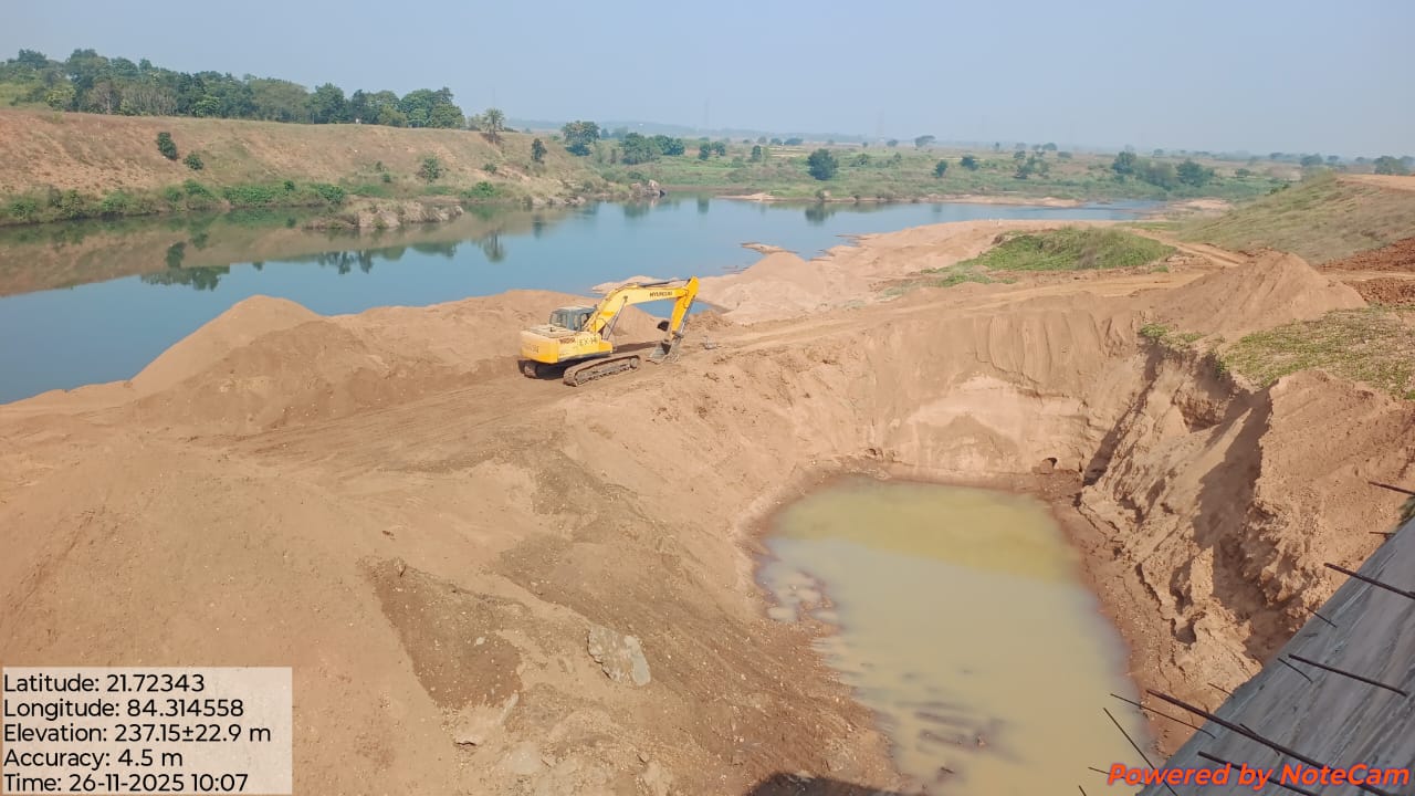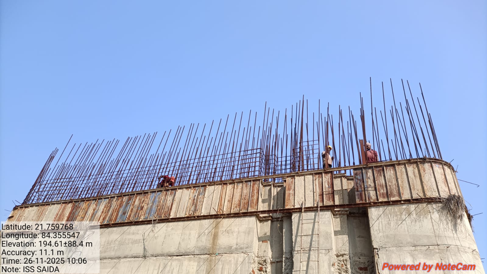 Concrete casting with RCC M25A20 grade at Pier no.12/mid. right divide wall for 7th lift at U/S side and 8th lift at D/S side from RL-241.60m to RL-242.95m is in progress through concrete pump in presence of JE,KID, Site Engineers of PMC & EPC agency. Slump achieved 87mm on 26.11.2025