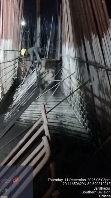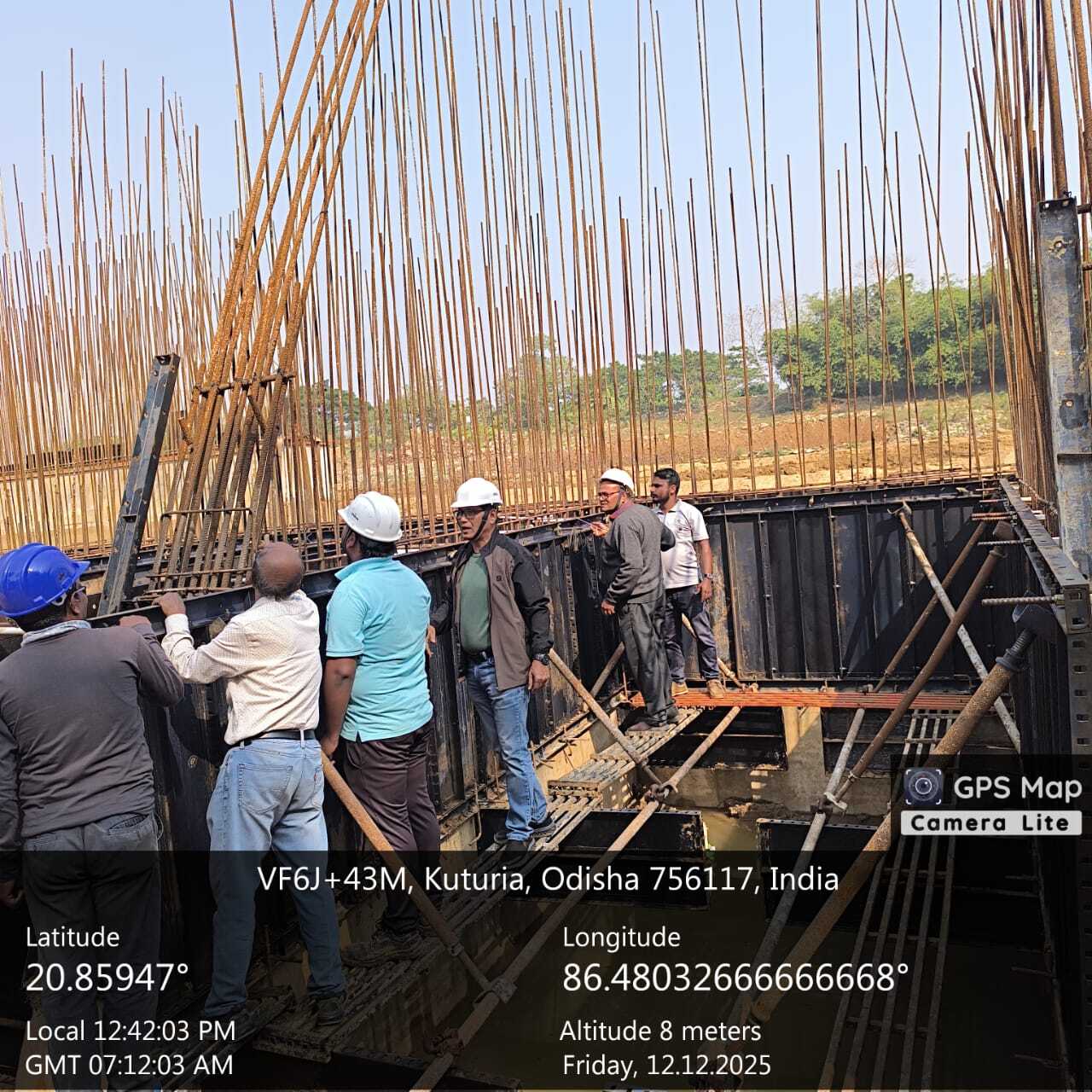 Concrete casting with PCC M15A20 grade at U/S right flared out wall from sec.1-1 to sec.2-2 for 8th lift of 0.6m hight from RL-238.20m to RL-238.80m is in progress in presence of JE,KID, PM EPC agency, Site Engineers of PMC & EPC agency. Slump achieved 78mm on 11.12.2025