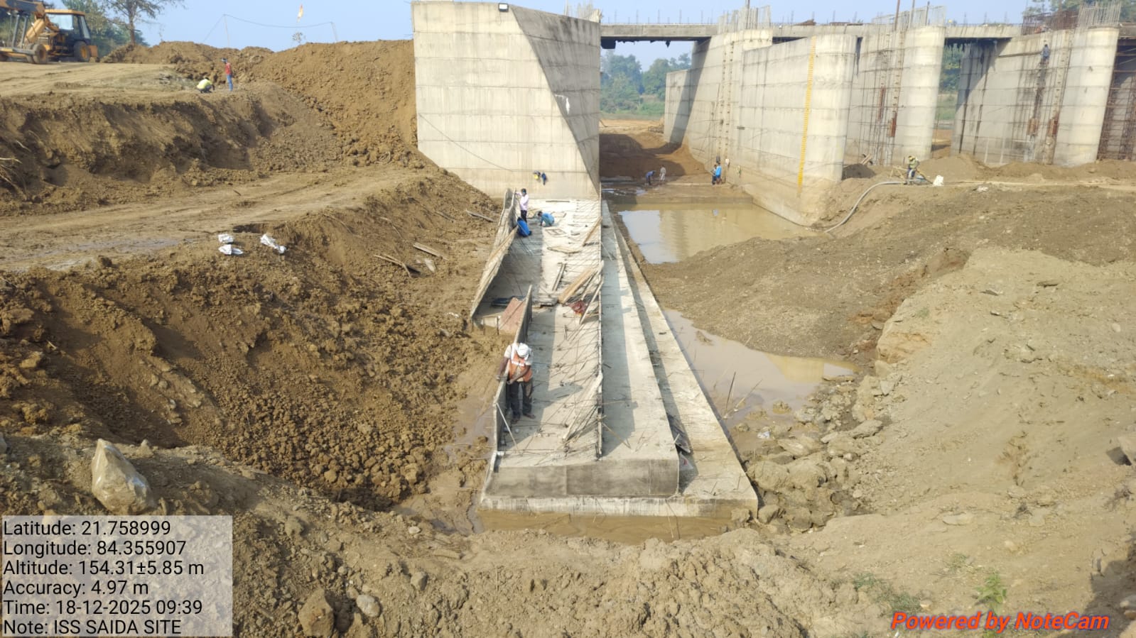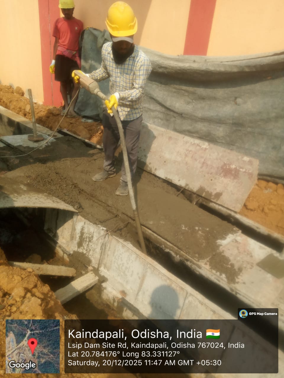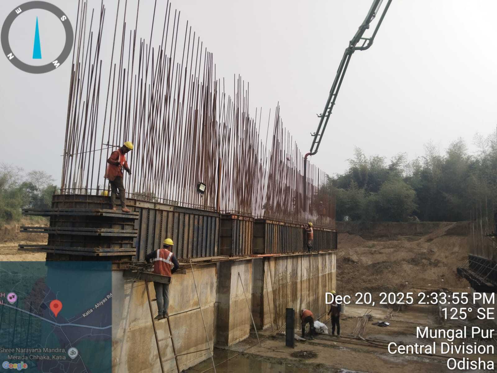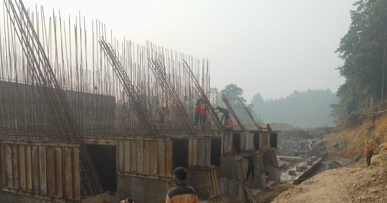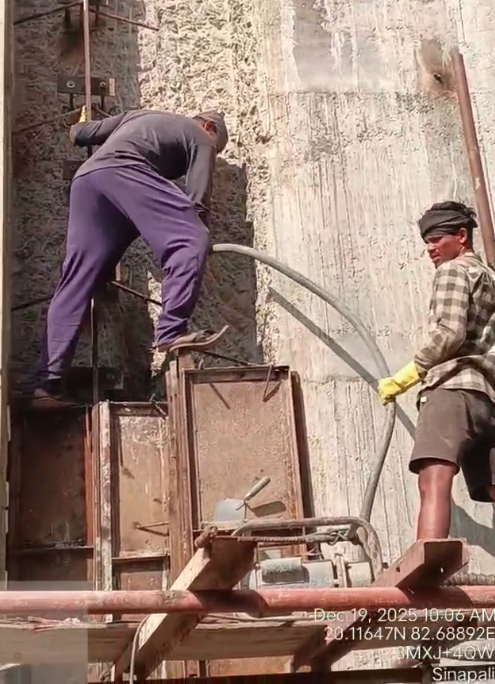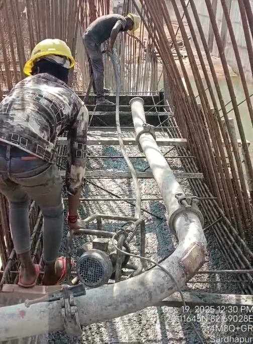 Cast of concrete 2nd lift RCC M25A20 grade at right side u/s wing wall including 2nos CF wall from RL 148.80m to 150.15m is under progress through pump in the presence of Dept JE, site engineer of PMC and agency at site. Slump achieved 87mm on 19.12.2025