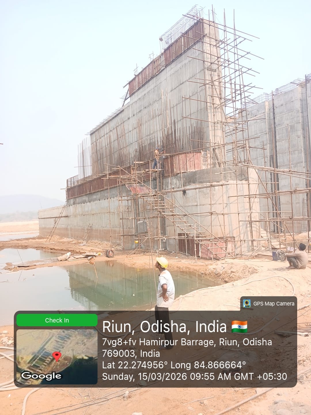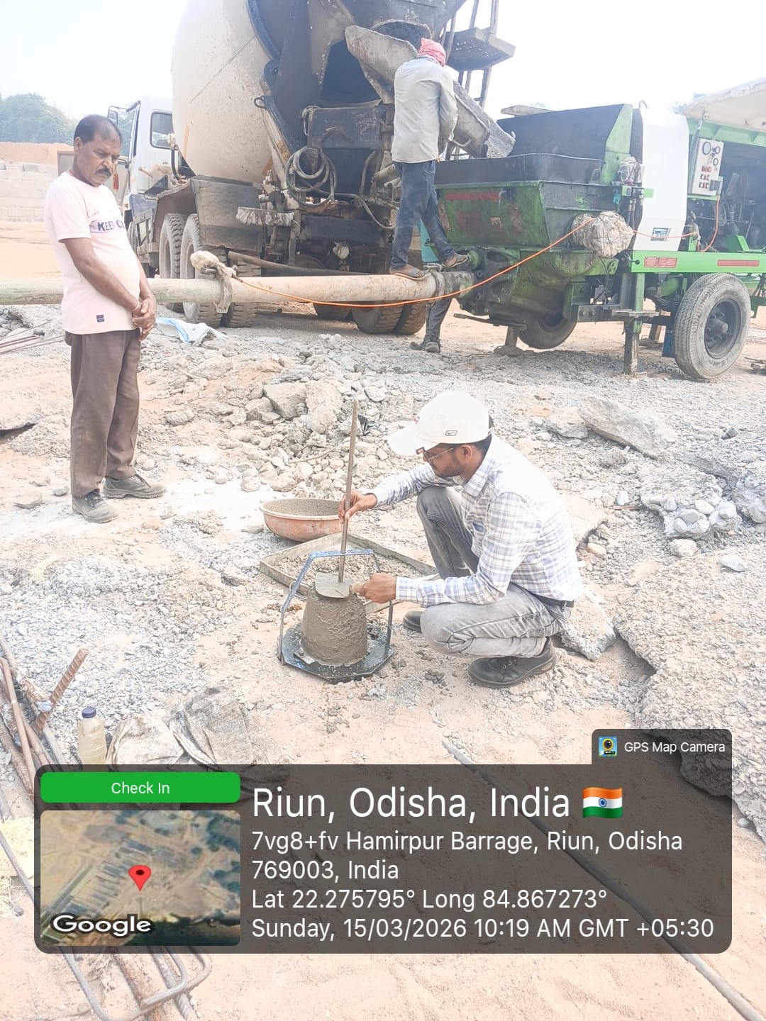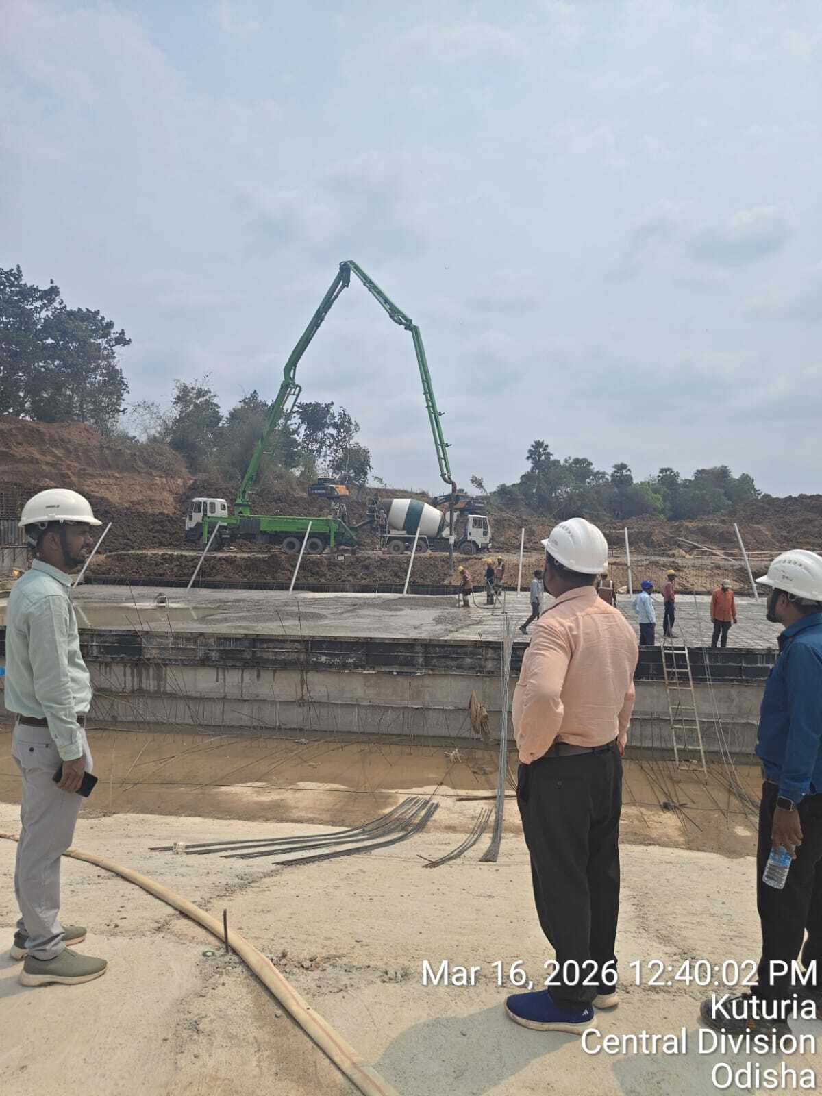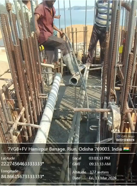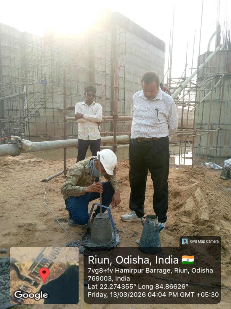 Concrete casting with RCC M35A20 grade for 2nd stage concrete at pier no.1& left abutment for 2nd lift of undersluice bay-1 is in progress in presence of PM EPC agency, Site Engineers of PMC & EPC agency. The slump test value is 89mm on 14.03.2026