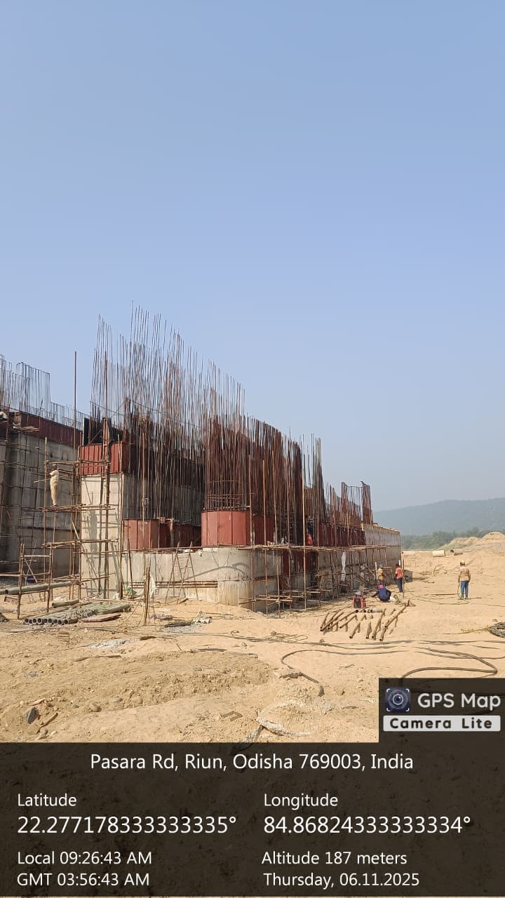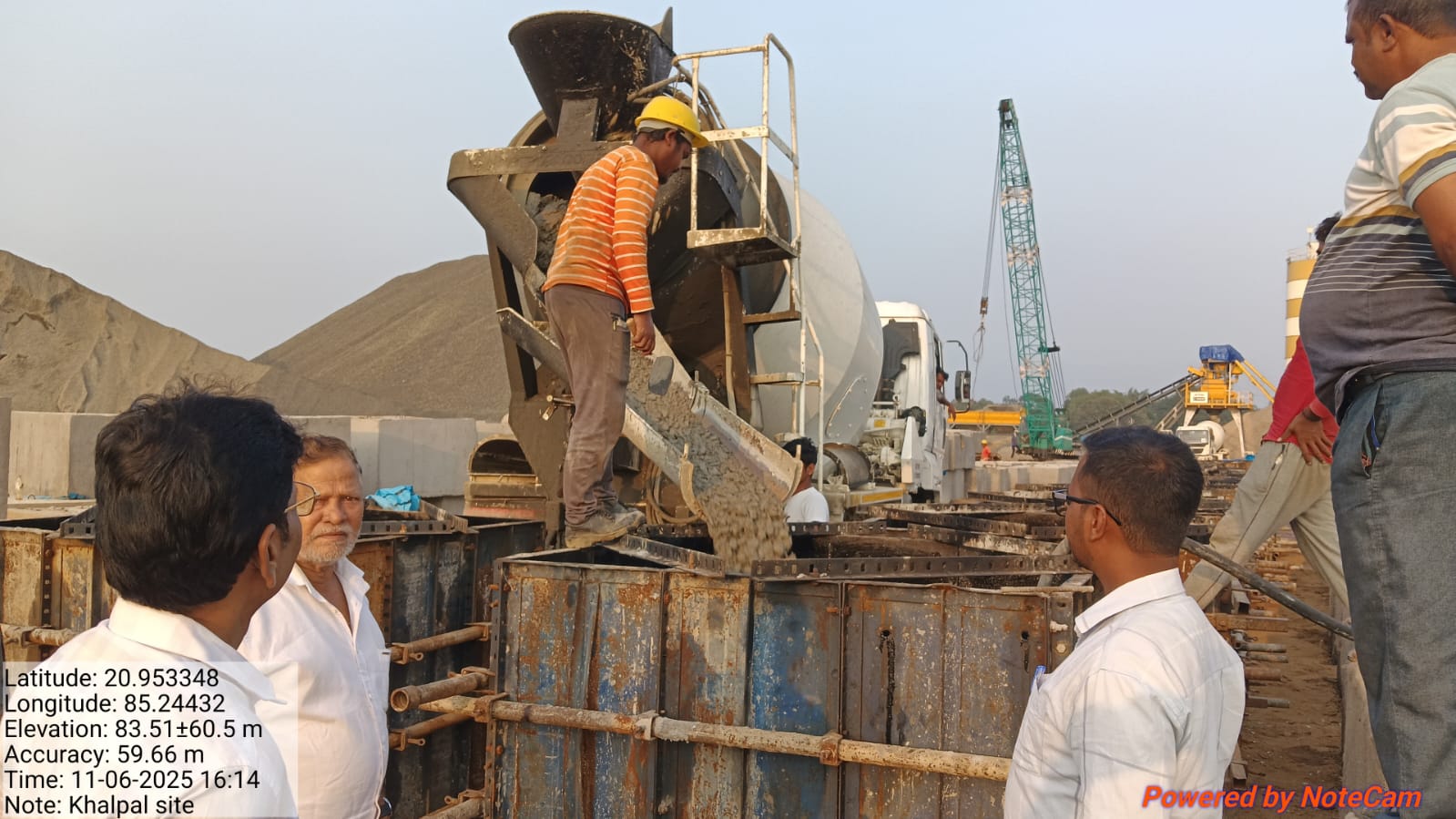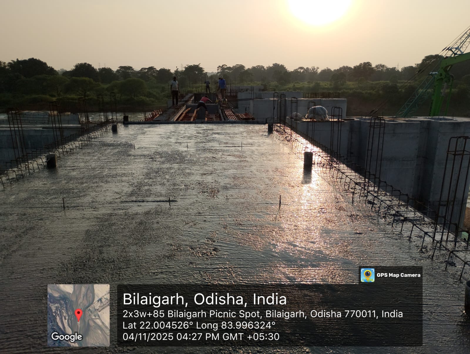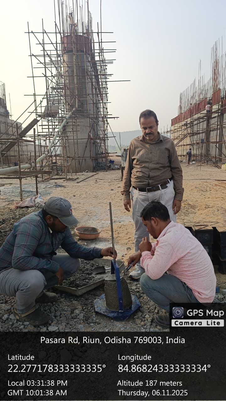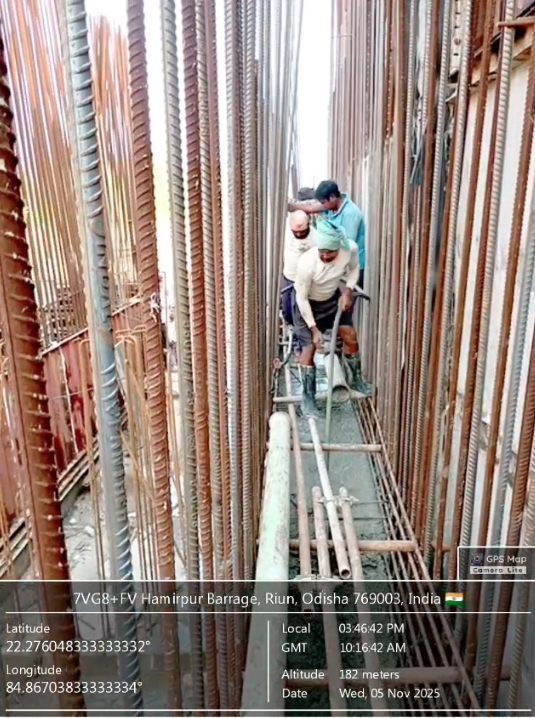 Concrete casting with PCC M15A20 grade at D/S left flared out wall from sec-1-1 to sec-2-2 for 5th lift from RL-236.40m to RL-237.00m is in progress through concrete pump in presence of JE,KID, DTL,Tel basin, Bhawanipatna,QAQC expert,Sr. site engineer,SHEE,HME of PMC, PM n Site Engineers of PMC & EPC agency. Slump achieved 85mm on 05.11.2025