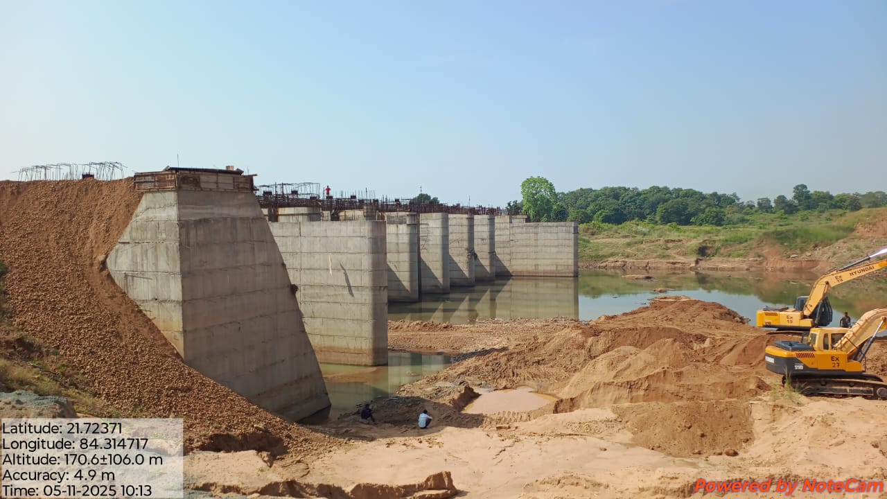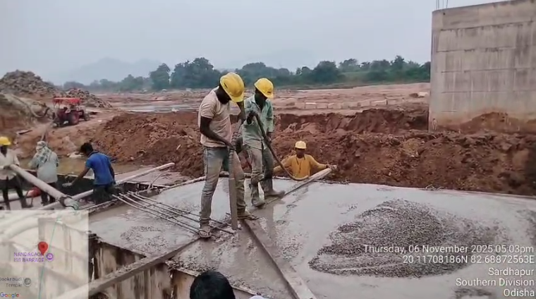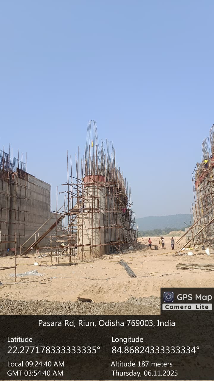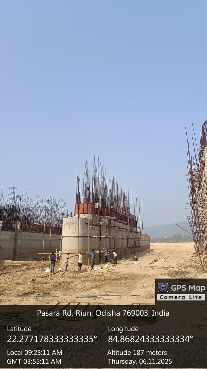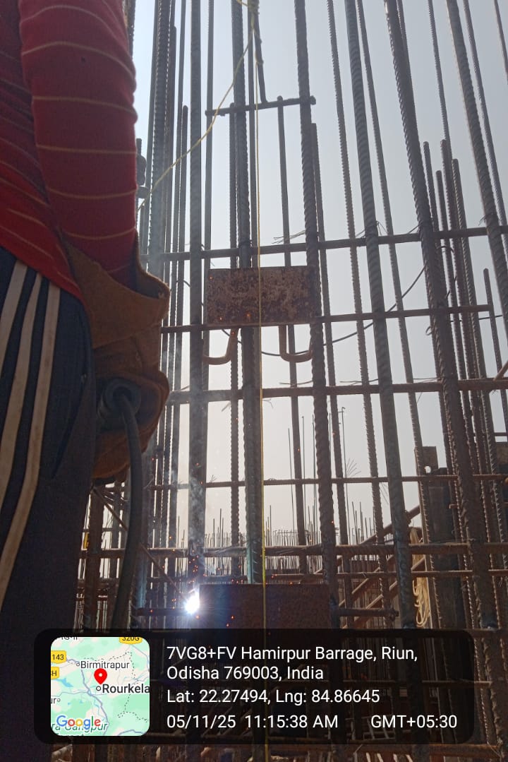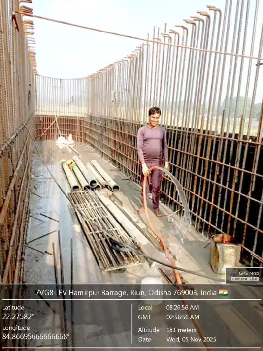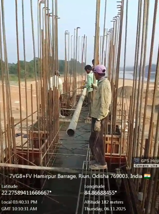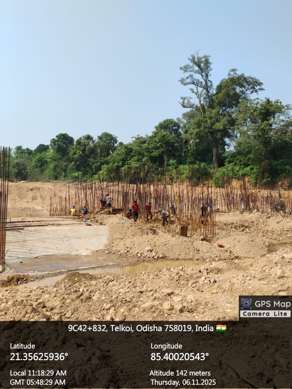 Concrete casting with PCC M15A20 grade at D/S left flared out wall from sec-1-1 to sec-2-2 for 5th lift from RL-236.40m to RL-237.00m is in progress through concrete pump in presence of JE,KID, DTL,Tel basin, Bhawanipatna,QAQC expert,Sr. site engineer,SHEE,HME of PMC, PM n Site Engineers of PMC & EPC agency. Slump achieved 85mm on 05.11.2025