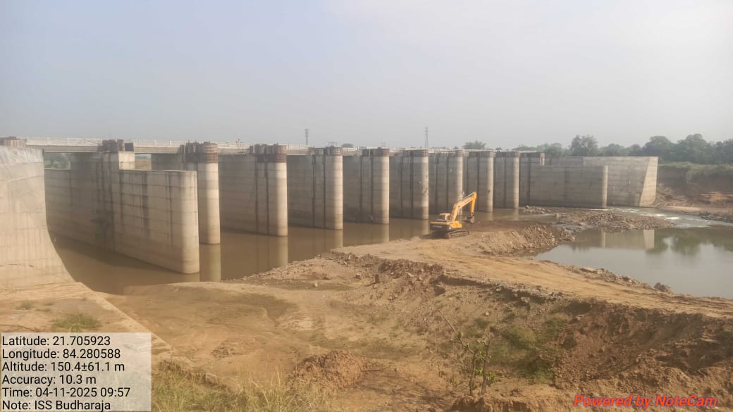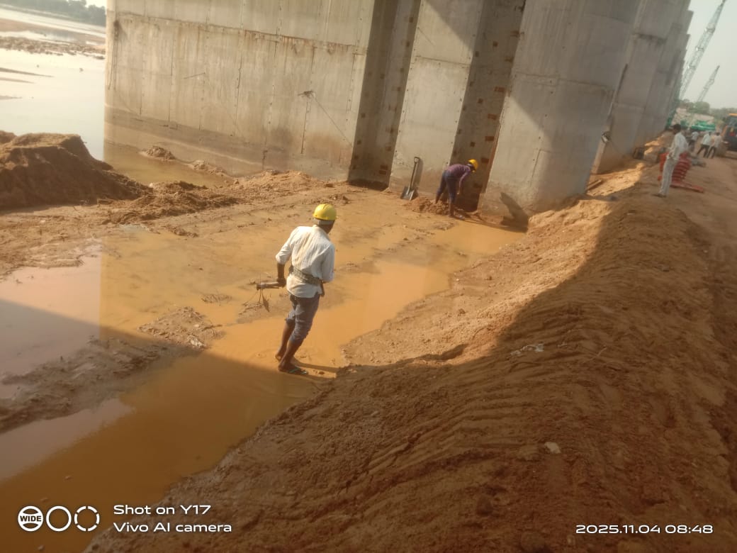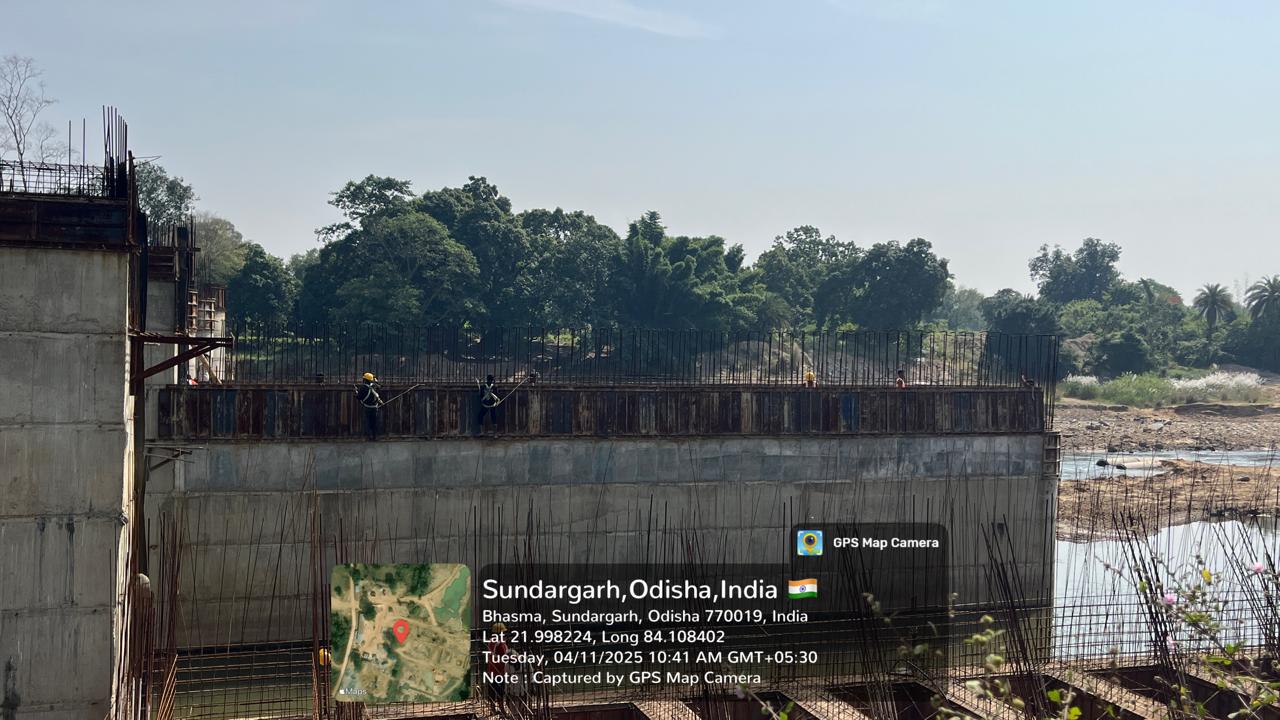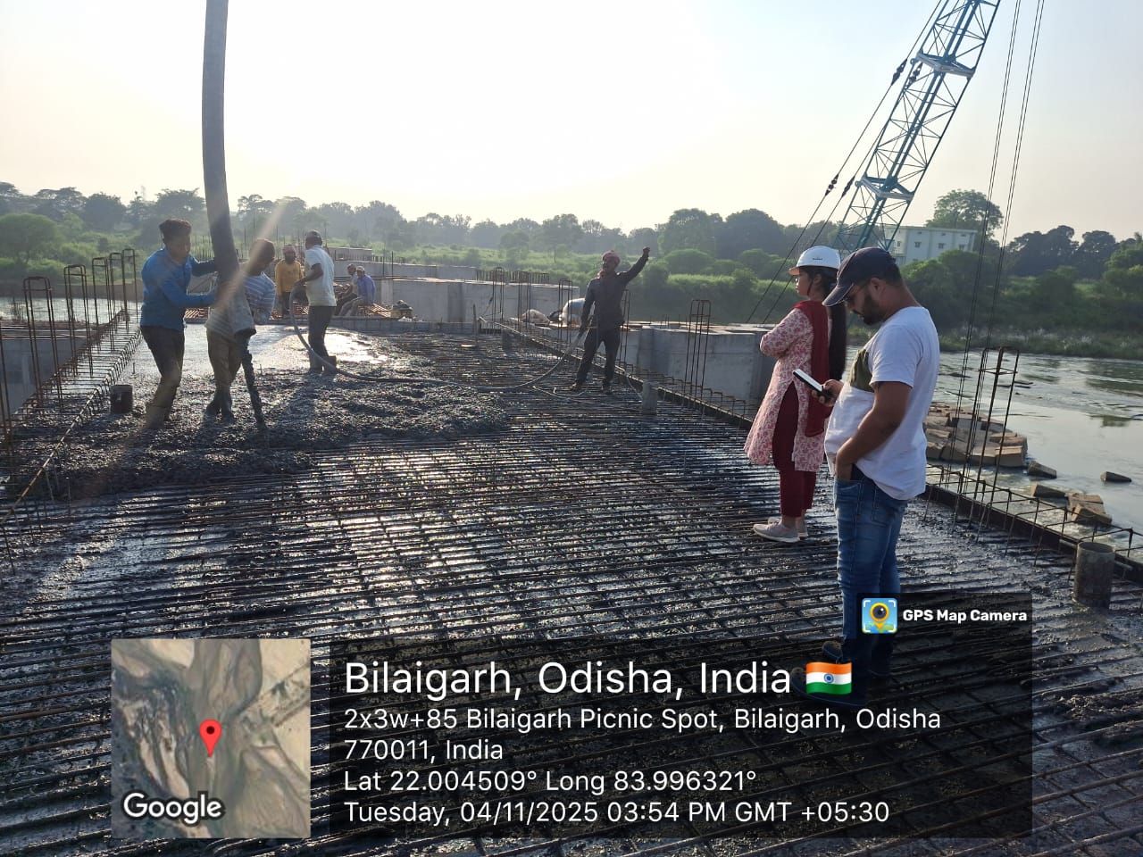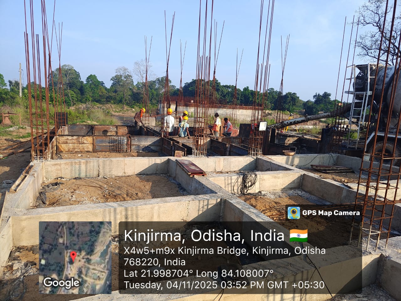 Concrete casting with PCC M15A20 grade at D/S left flared out wall from sec-1-1 to sec-2-2 for 5th lift from RL-236.40m to RL-237.00m is in progress through concrete pump in presence of JE,KID, DTL,Tel basin, Bhawanipatna,QAQC expert,Sr. site engineer,SHEE,HME of PMC, PM n Site Engineers of PMC & EPC agency. Slump achieved 85mm on 05.11.2025
