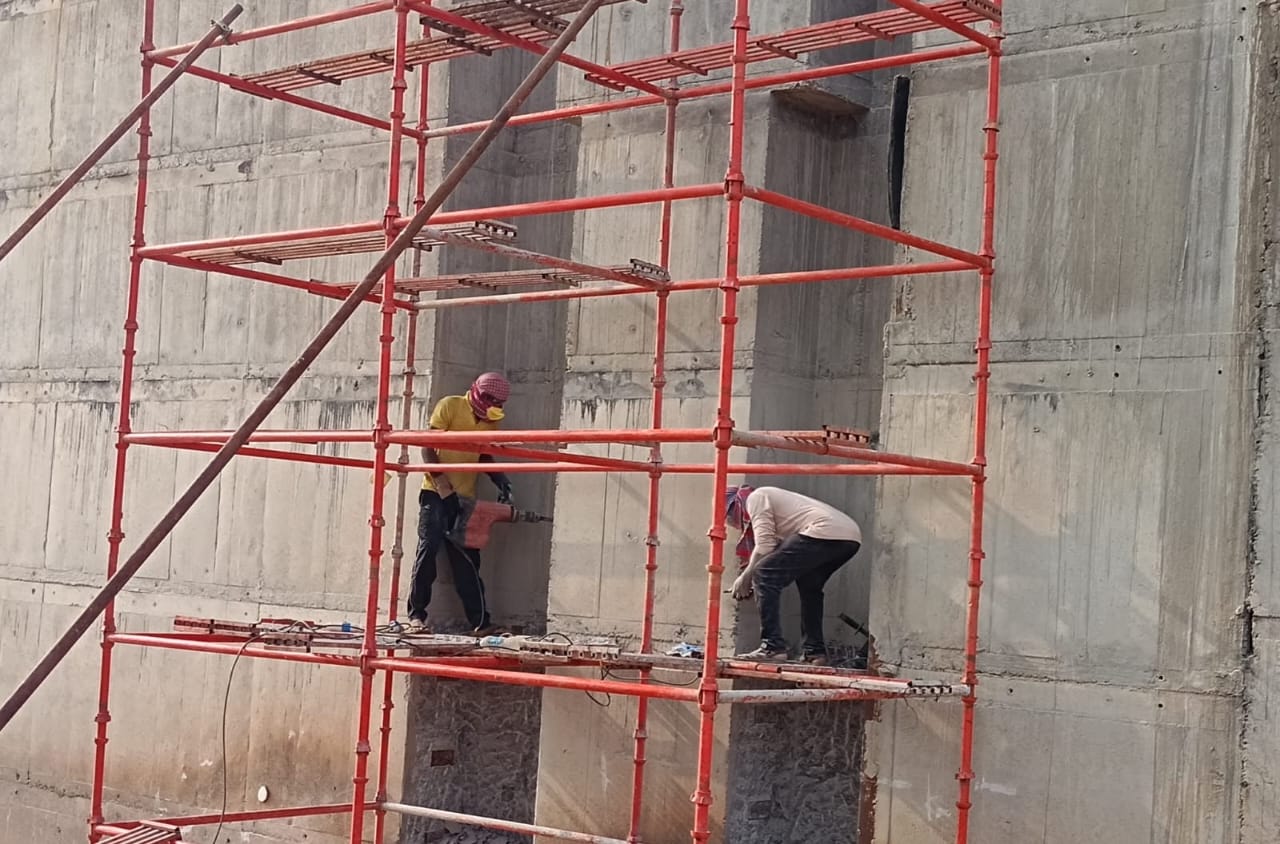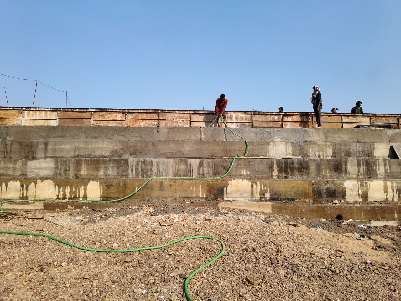 Removal of rust from the reinforcement of left barrage bay piers using sand blasting.