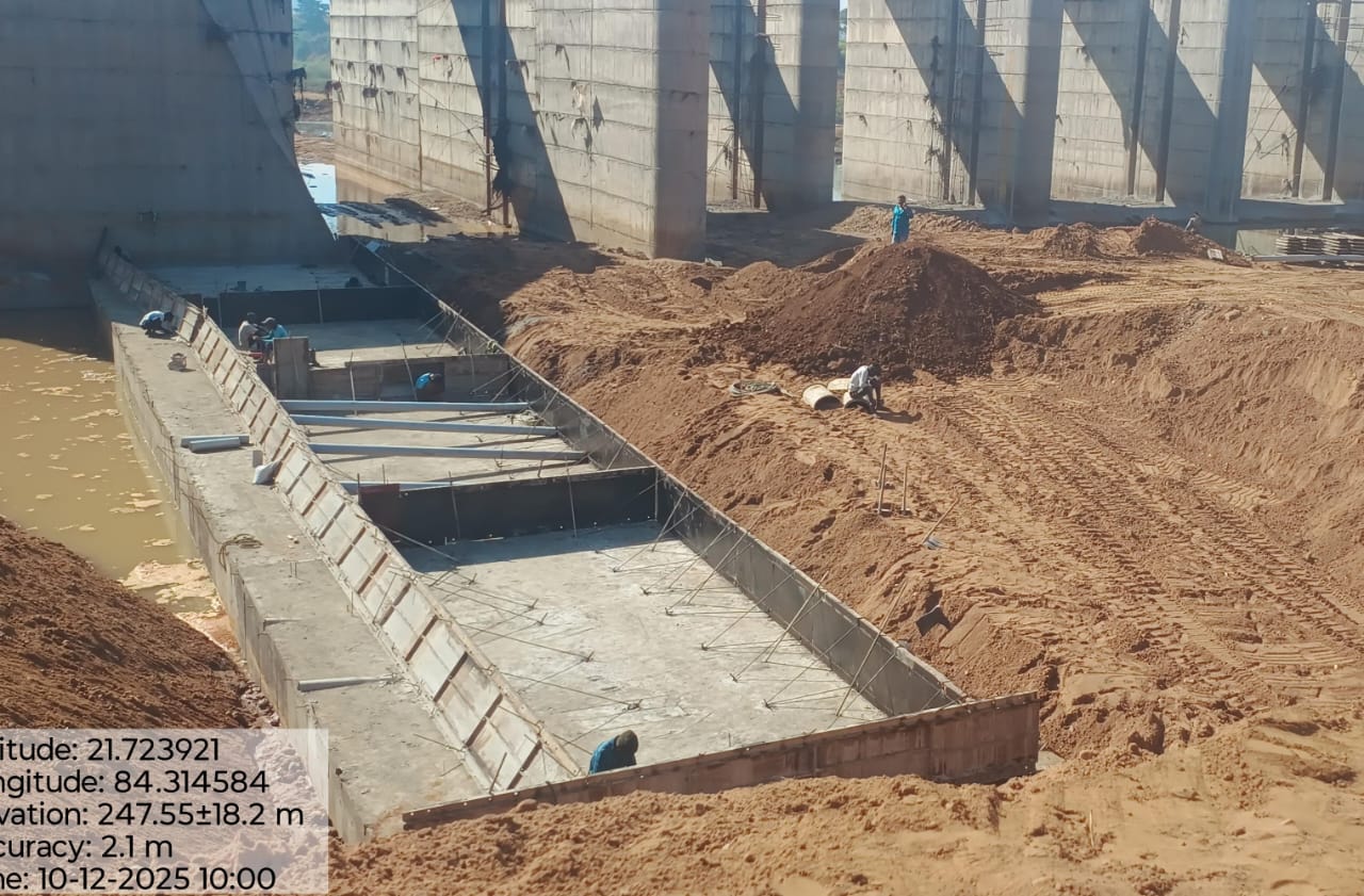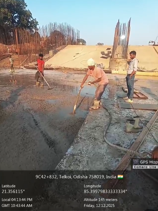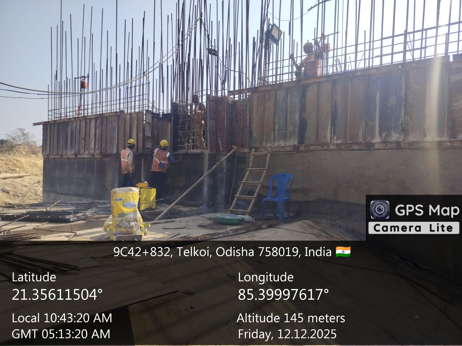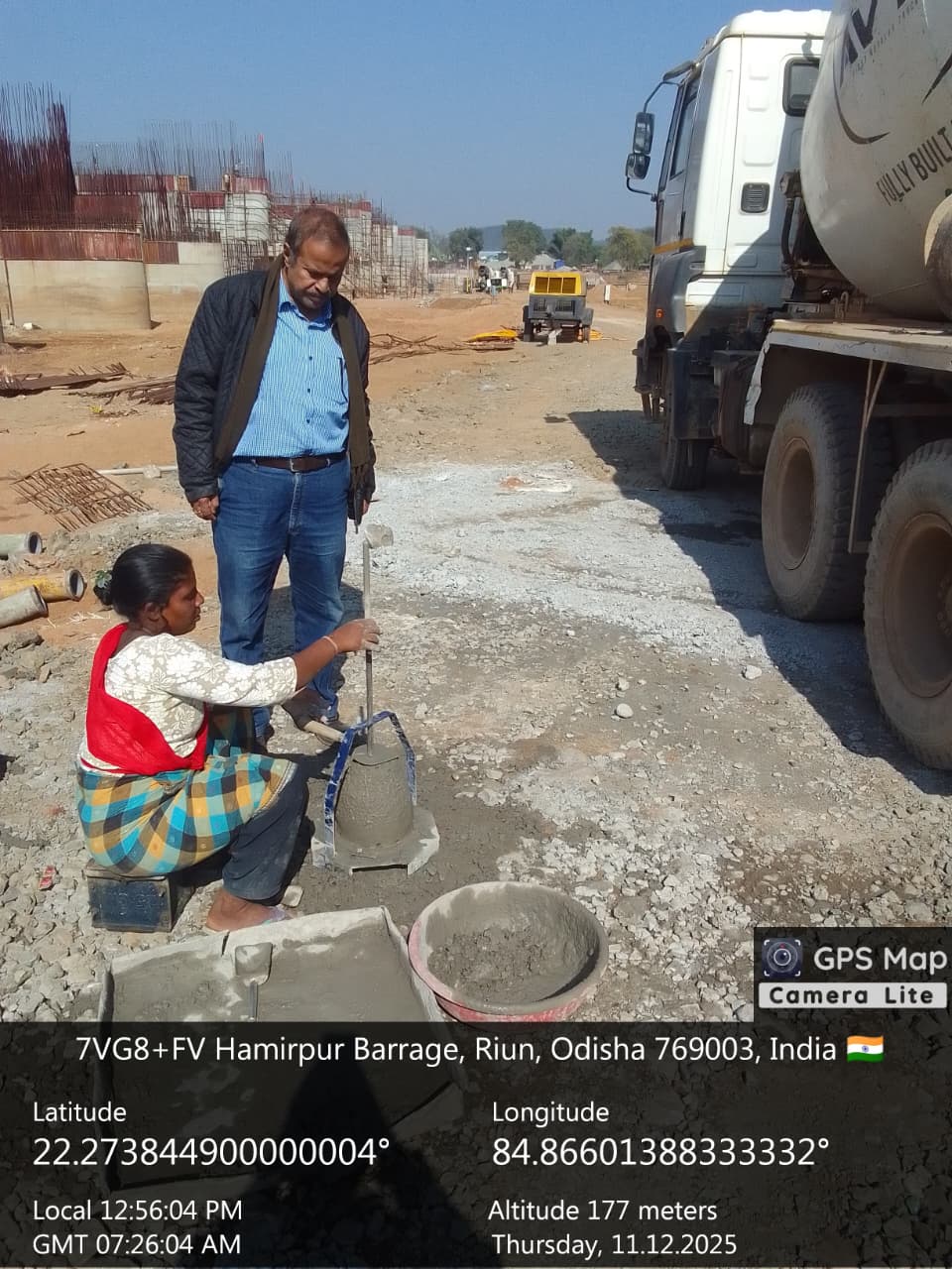 Concrete casting with PCC M20A20 grade for 1no. of CC block of size 5.5x1.5x0.6m at U/S right flared out wall from sec.2-2 to sec.4-4 for 4th lift of 0.6m hight from RL-238.20m to RL-238.80m is in progress in presence of JE,KID, PM EPC agency, Site Engineers of PMC & EPC agency. Slump achieved 73mm on 11.12.2025