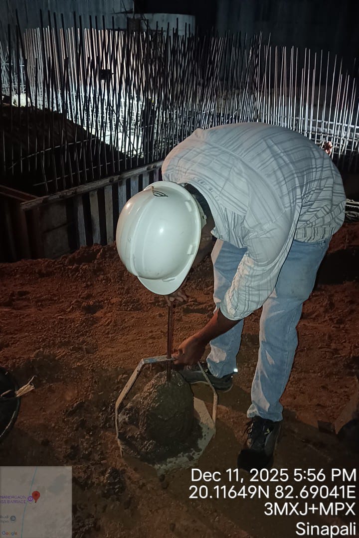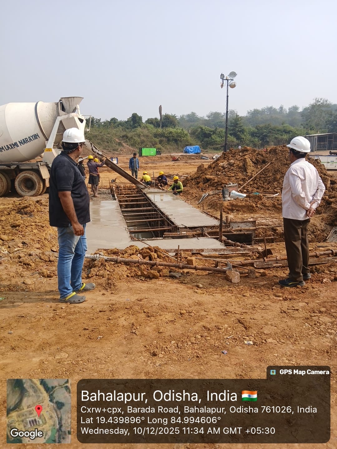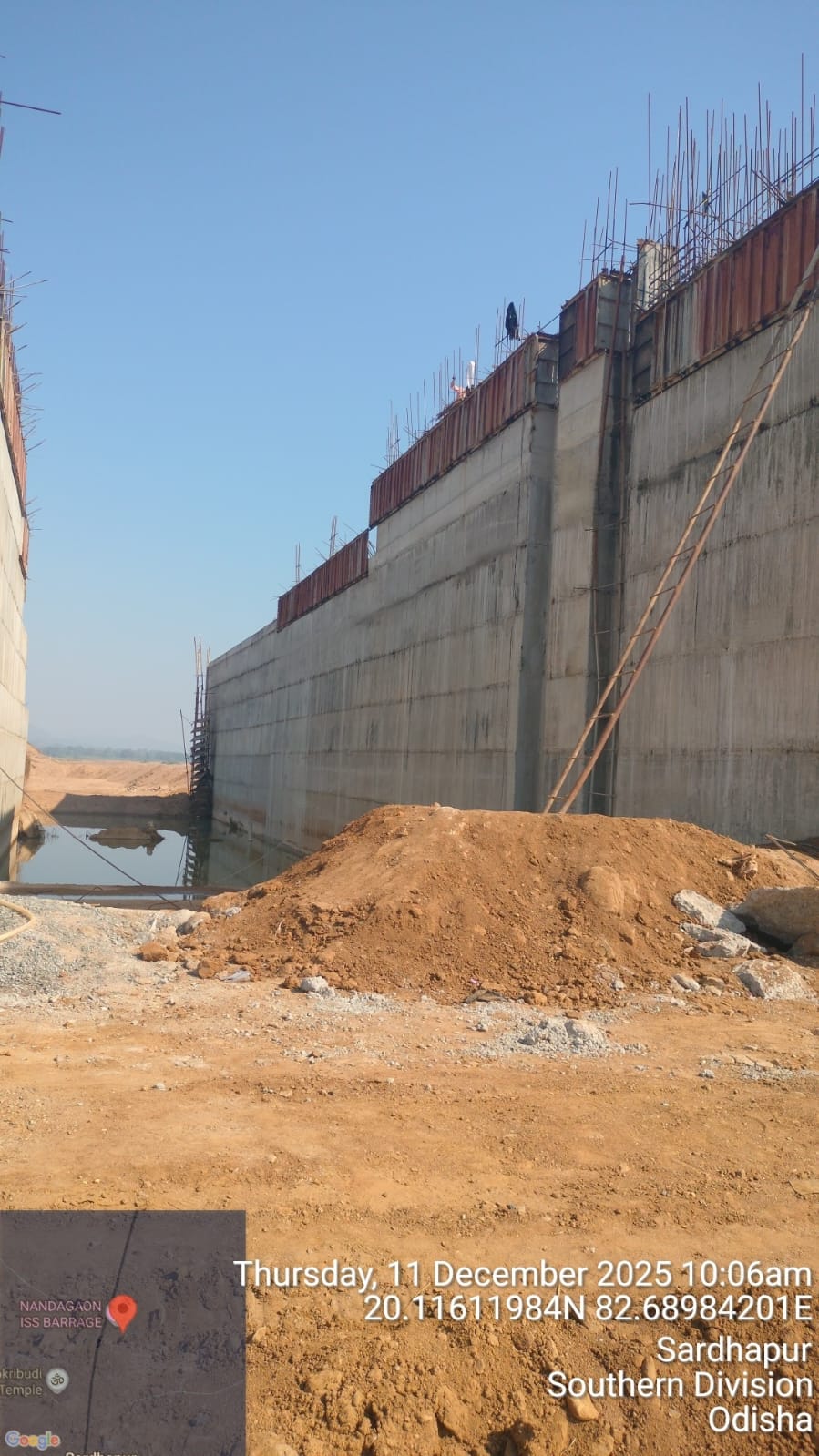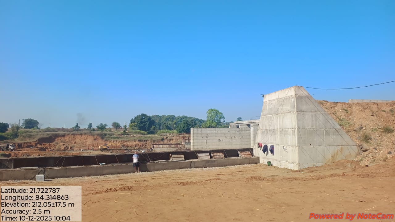 Concrete casting with PCC M20A20 grade for 1no. of CC block of size 5.5x1.5x0.6m at U/S right flared out wall from sec.2-2 to sec.4-4 for 4th lift of 0.6m hight from RL-238.20m to RL-238.80m is in progress in presence of JE,KID, PM EPC agency, Site Engineers of PMC & EPC agency. Slump achieved 73mm on 11.12.2025