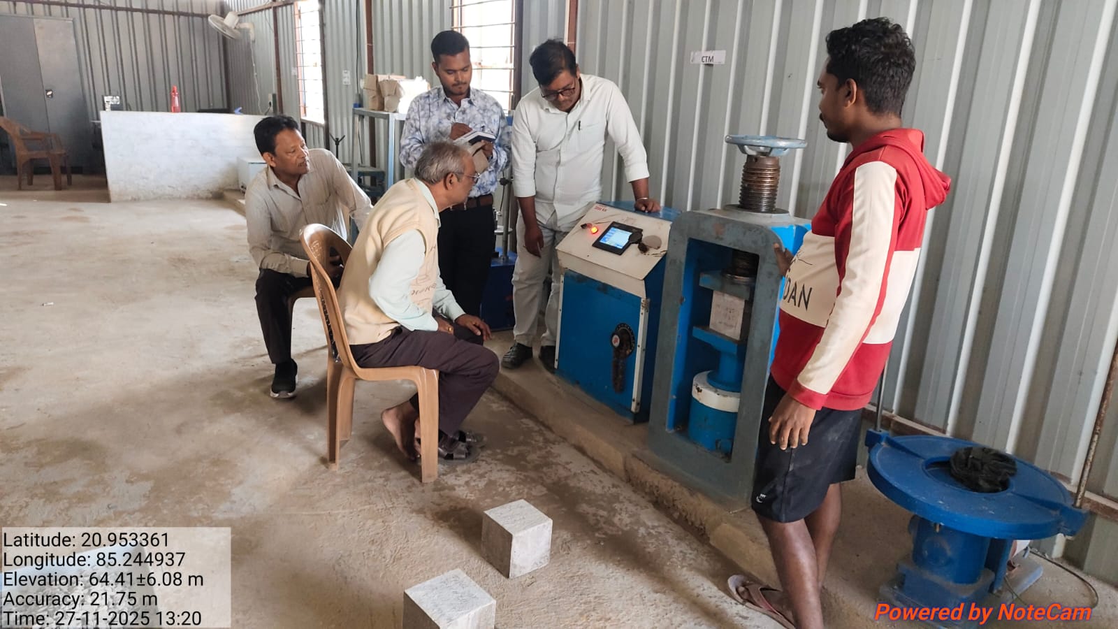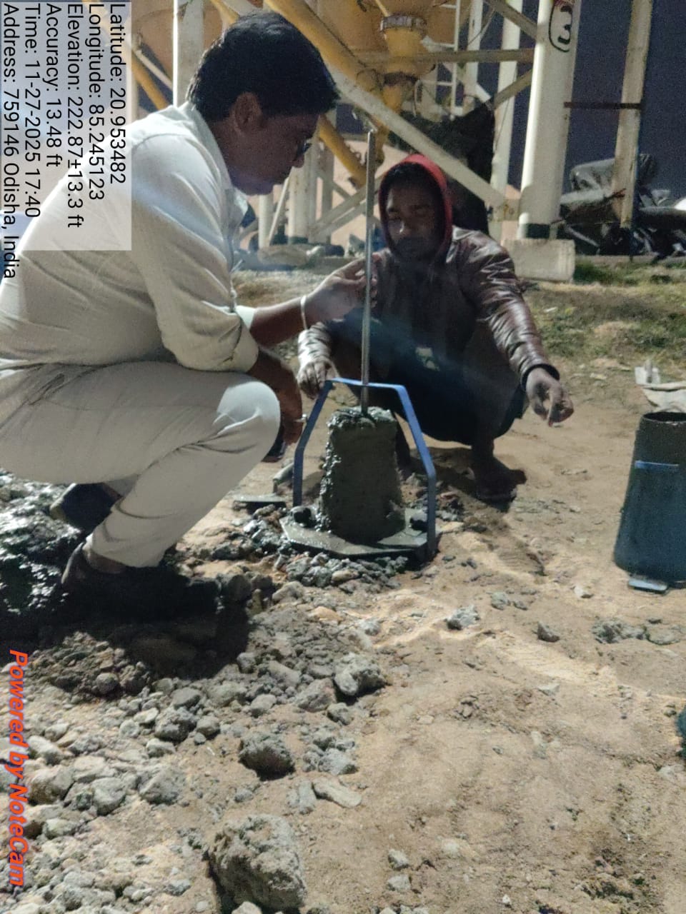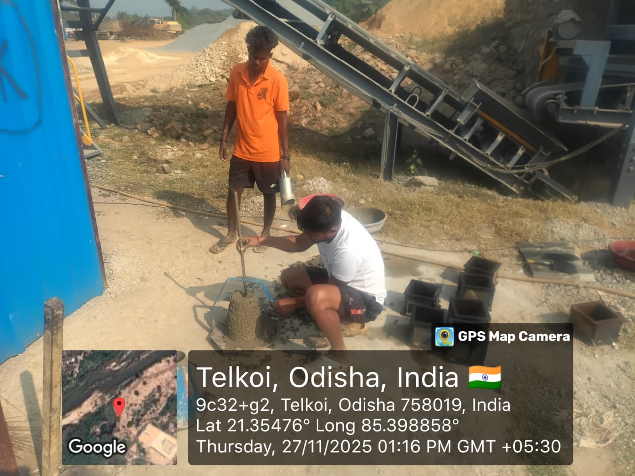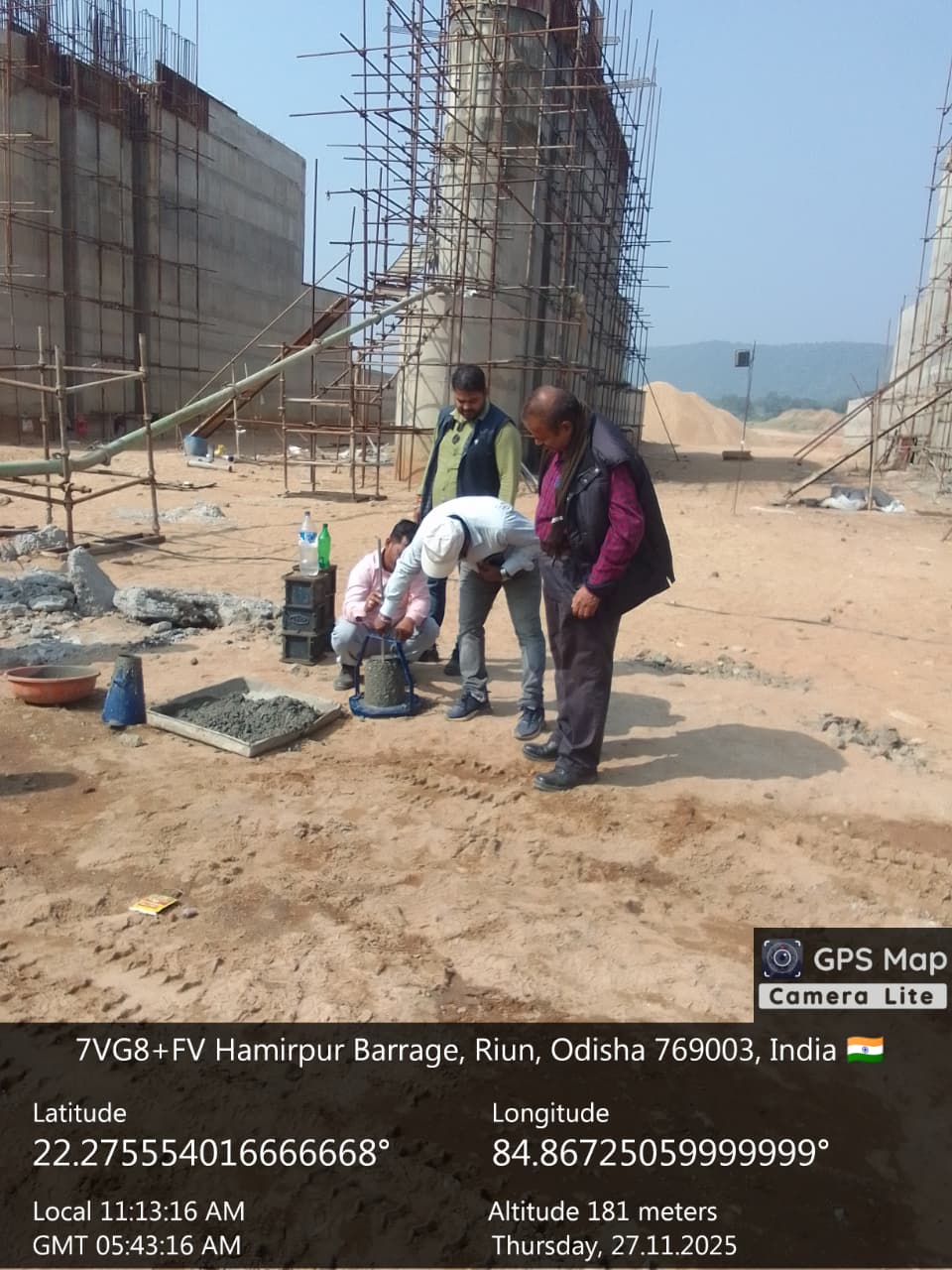 Hirakud Government Lab mix design trial mix conducted at site laboratory of M15A40, 14 days cube (Strength 20.56 N/mm²) in presence of PSS Team.