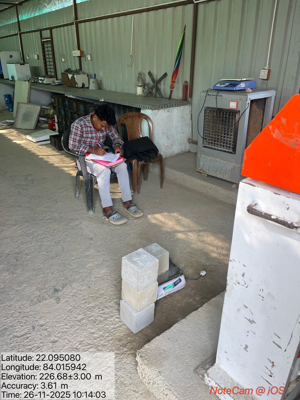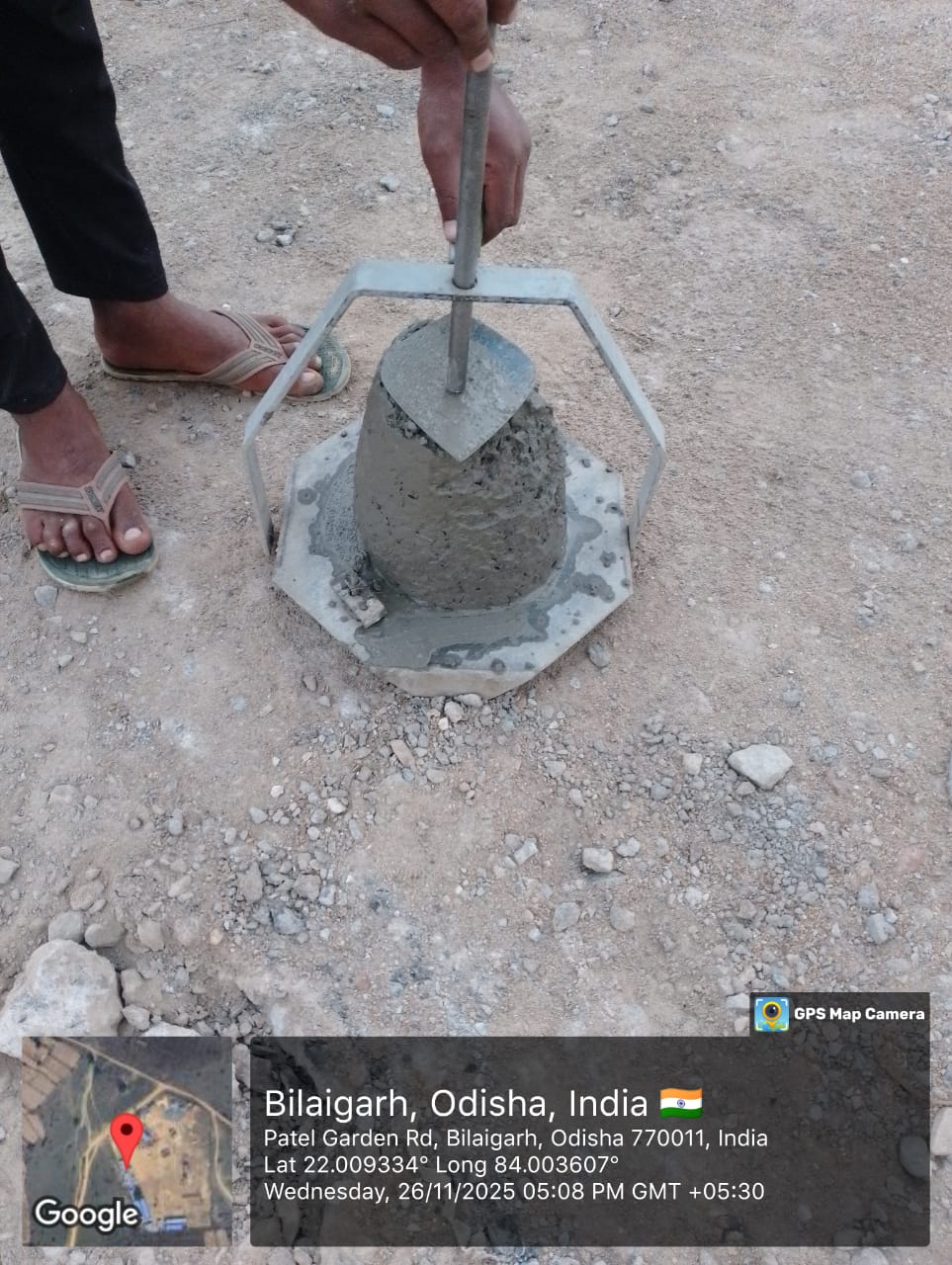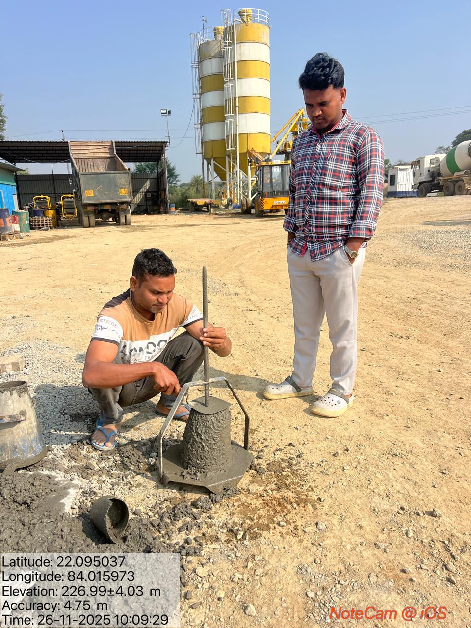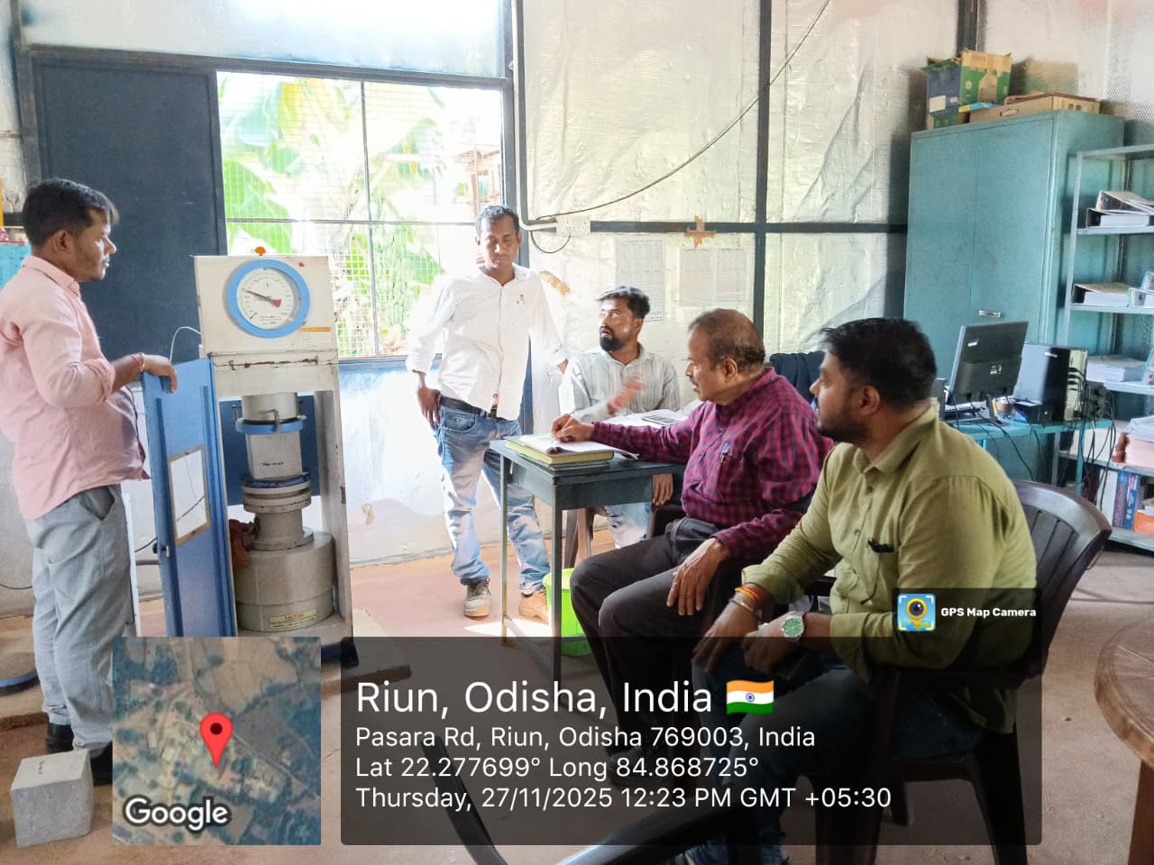 Hirakud Government Lab mix design trial mix conducted at site laboratory of M15A40, 14 days cube (Strength 20.56 N/mm²) in presence of PSS Team.