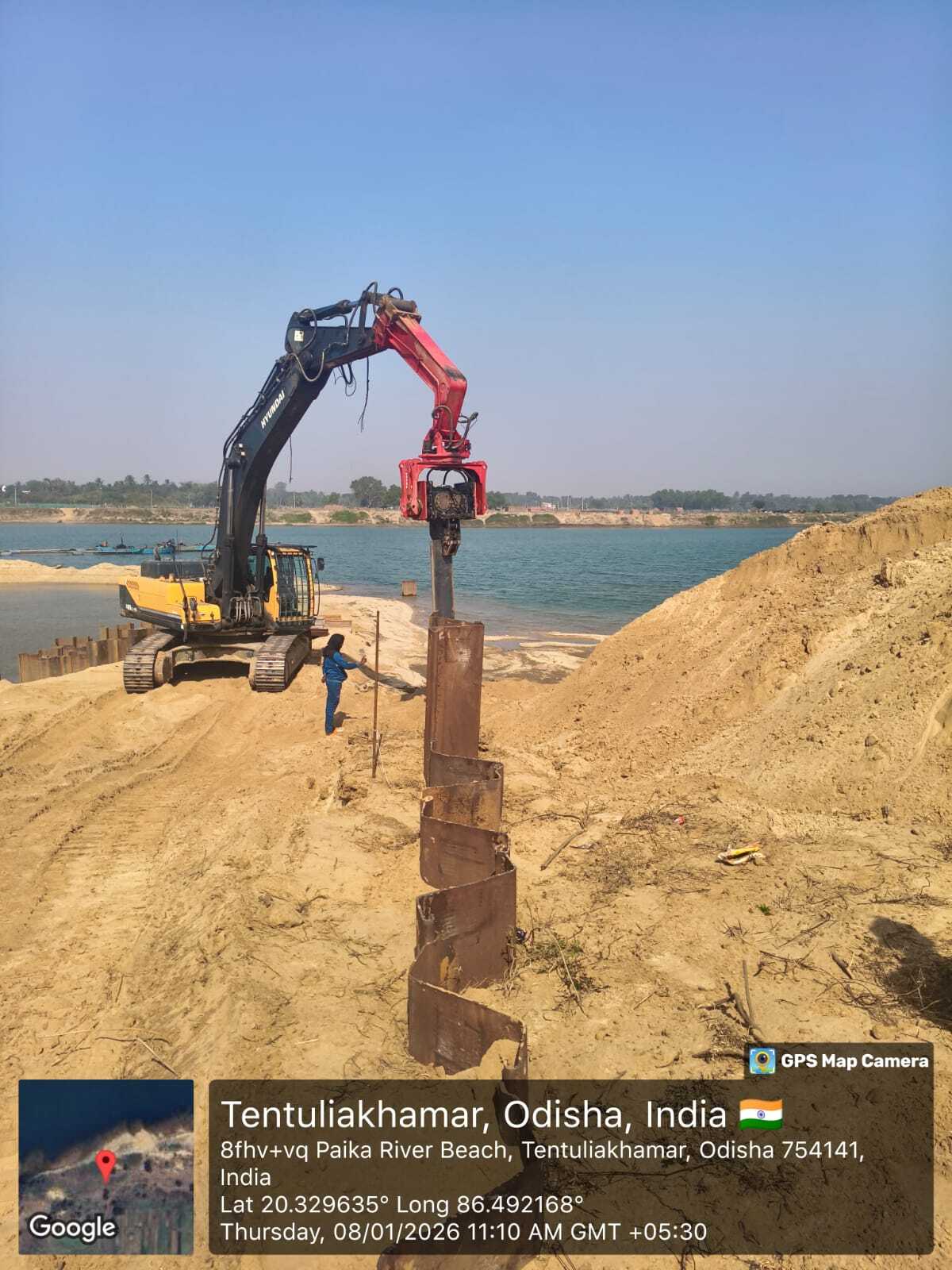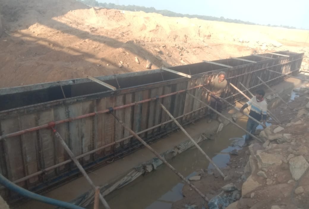 Under sluice bay intermediate 3.65 mtr length sheet pile drive work is going on tikhiri iss projects.-08.01.2026