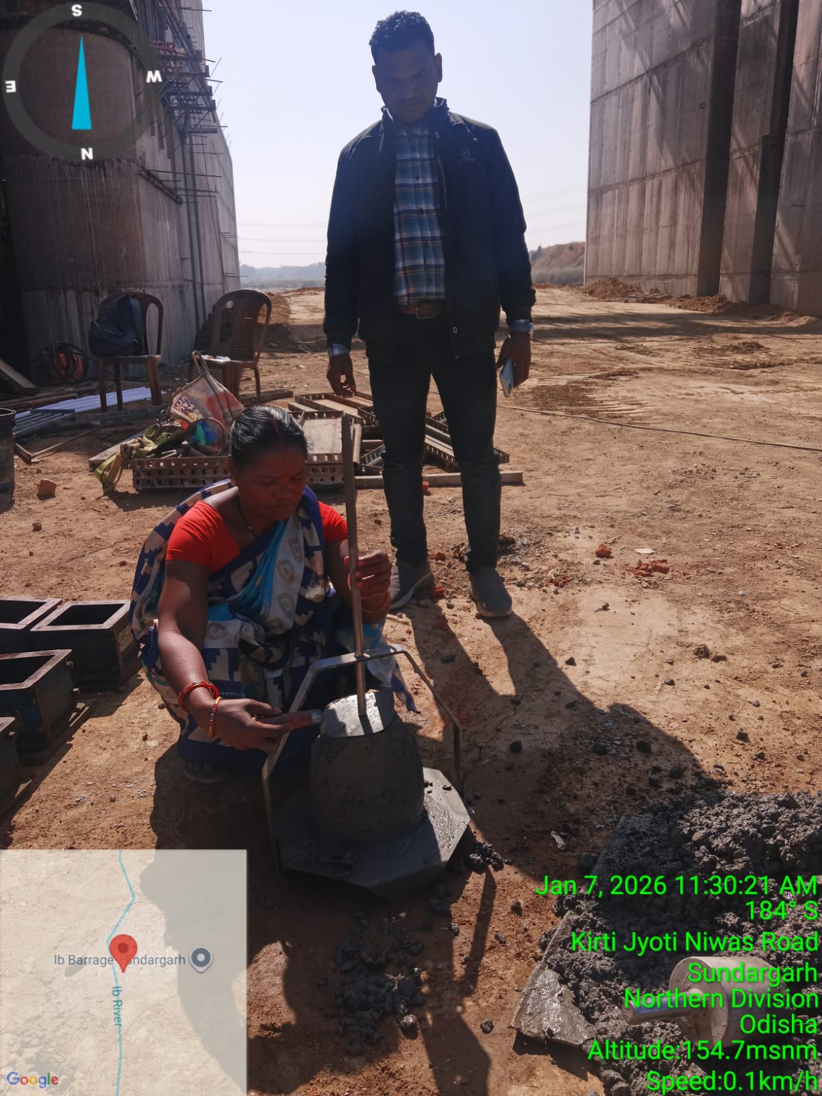 Date of casting 31/12/25 & date of testing (7days) of M25A20 grade concrete at right abutment wall of under sluice Bay area from double CF to CJ to glacier for 1st lift tested in presence of QC Expert, Site Engineer of PMC & Site Engineer of EPC agency the average value of cube strength is 27.55N/mm2 on 07.01.2026