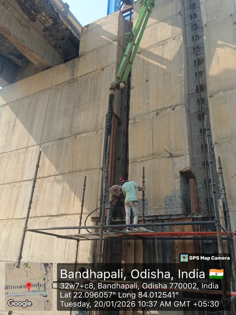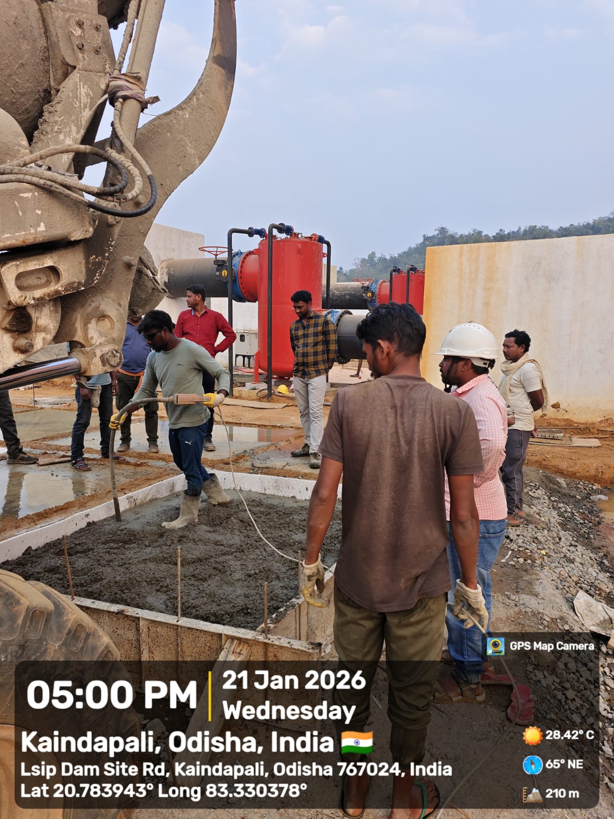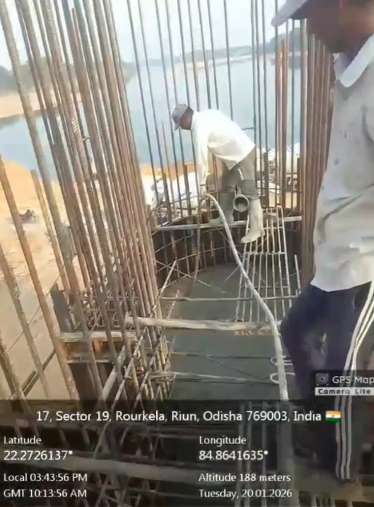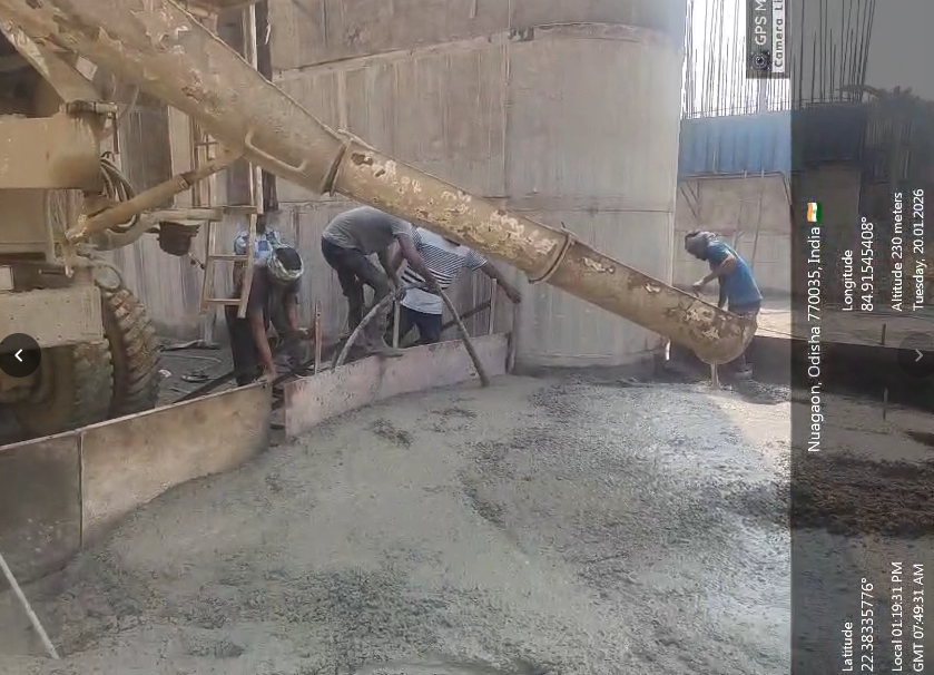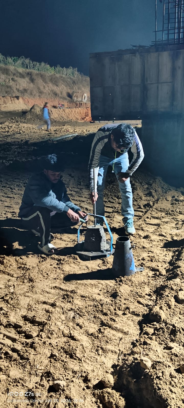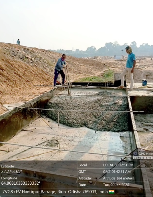 Cast of concrete 4th lift PCC M15A40 grade at right side u/s flared out wall from RL 150.40m to 151.00m is under progress in the presence of Dept JE, site engineer of PMC and agency forman . The slump test value is 68mm on 20.01.2026