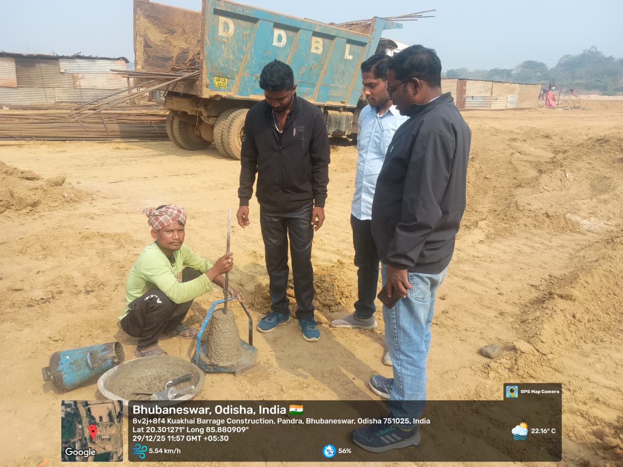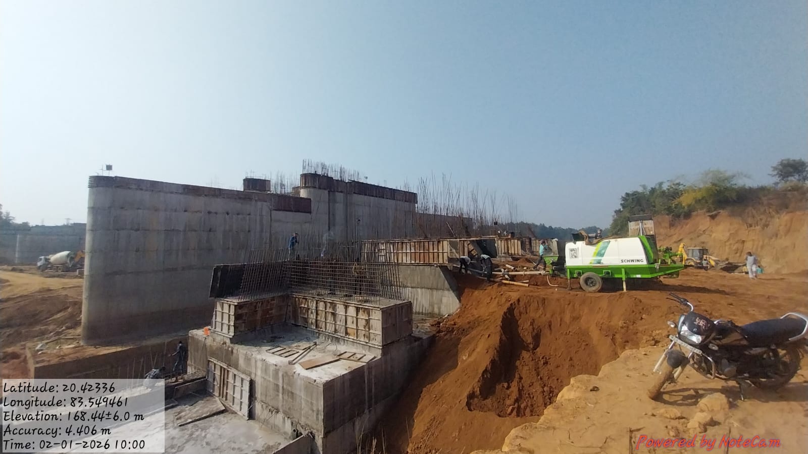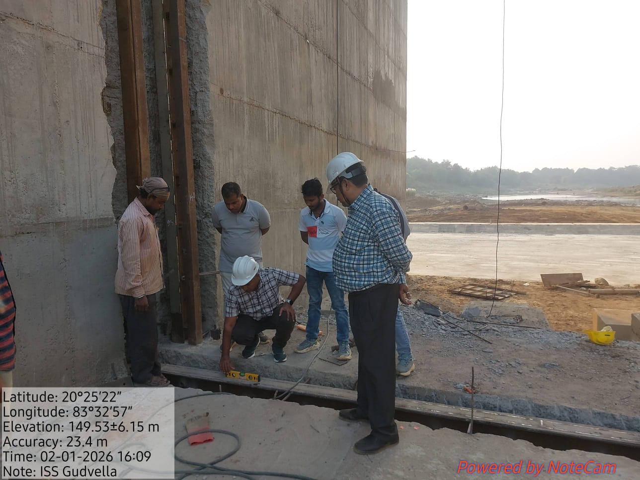 Casting of concrete at right side u/s wing wall of grade M25A20 (5th RCC) from RL 152.85 m to 154.20 m is completed in the presence of Dept JE, PMC & agency site engineers. The slump test value is 87mm on 06.01.2026