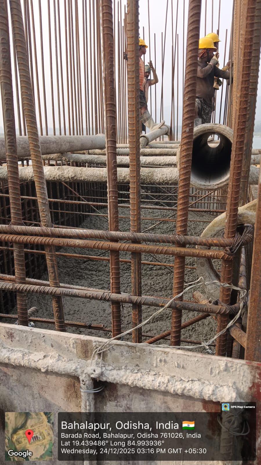 Concrete casting with RCC M25A20 grade at Pier no.11 for 10th lift at U/S side and 11th lift at D/S side from RL-244.50m to RL-245.10m (Pier cap bottom) is in progress through concrete pump in presence of PM, EPC agency, Site Engineers of PMC & EPC agency. Slump achieved 87mm on 28.12.2025