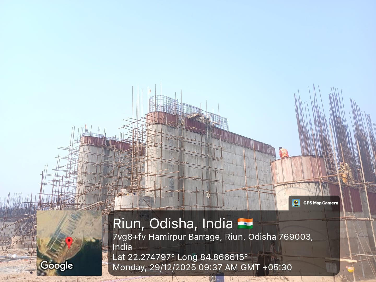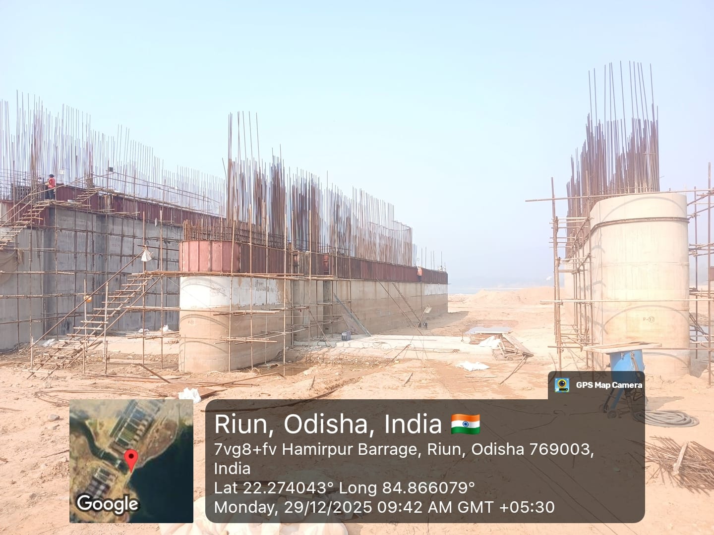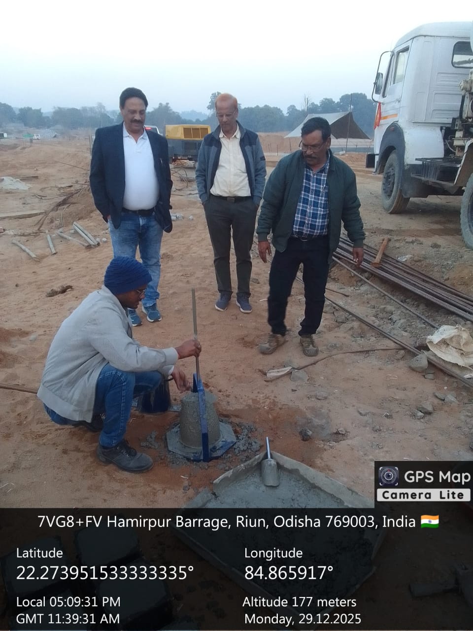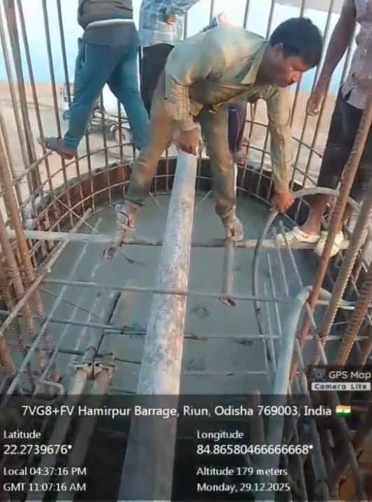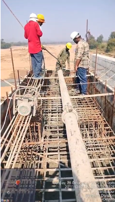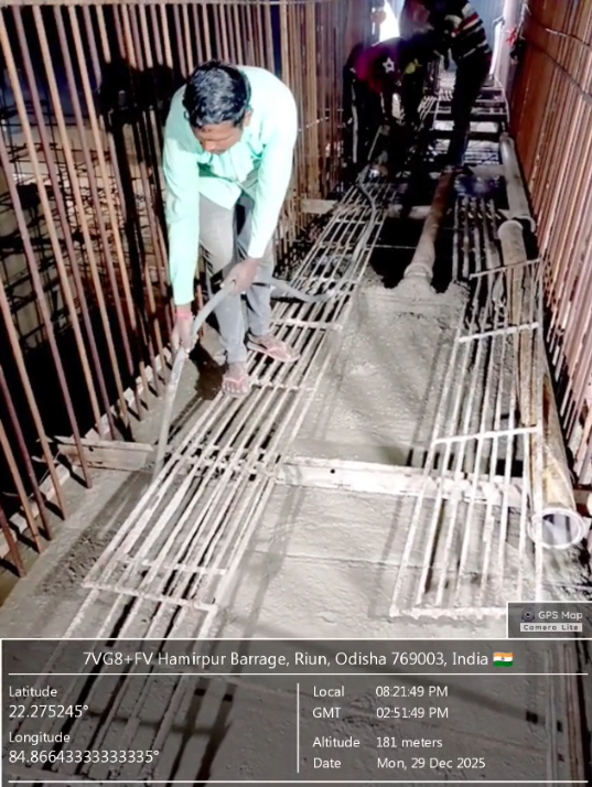 Concrete casting with M35A20 grade of stoplog & main gate grooves sill beam at bay-8 (barrage bay no.6) block-2 is in progress in presence of JE,KID, PM EPC agency, Site Engineers of PMC & EPC agency. Slump achieved 75mm on 27.12.2025