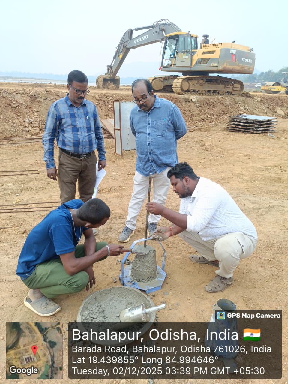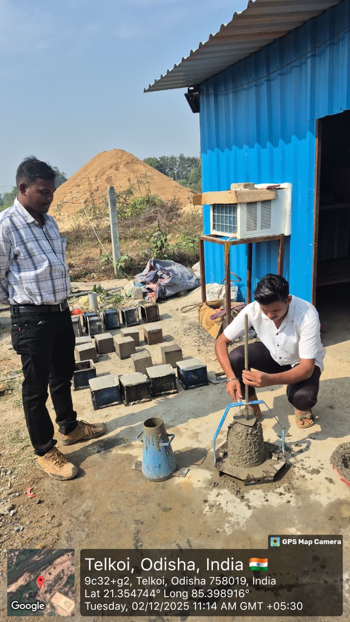Hirakud Government Lab mix design trial mix conducted at site laboratory of M25A20, 28 days cube (Strength 46.49 N/mm²) in presence of PSS Team.