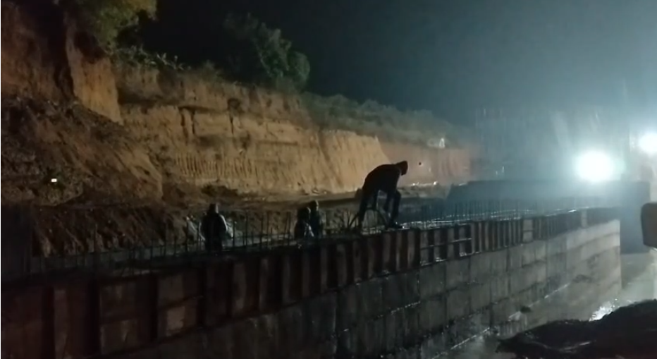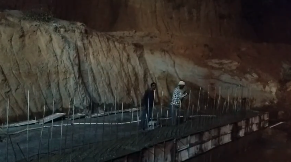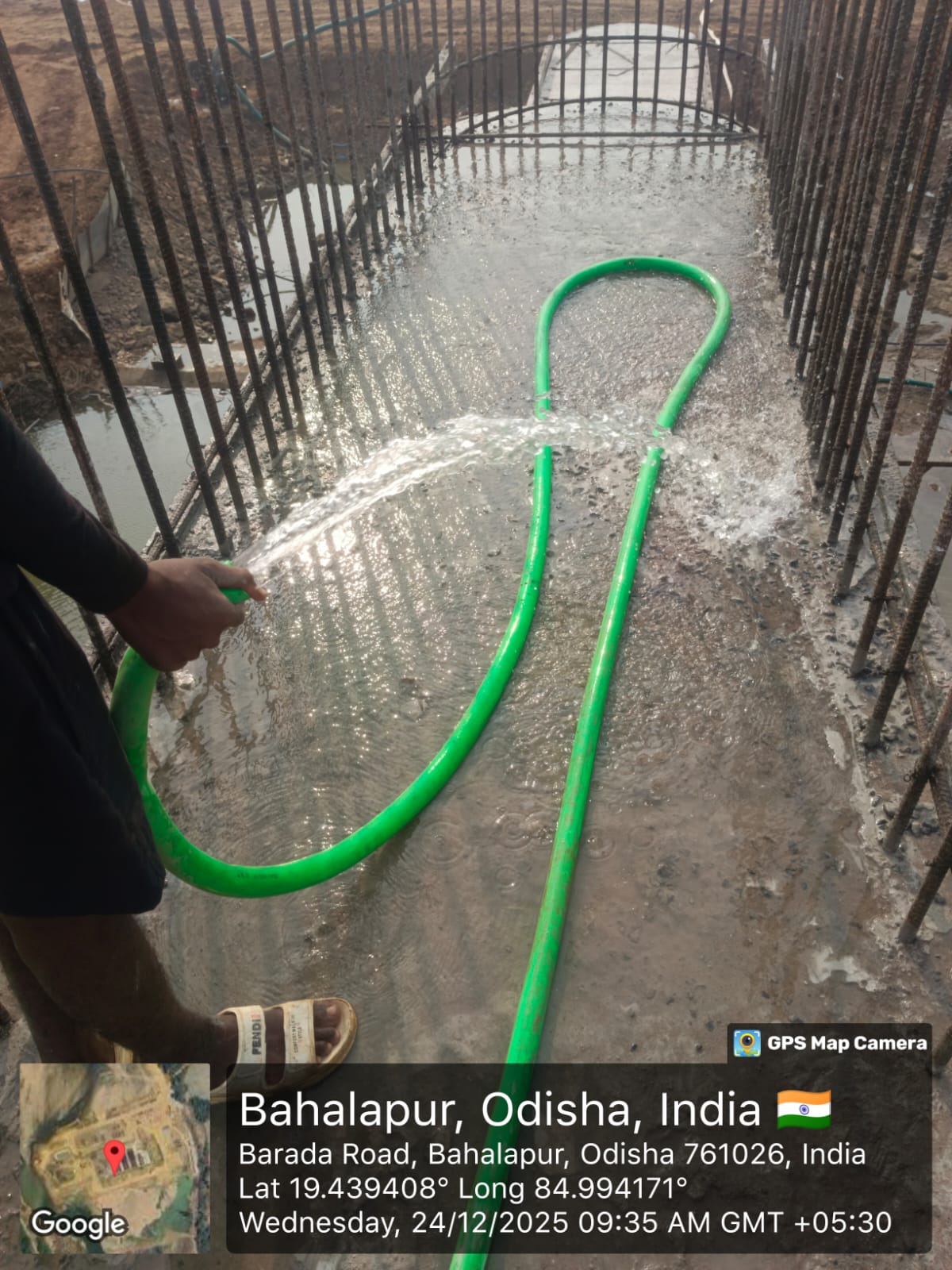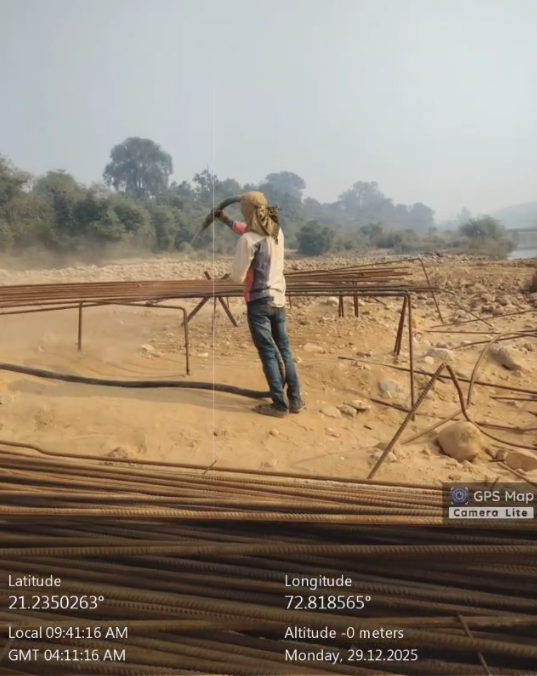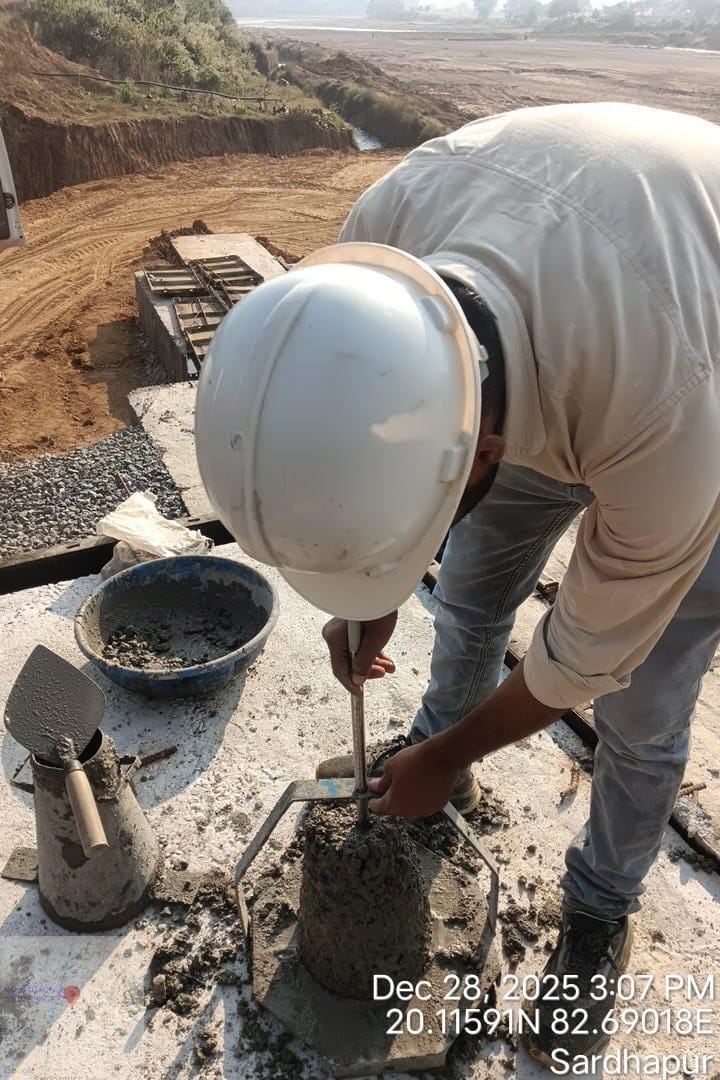 Cast of concrete right-side abutment, including 4 numbers of counterfort walls, of grade M25 (A20) from RL 150.15 m to RL 151.50 m (A2 – 3rd lift wall) is underprogress in the presence of Dept JE, site engineer of PMC and agency forman at site. Slump achieved 88mm on 26.12.2025