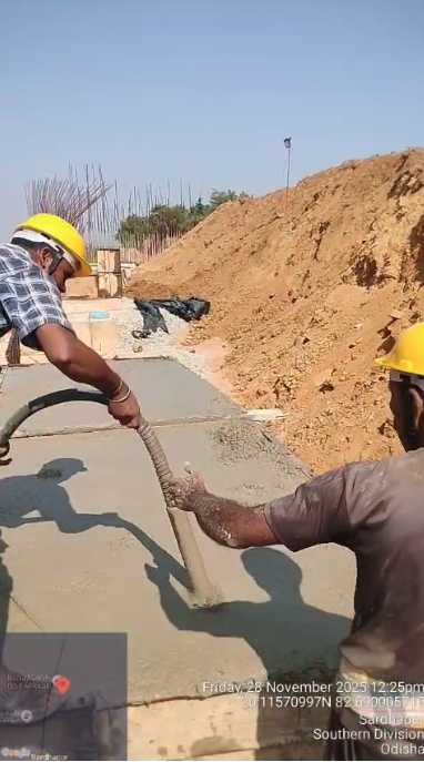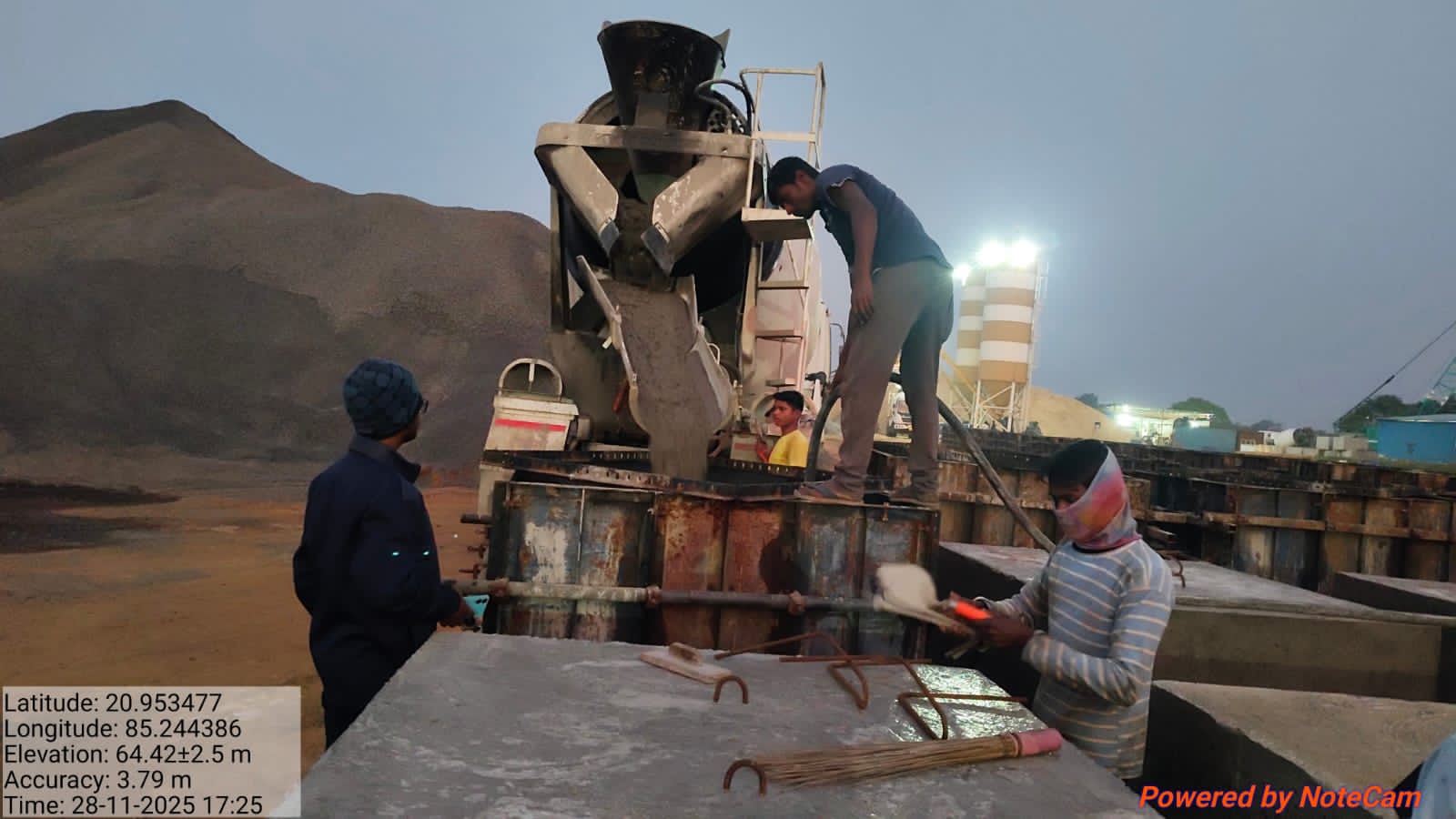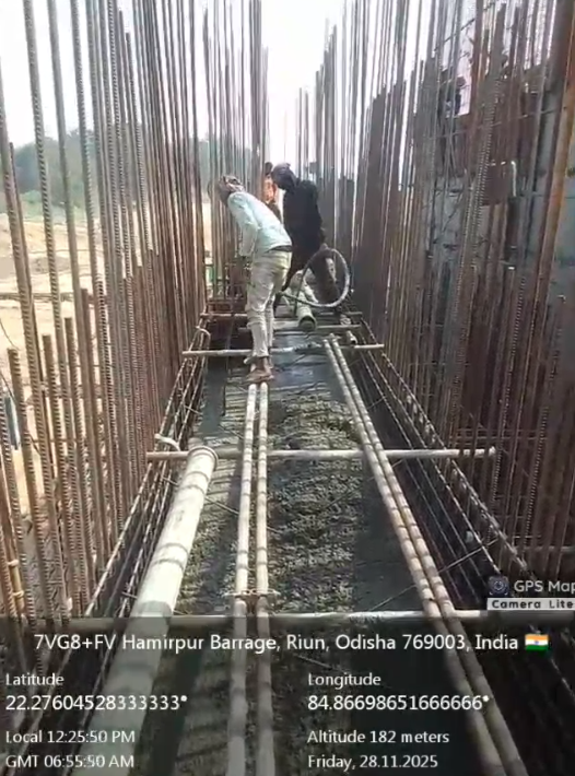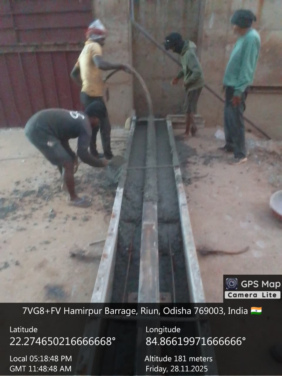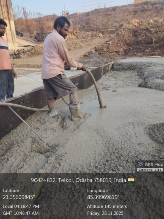 Concrete casting with PCC M20A20 grade for 1no of CC block at U/S right flared out wall from sec.4-4 to Sec.5-5 for 1st lift from RL-235.80m to RL-236.40m is in progress in presence of JE,KID, PM EPC agency, Site Engineers of PMC & EPC agency. Slump achieved 75mm on 28.11.2025