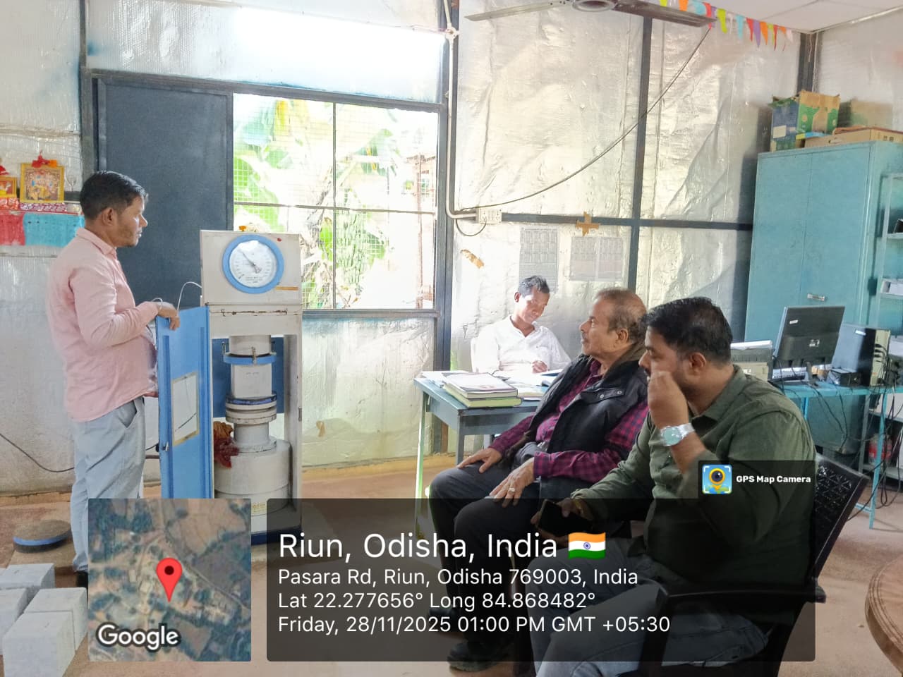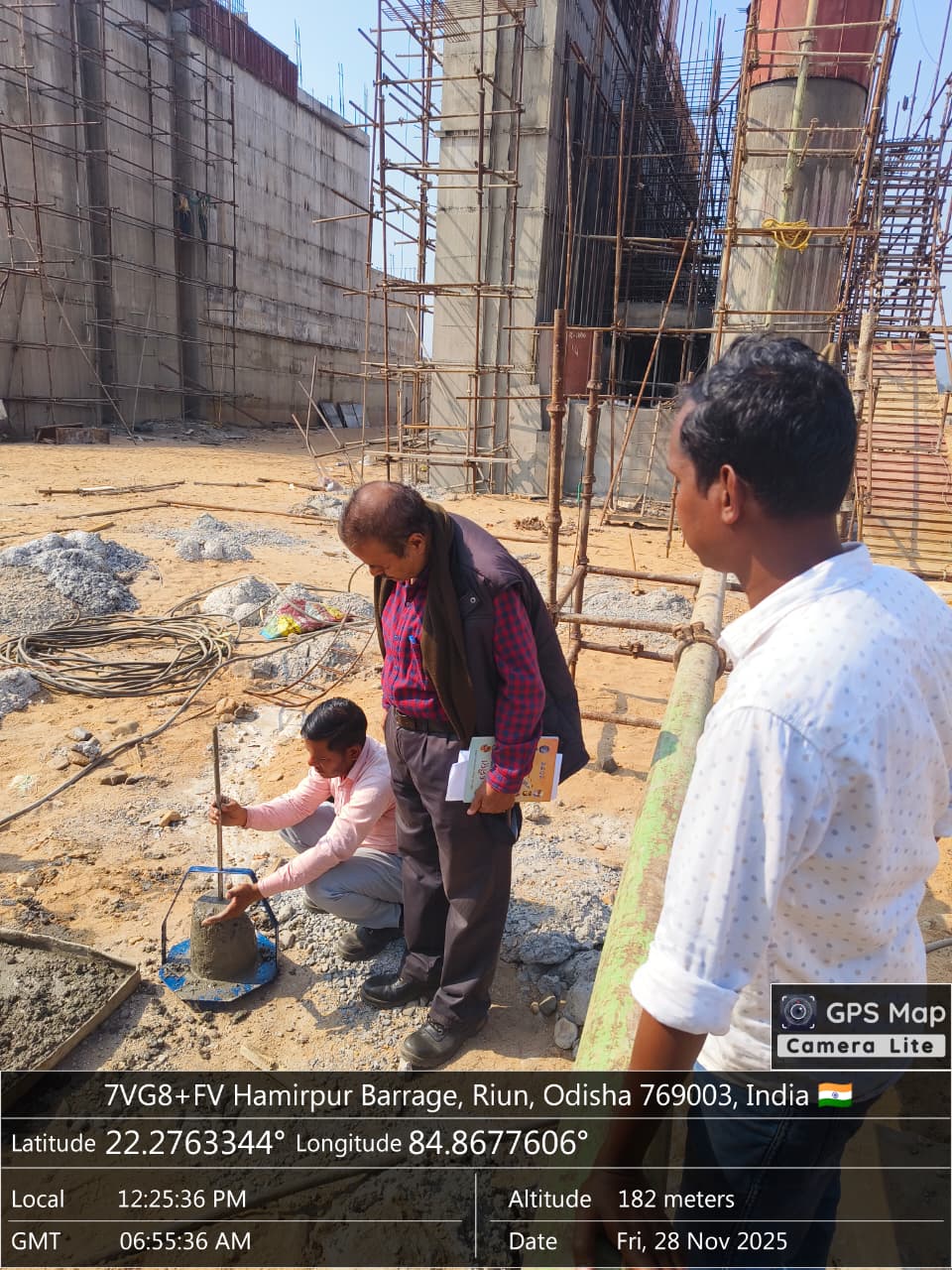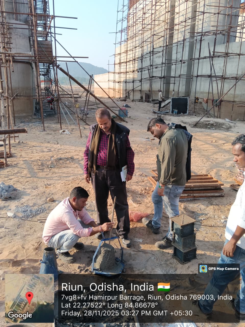 Hirakud Government Lab mix design trial mix conducted at site laboratory of M20A20, 14 days cube (Strength 26.93 N/mm²) and M20A40, 28 days cube (Strength 28.29 N/mm²)in presence of PSS Team.