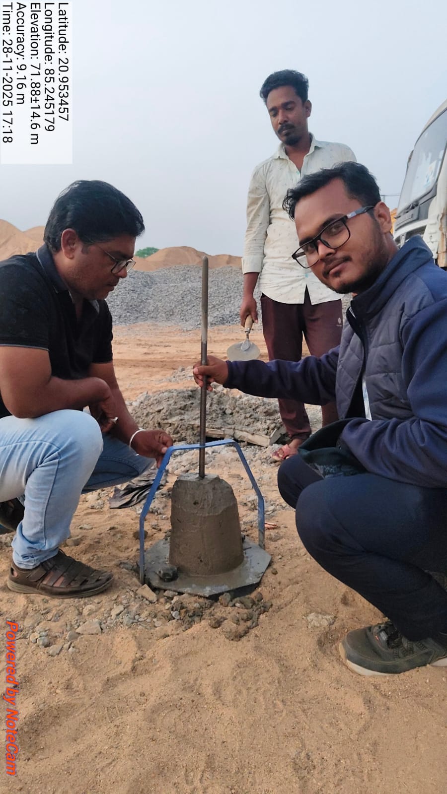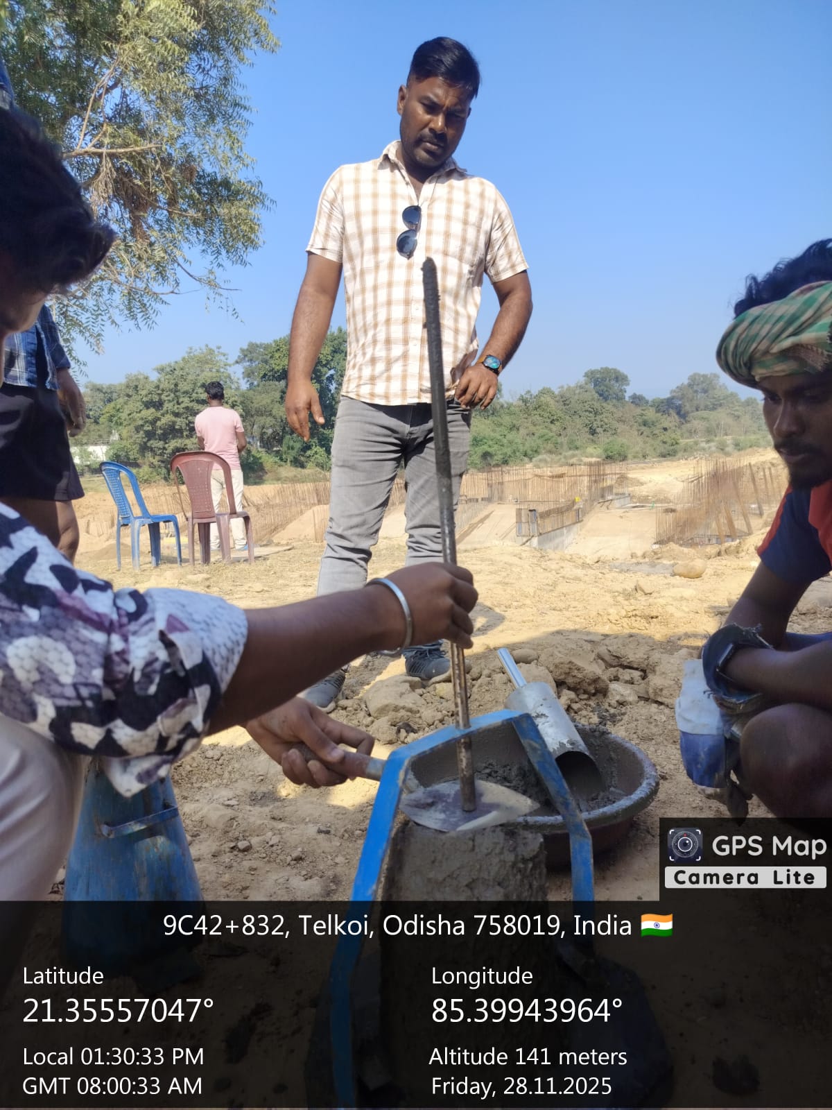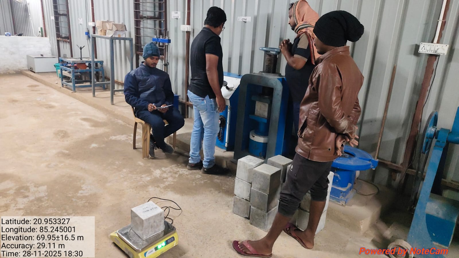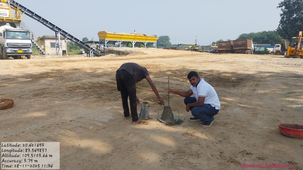 Hirakud Government Lab mix design trial mix conducted at site laboratory of M20A20, 14 days cube (Strength 26.93 N/mm²) and M20A40, 28 days cube (Strength 28.29 N/mm²)in presence of PSS Team.