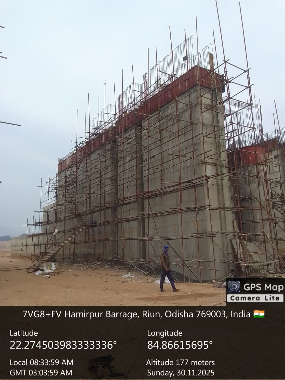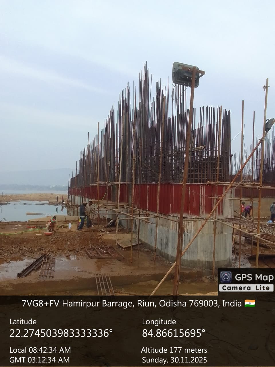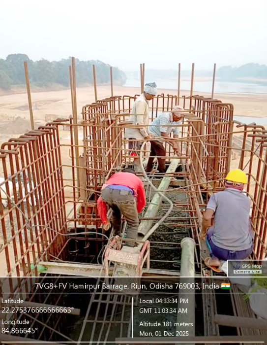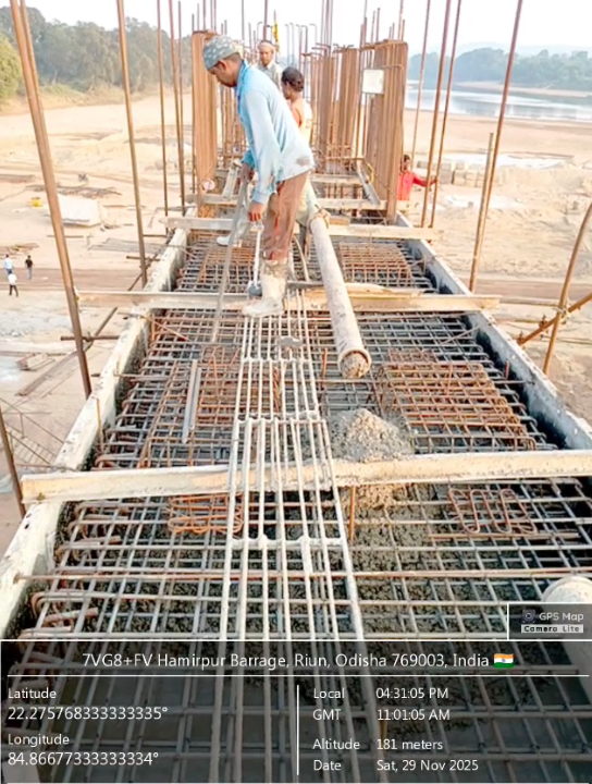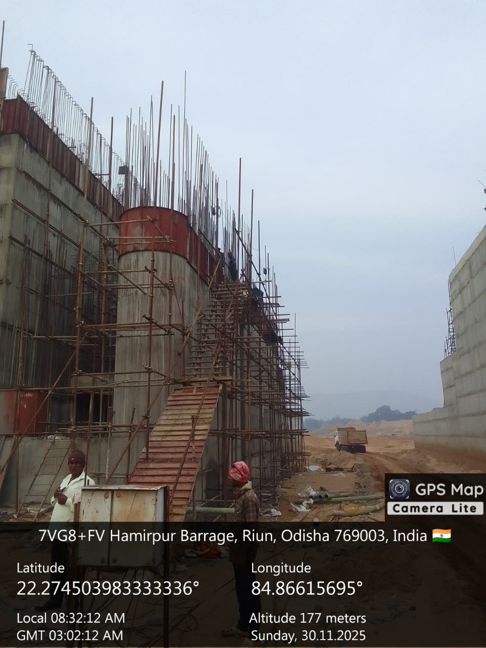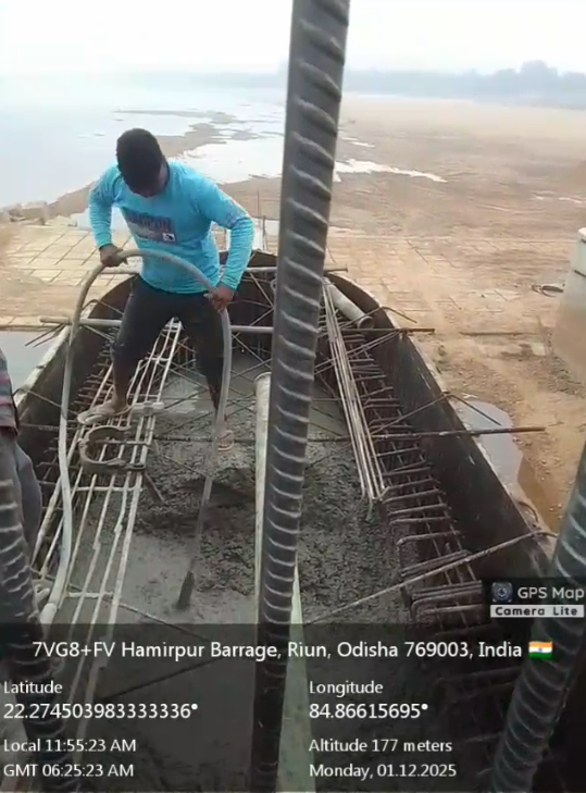 Concrete casting with PCC M20A20 grade for total 2nos. of CC block at U/S right flared out wall i.e 1no. of 5x1.5x0.6m at sec.4-4 for 1st lift & 1no. at sec. 5-5 for 2nd lift of 0.6m hight upto RL-237.00m is in progress in presence of JE,KID, PM EPC agency, Site Engineers of PMC & EPC agency. Slump achieved 71mm on 30.11.2025