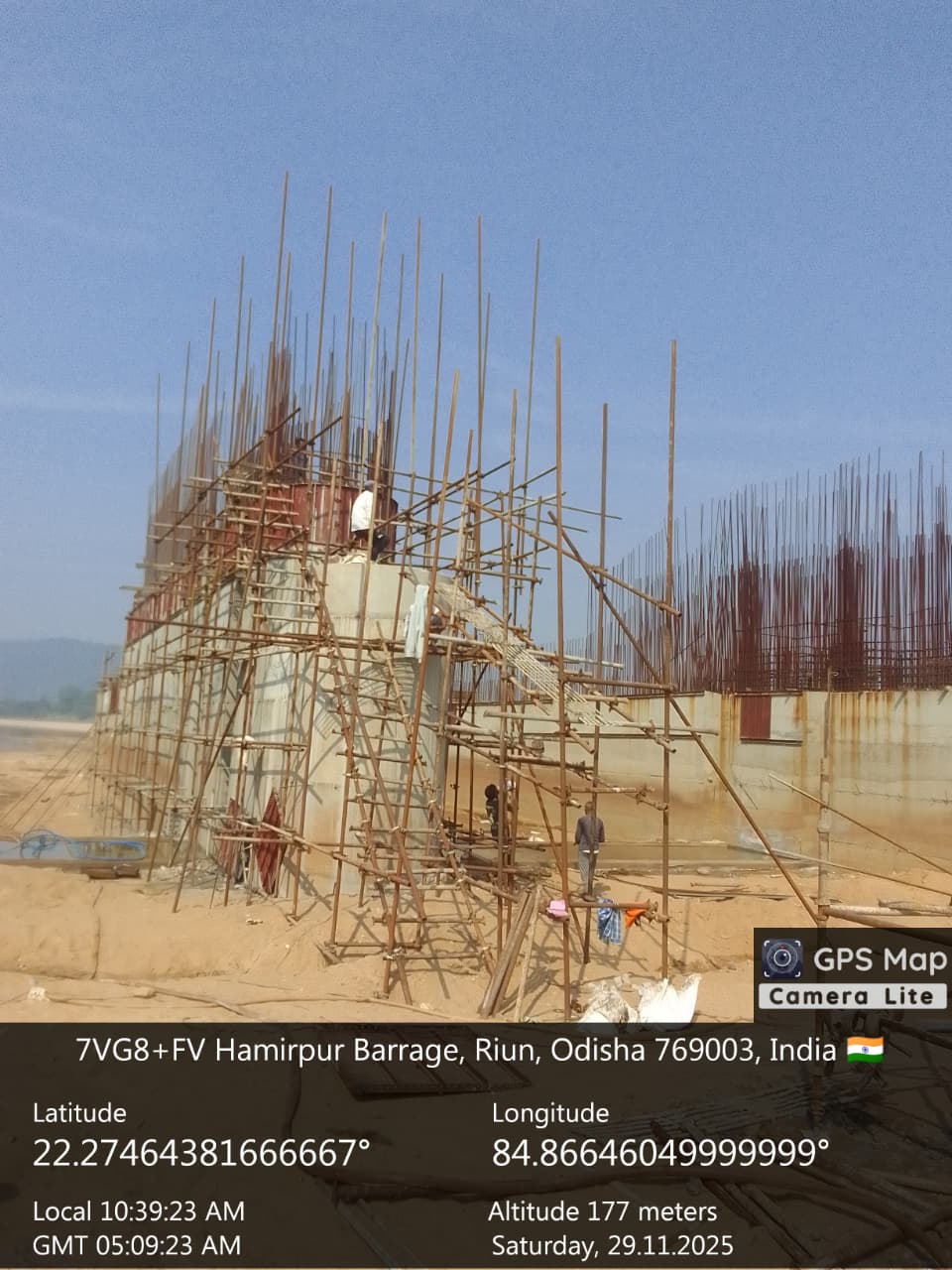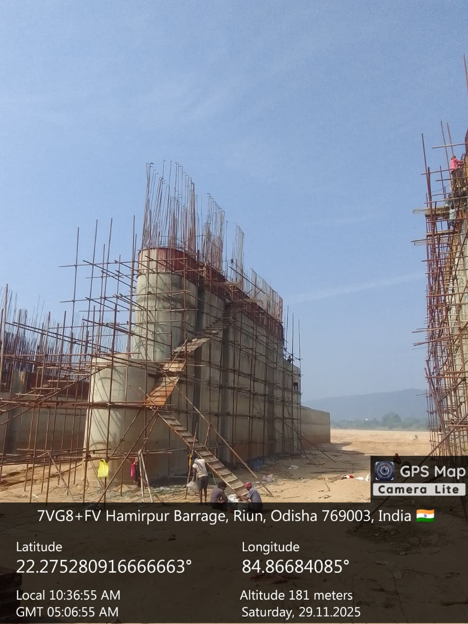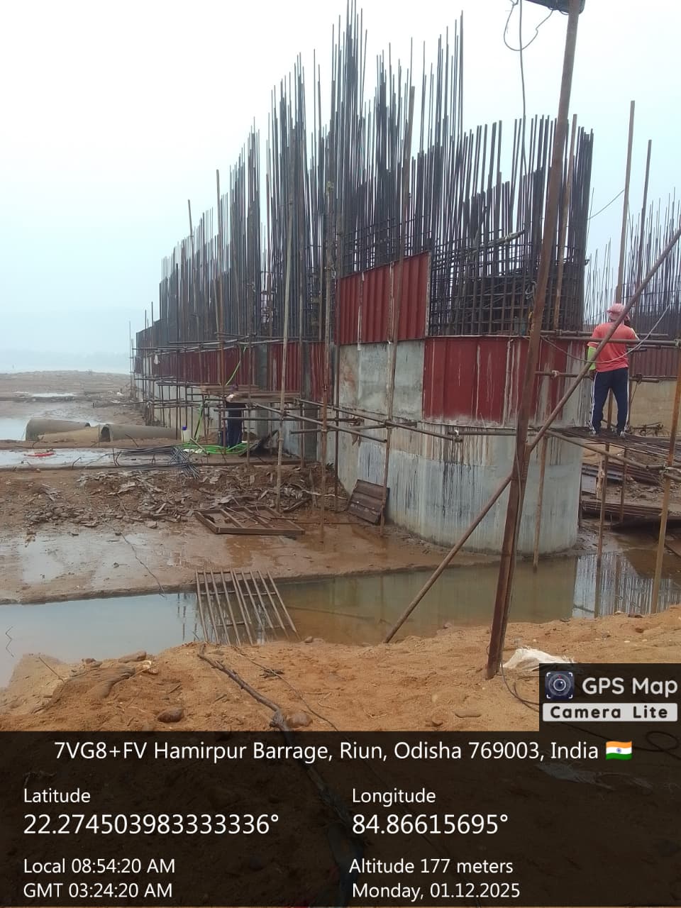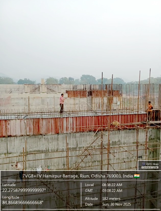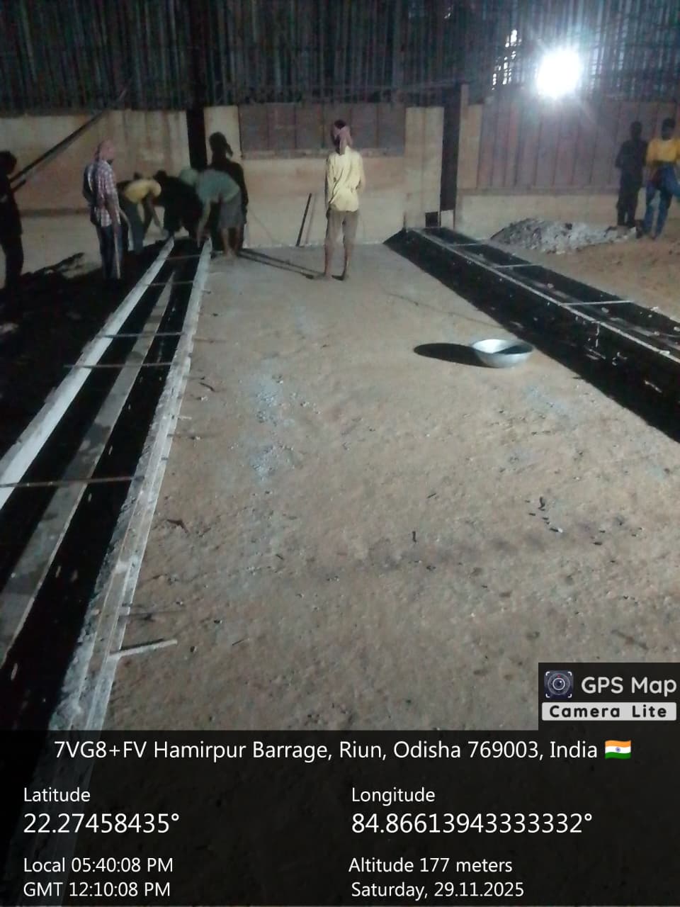 Concrete casting with PCC M20A20 grade for total 2nos. of CC block at U/S right flared out wall i.e 1no. of 5x1.5x0.6m at sec.4-4 for 1st lift & 1no. at sec. 5-5 for 2nd lift of 0.6m hight upto RL-237.00m is in progress in presence of JE,KID, PM EPC agency, Site Engineers of PMC & EPC agency. Slump achieved 71mm on 30.11.2025