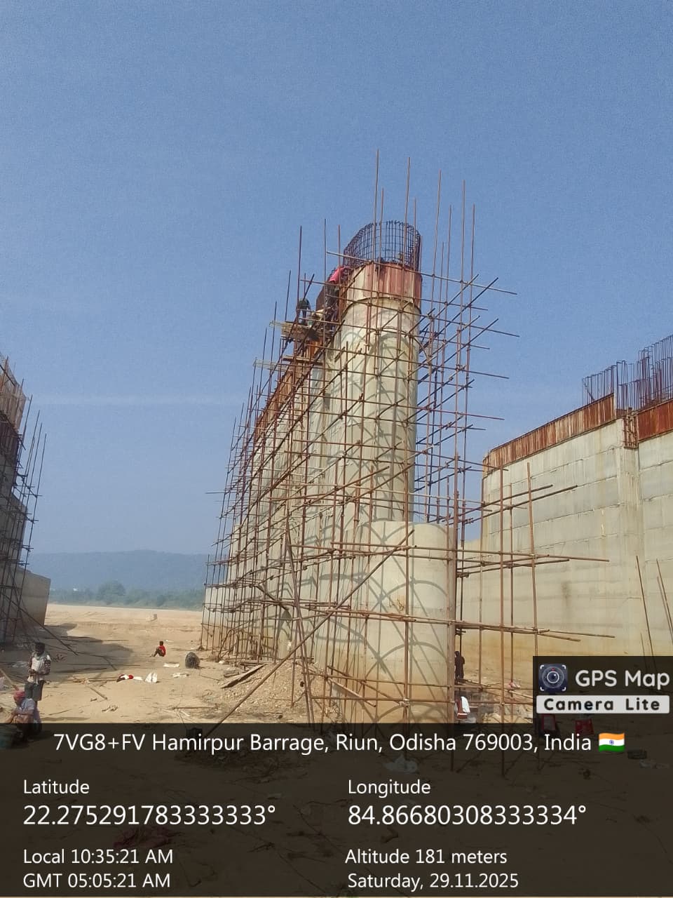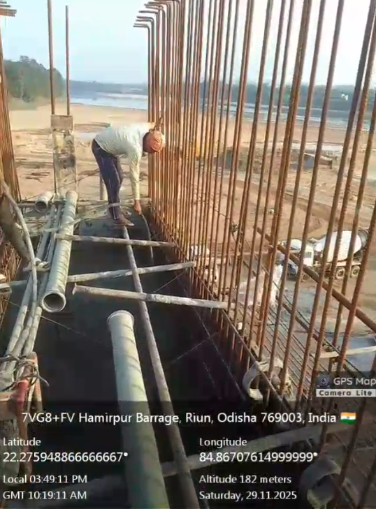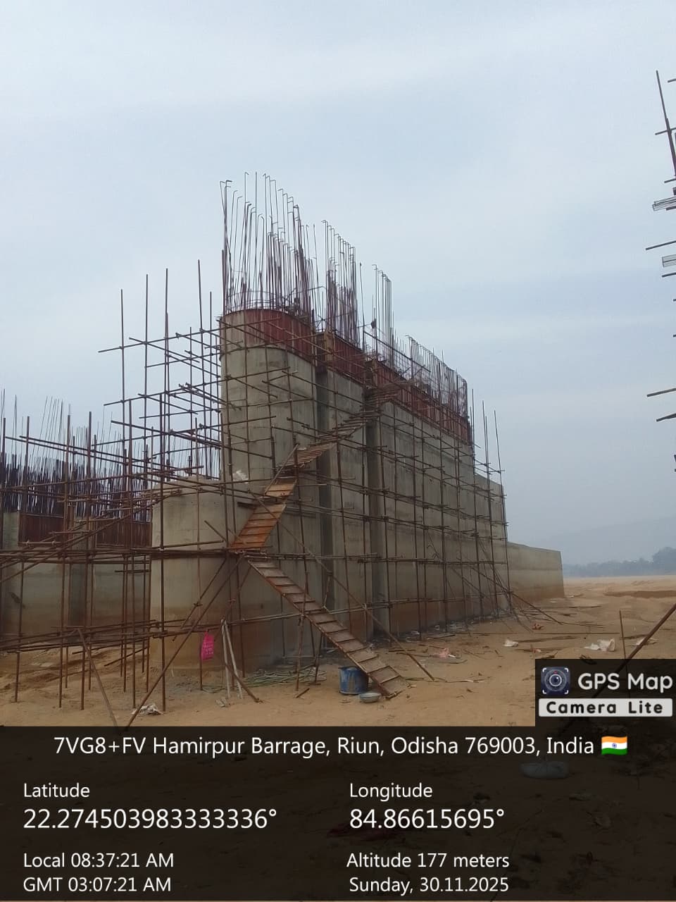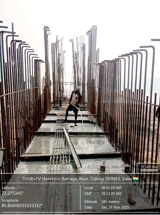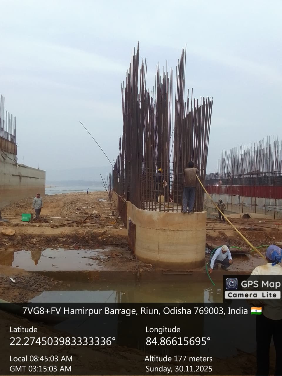 Concrete casting with PCC M20A20 grade for total 2nos. of CC block at U/S right flared out wall i.e 1no. of 5x1.5x0.6m at sec.4-4 for 1st lift & 1no. at sec. 5-5 for 2nd lift of 0.6m hight upto RL-237.00m is in progress in presence of JE,KID, PM EPC agency, Site Engineers of PMC & EPC agency. Slump achieved 71mm on 30.11.2025