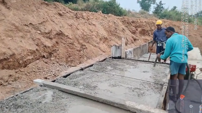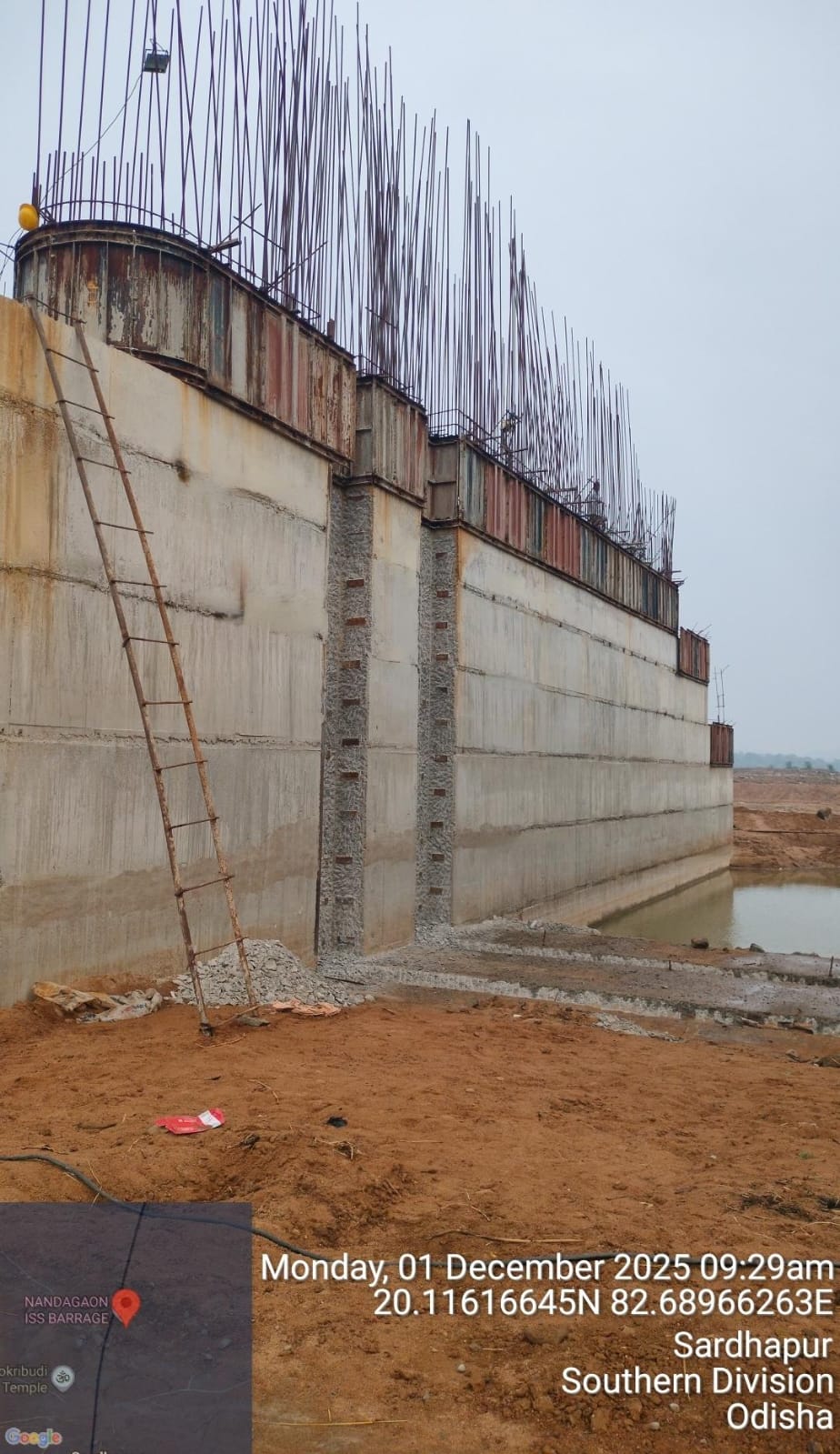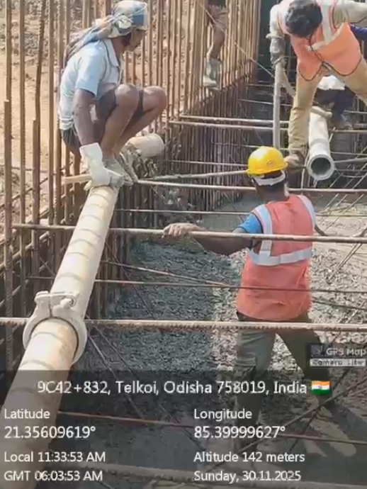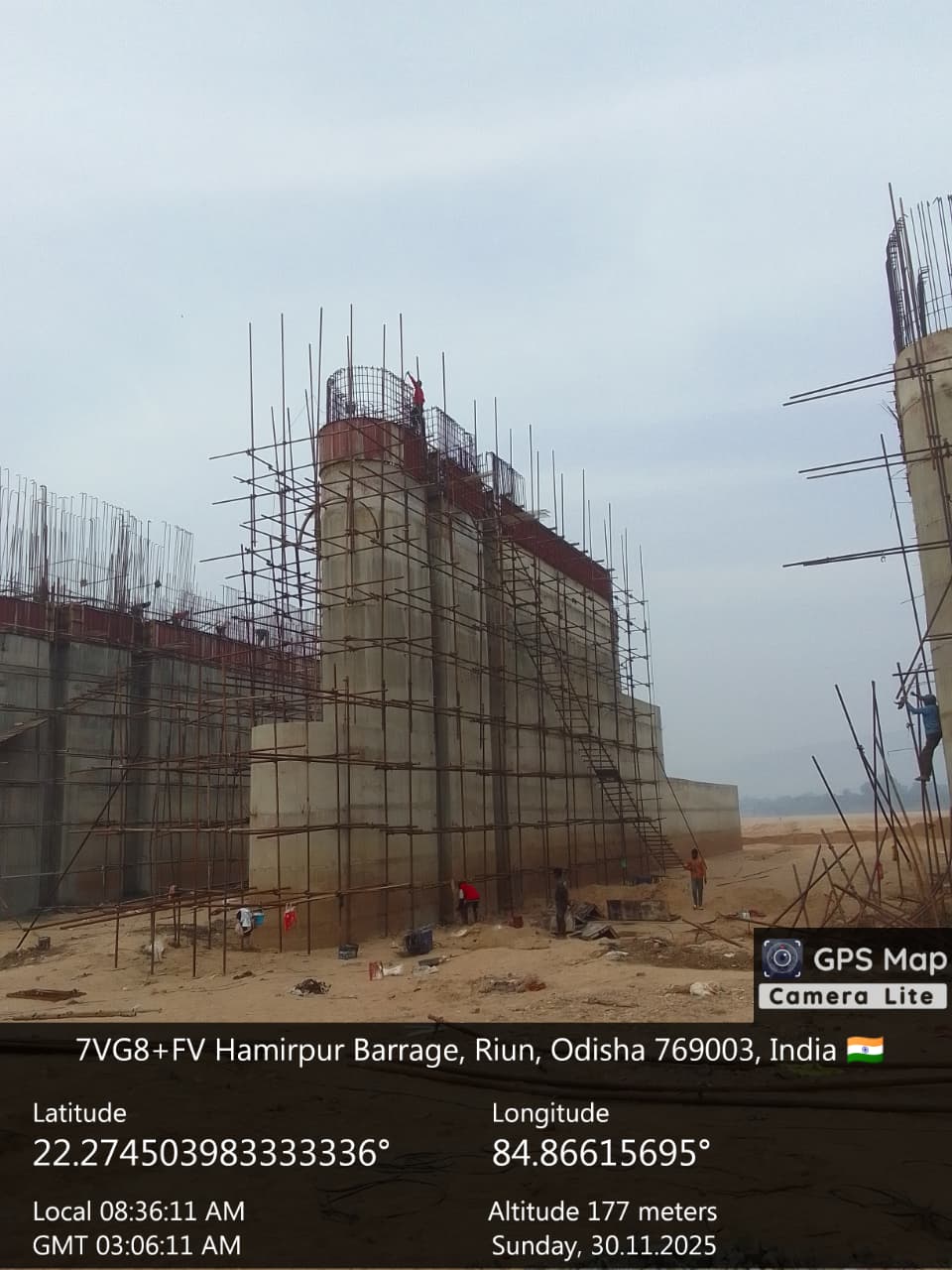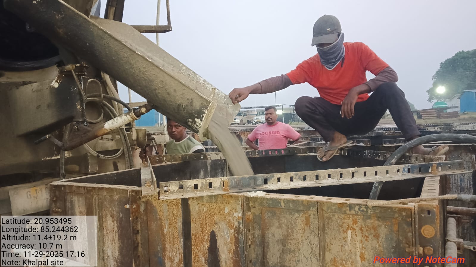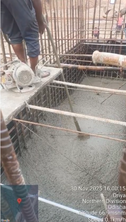 Concrete casting with PCC M20A20 grade for total 2nos. of CC block at U/S right flared out wall i.e 1no. of 5x1.5x0.6m at sec.4-4 for 1st lift & 1no. at sec. 5-5 for 2nd lift of 0.6m hight upto RL-237.00m is in progress in presence of JE,KID, PM EPC agency, Site Engineers of PMC & EPC agency. Slump achieved 71mm on 30.11.2025