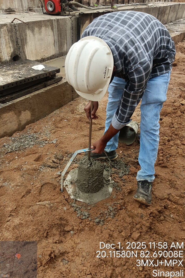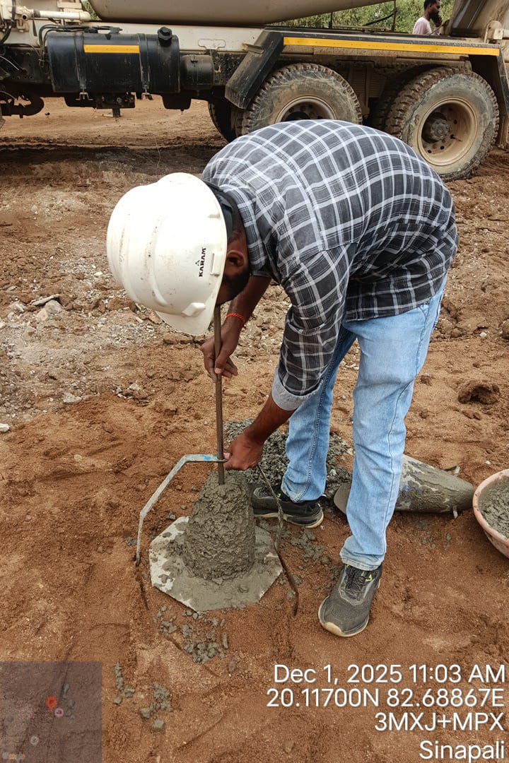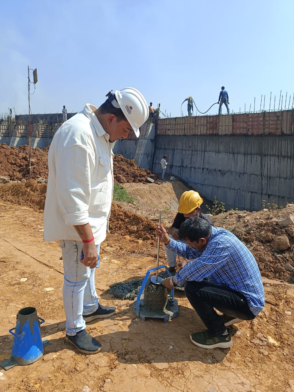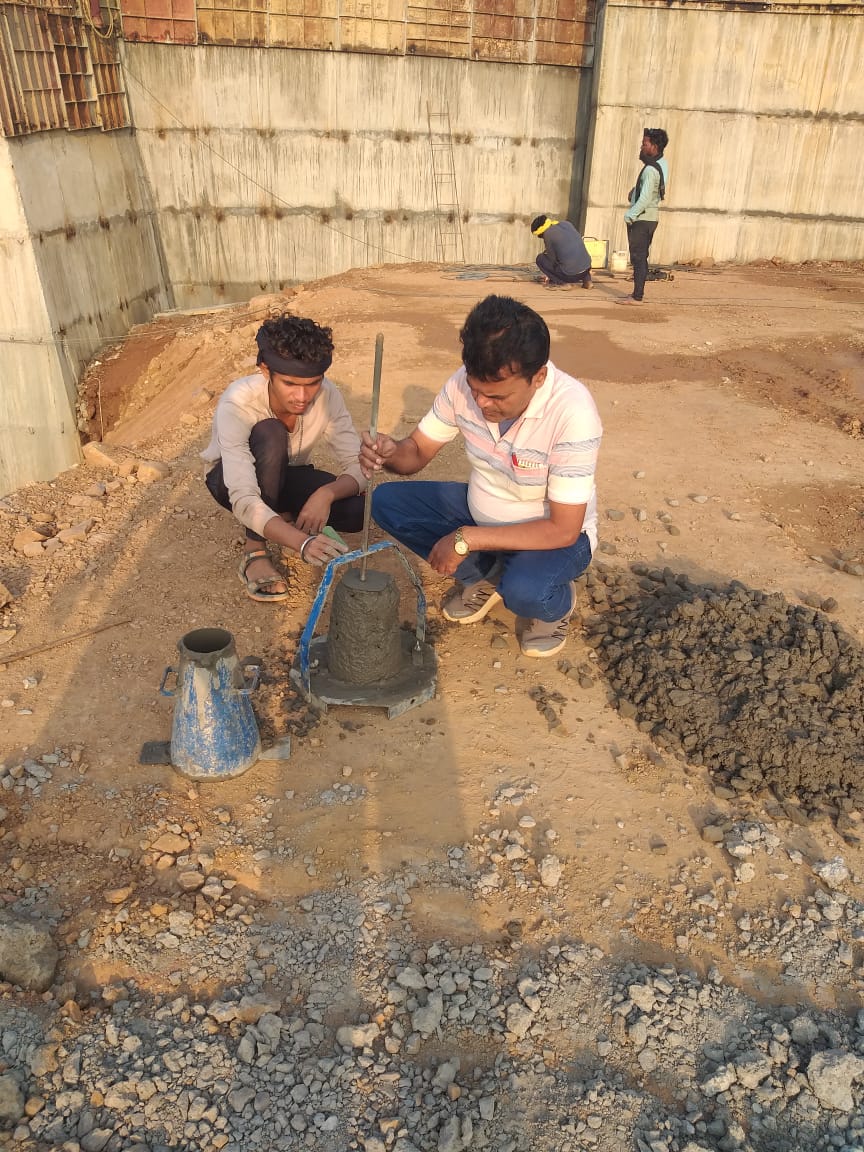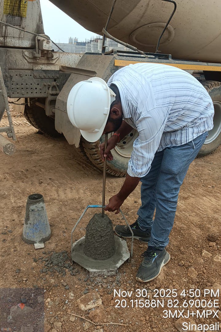 Slump cone test conducted at site in presence of QA/QC Expert and Site Engineers PMC. Cube cast at site.