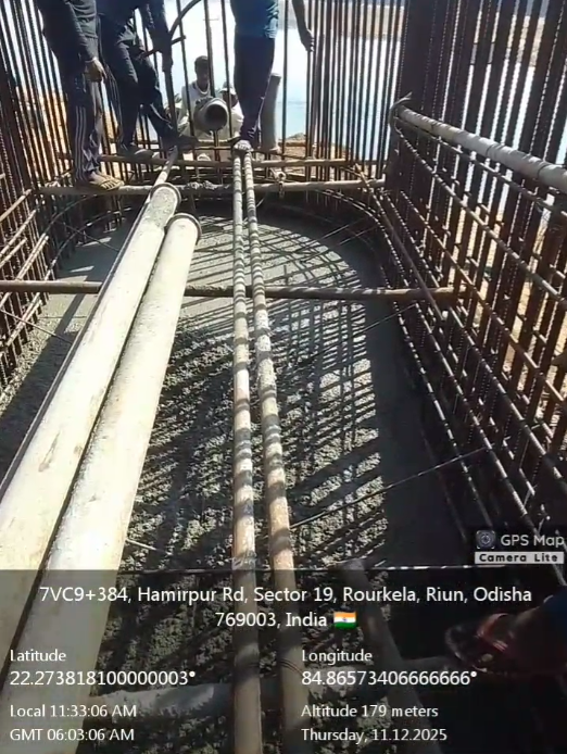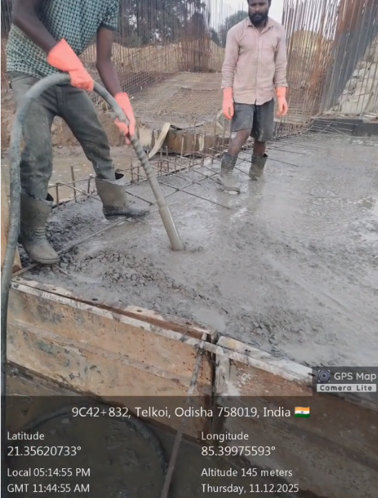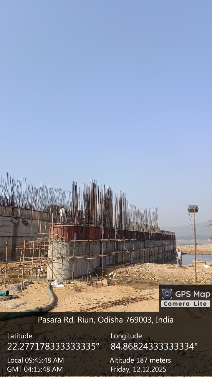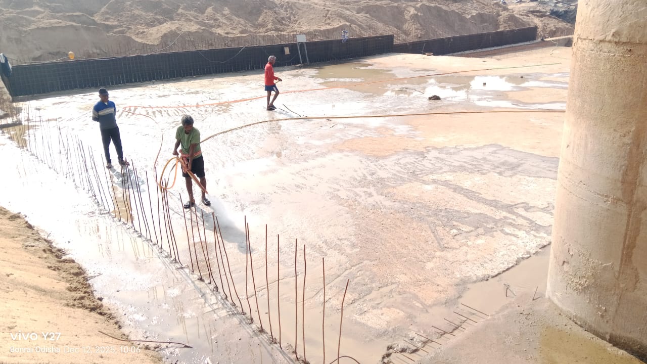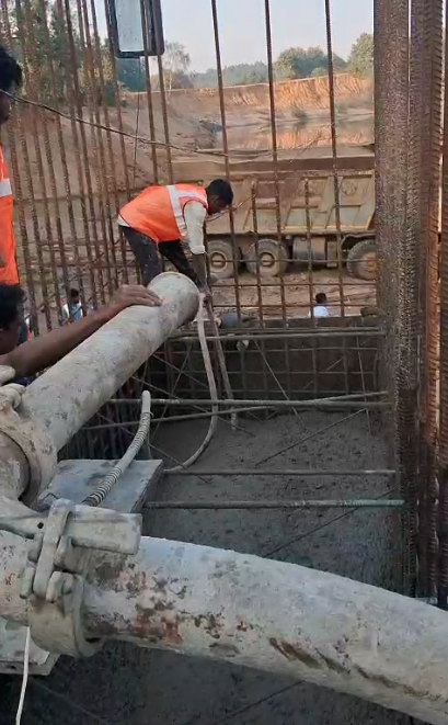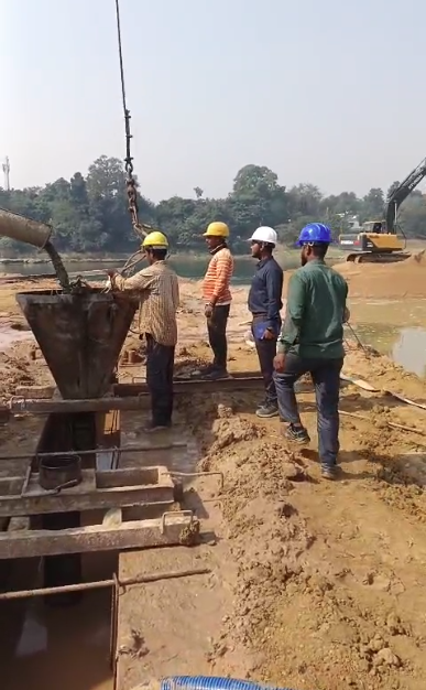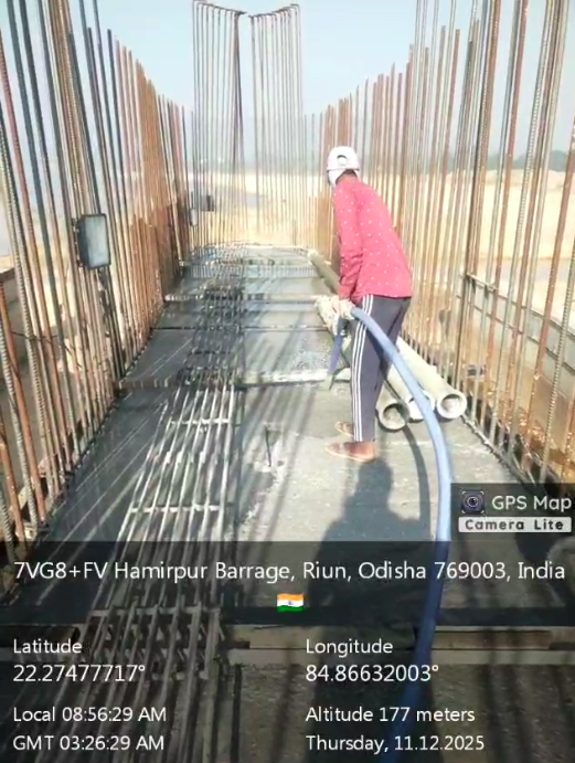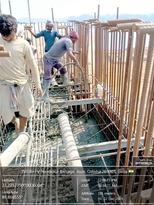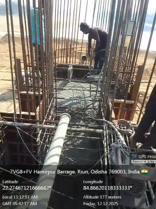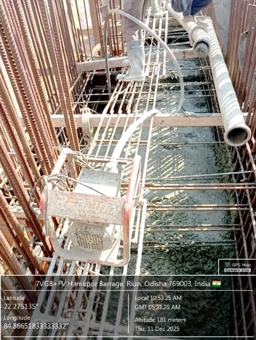 Cast of concrete 2nd layer RCC M25A20 grade at Barrage bay crest -8 in between P9 and P8 from RL 148.90m to 149.60 m is under progress through pump in the presence of Dept JE, site engineer of PMC and agency at site. Slump achieved 91mm on 11.12.2025