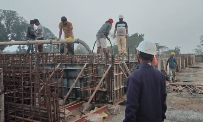 Concrete casting with RCC M25A20 grade at Pier no.9 for 10th lift at U/S side and 11th lift at D/S side from RL-244.50m to RL-245.10m (Pier cap bottom) is in progress through concrete pump in presence of JE,KID, PM EPC agency, Site Engineers of PMC & EPC agency,ISS Nandgaon. Slump achieved 81mm on 23.12.2025