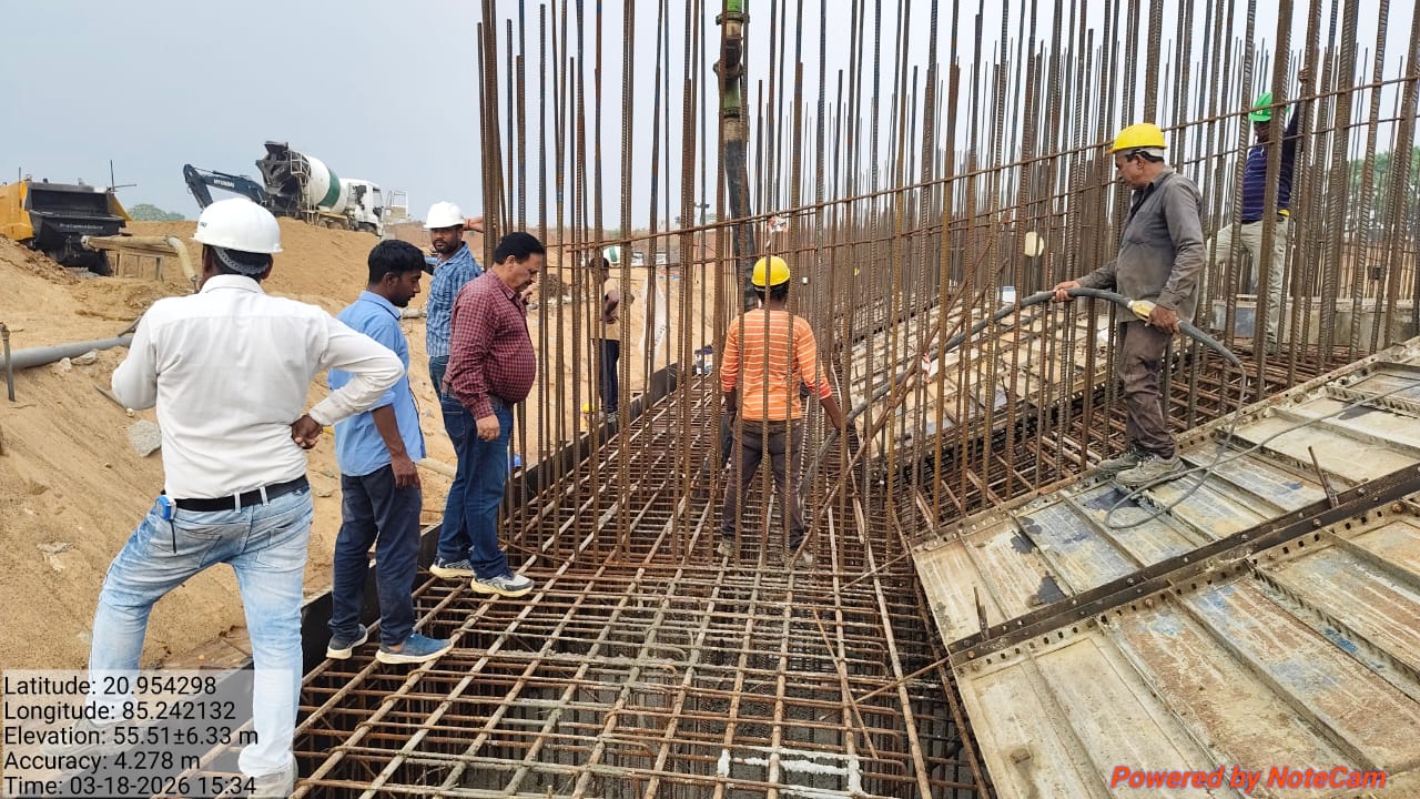 Cast of concrete 1st lift RCC M30A20 grade at block out area from P2 to P8 with RL 159.50m to 160.40m is under progress in the presence of Dept JE, site engineer of PMC and agency at site. The slump test value is 75mm on 17.03.2026