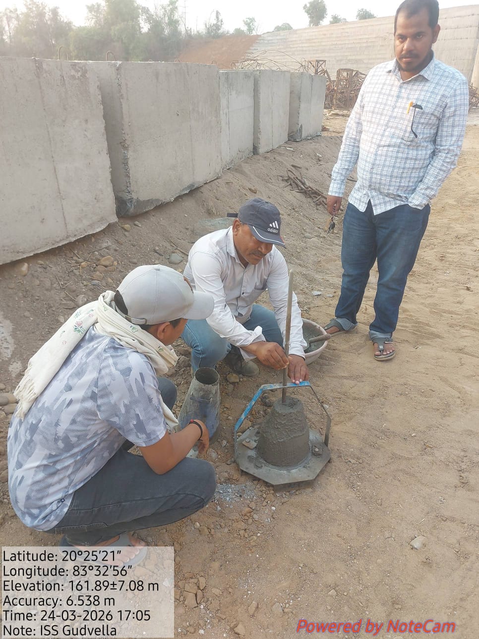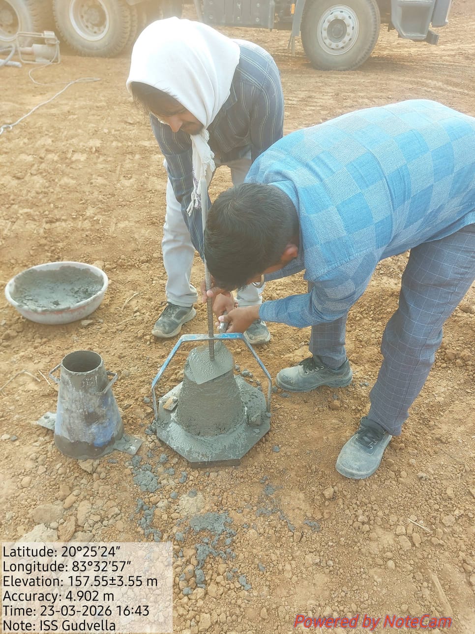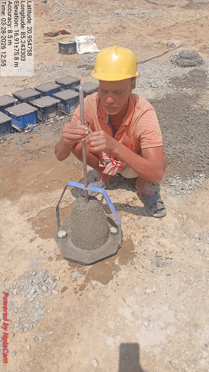 Casting of CC BLOCK PCC M20A40 grade is under progress in the presence of Dept JE, site engineer of PMC and agency. The slump test value is 75mm on 24.03.2026