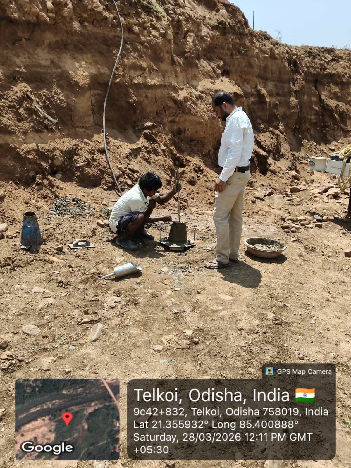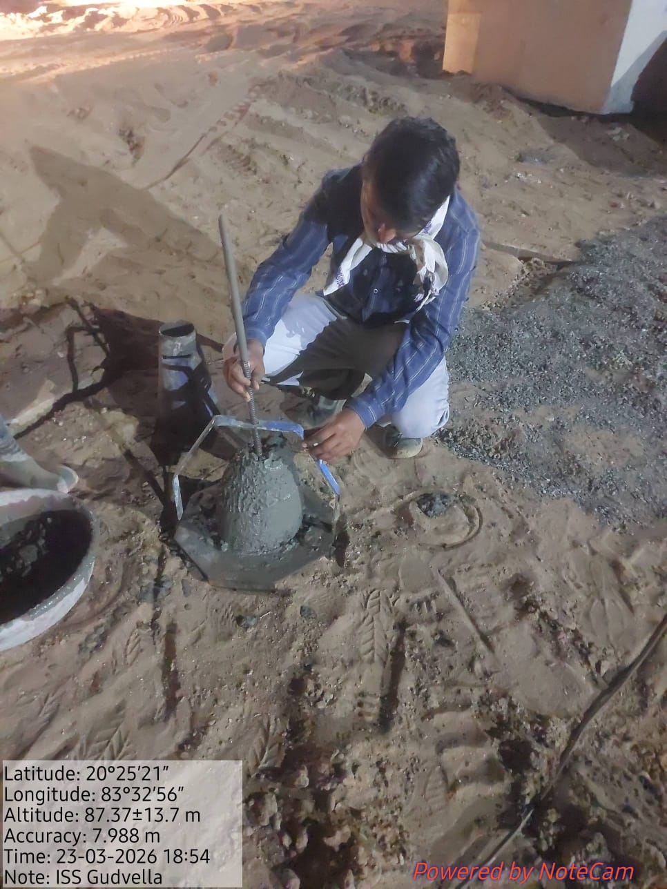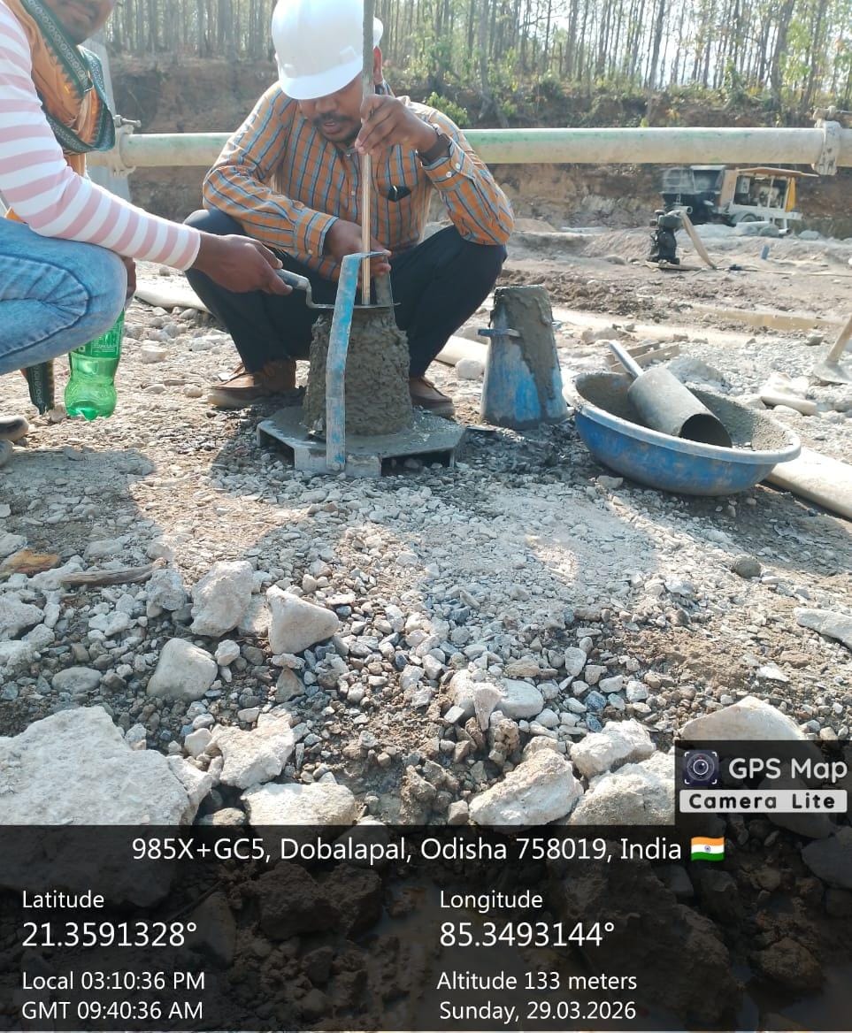 Casting of CC BLOCK PCC M20A40 grade is under progress in the presence of Dept JE, site engineer of PMC and agency. The slump test value is 75mm on 24.03.2026