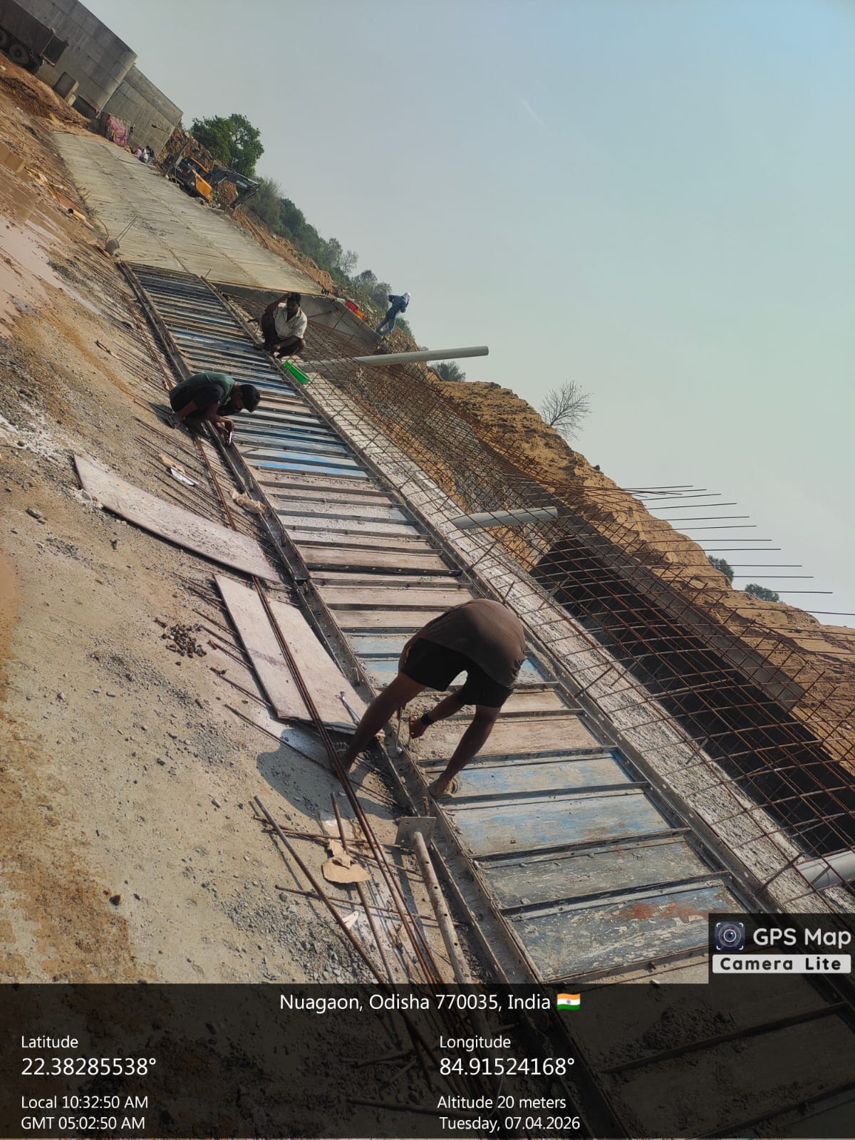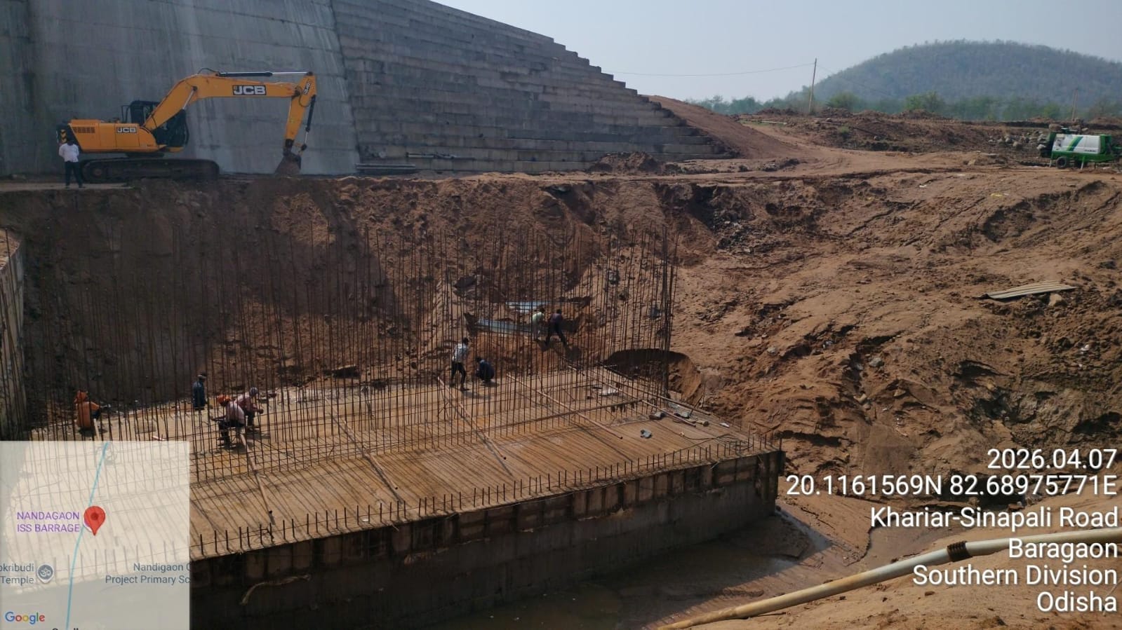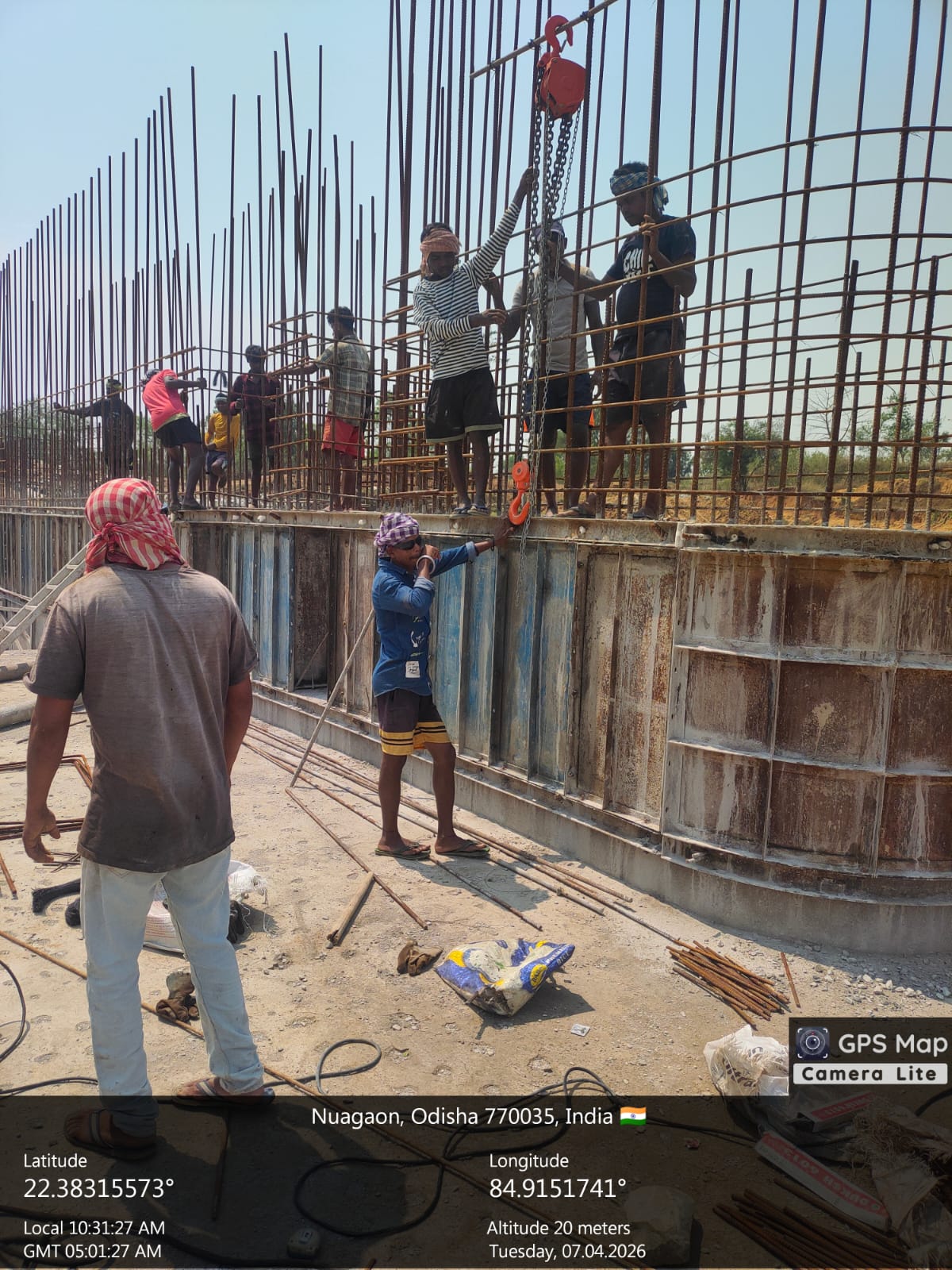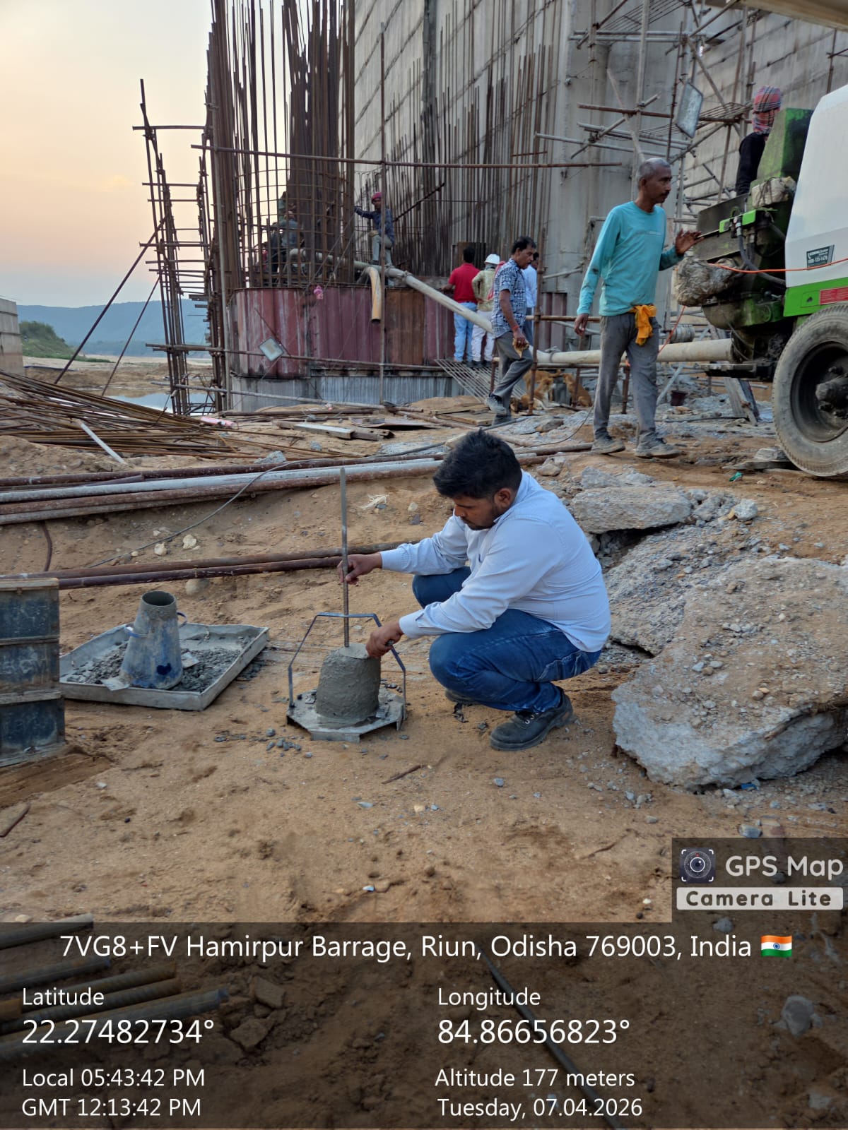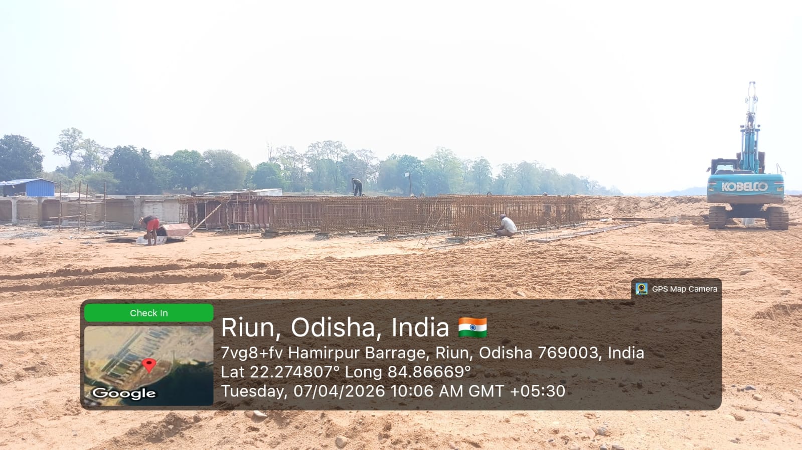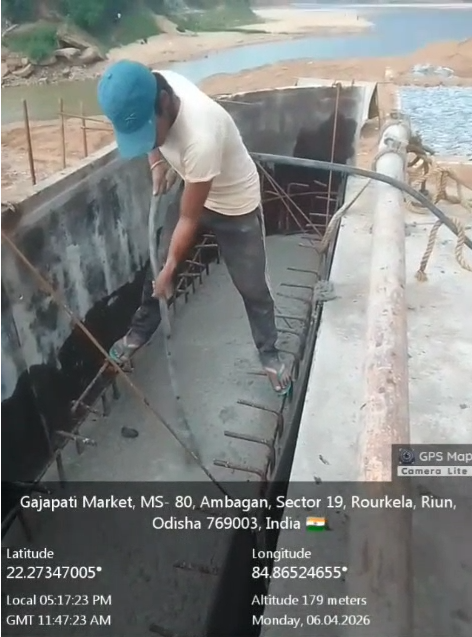 Barrage bay Raft Casting work in progress.In presence of SE,AEE,AE of Akhuapada irrigation division,PMC and representative of Agency of Baitarani Iss.Till now Volume of Concrete Poured 1167 Cum-07.04.2026