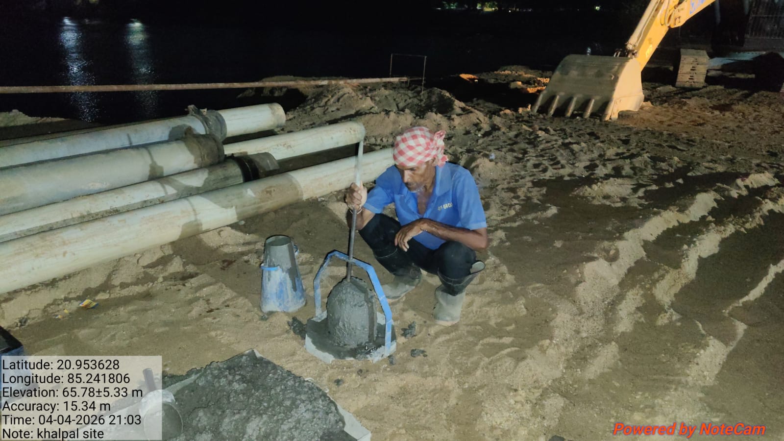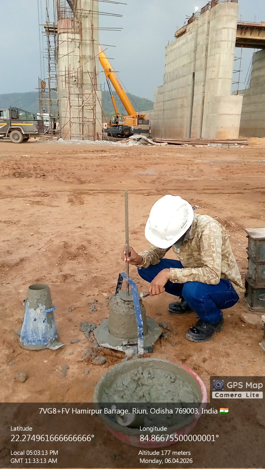 Concrete casting with M35A20 grade of 2nd stage concrete at pier no.1& left abutment for 9th lift of undersluice bay-1 is in progress in presence of PM EPC agency, Site Engineers of PMC & EPC agency. The slump test value is 83mm on 04.04.2026