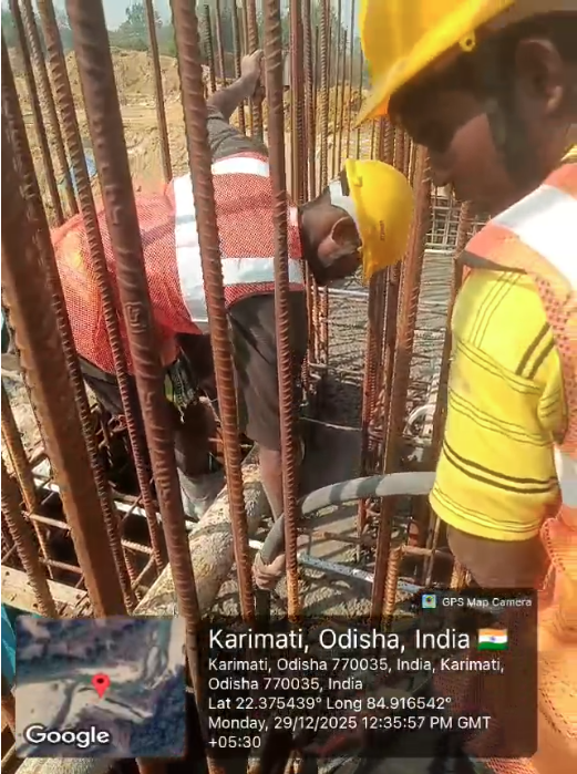 Concrete casting with RCC M25A20 grade at Pier no.11 for Pier cap from RL-245.10m to RL-245.40m is in progress in presence of PM EPC agency, Site Engineers of PMC & EPC agency . Slump achieved 88mm on 28.12.2025