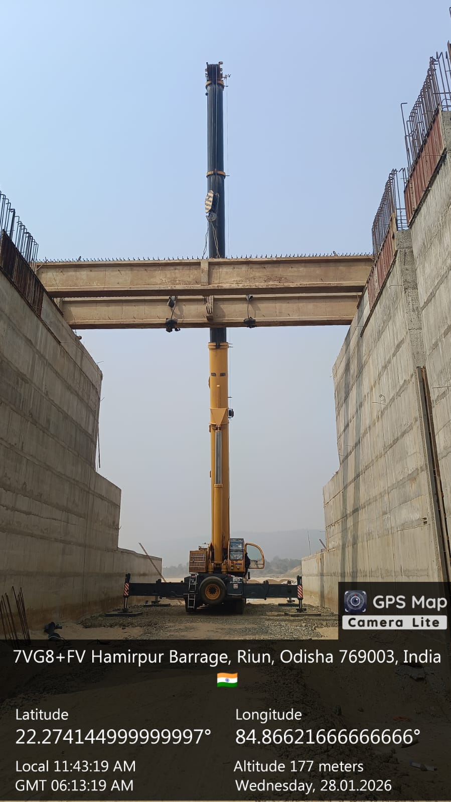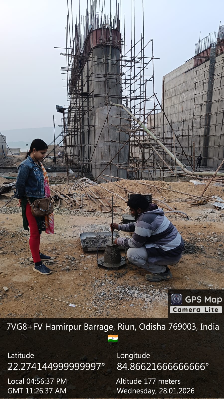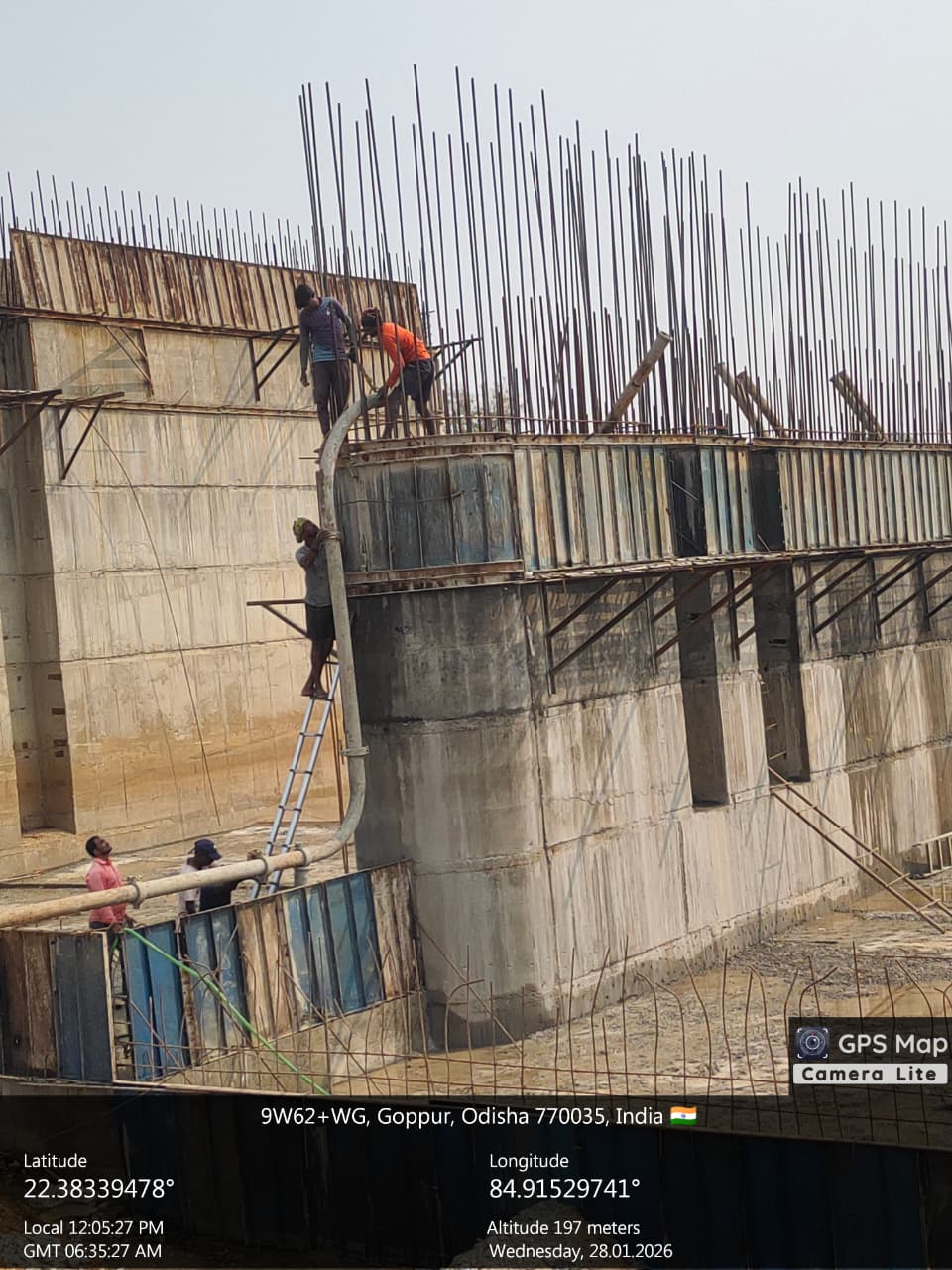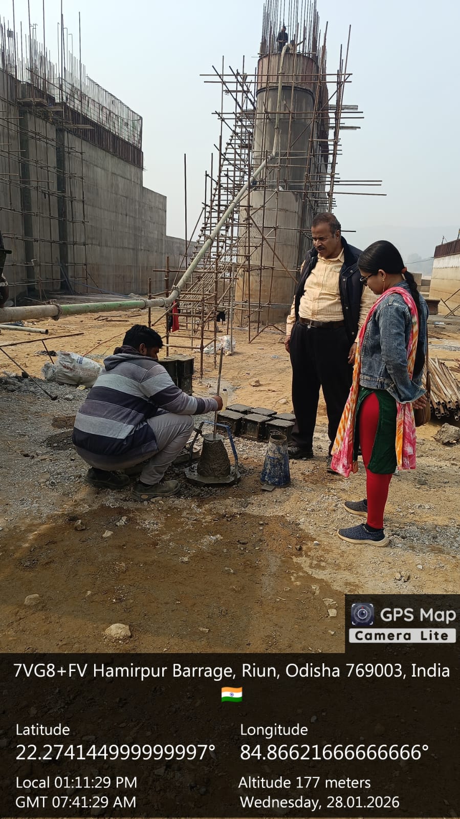 Concrete casting with M35A20 grade for 2nd stage concrete for stoplog & service gate grooves at bay-6 of Pier no.6 for 6th lift is in progress in presence of PM,EPC agency,Site Engineers of PMC & Site Engineer of EPC agency. The slump test value is 77mm on 27.01.2026