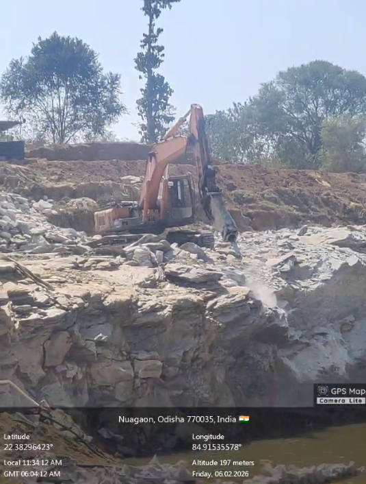 Drilling & Excavation of D/S RHS Under sluice Overburden Rock Breaking work is under progress.