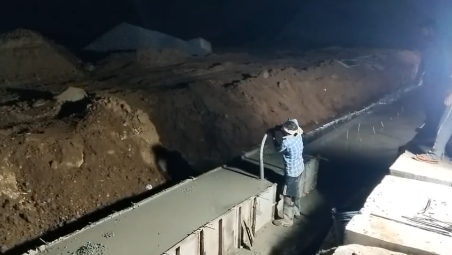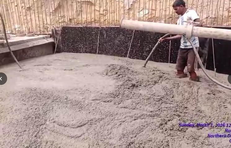 Cast of concrete 1st lift PCC M20A20 grade at 2nd row D/s curtain wall from P2 to P6 with RL 147.10m to 147.70m is underprogress in the presence of Dept JE , site engineers of PMC n agency. The slump test value is 75mm on 26.02.2026