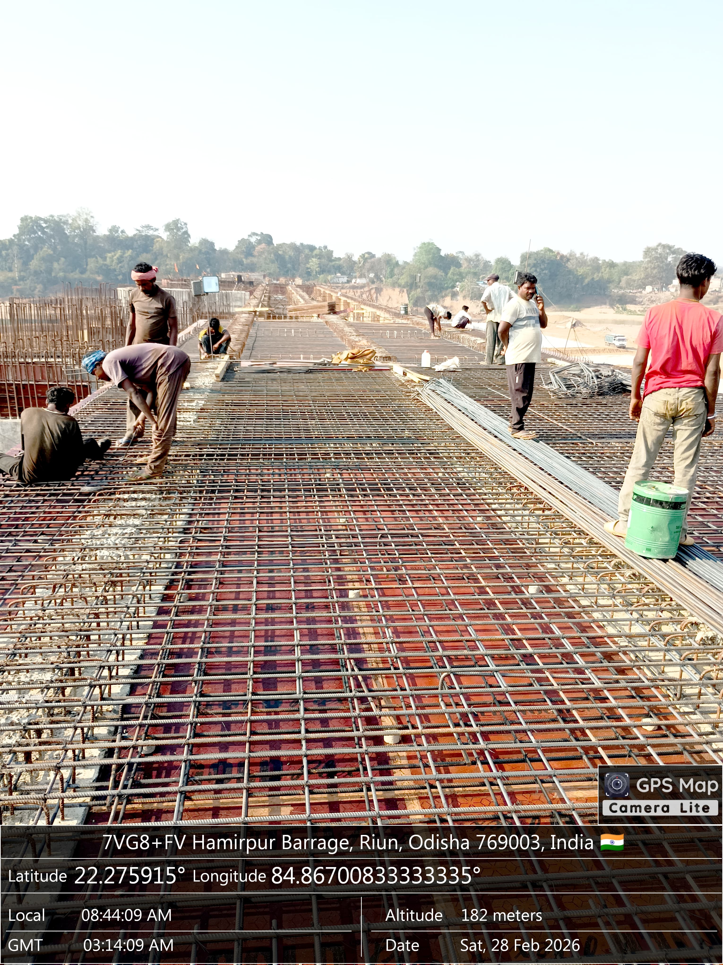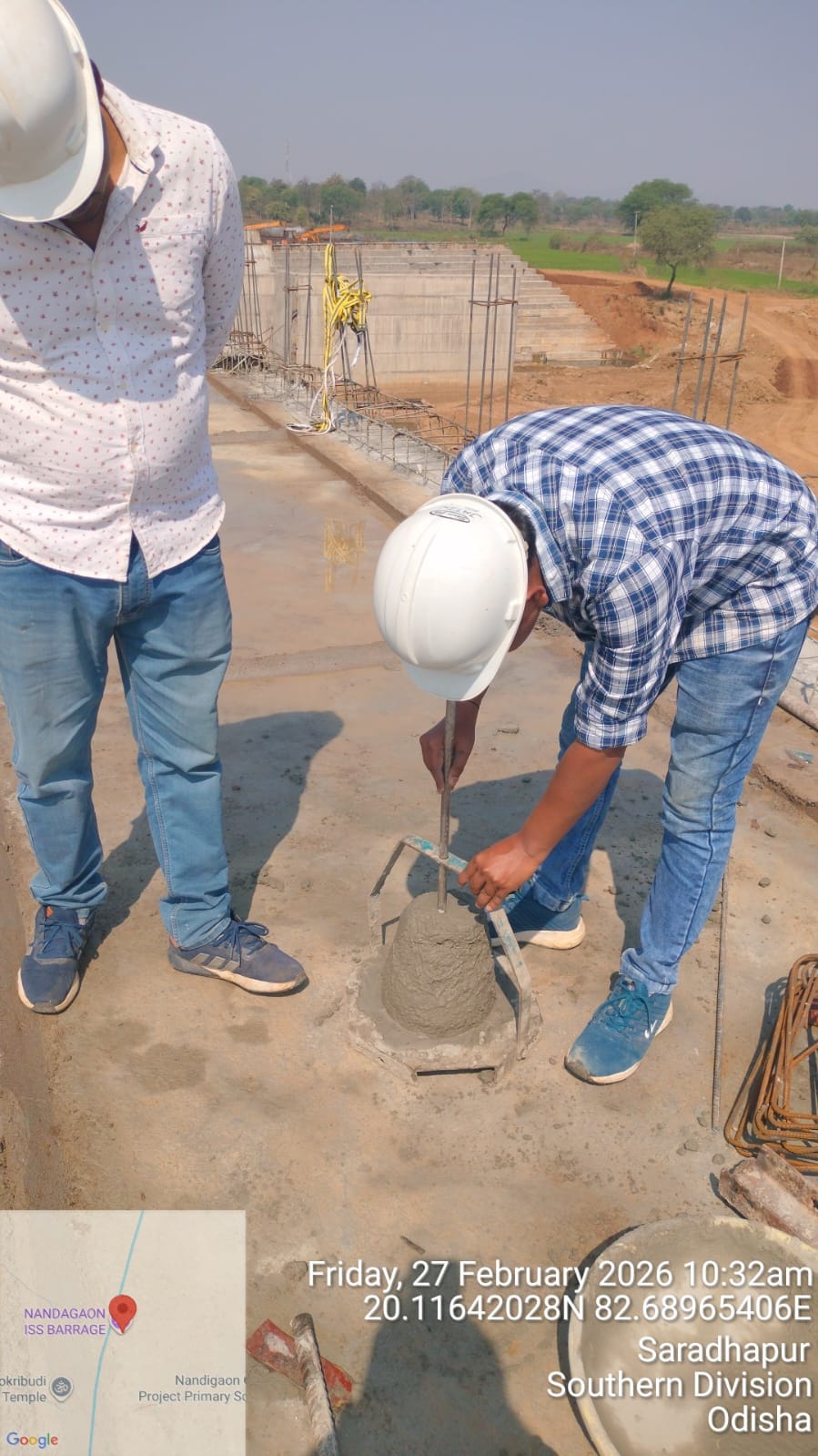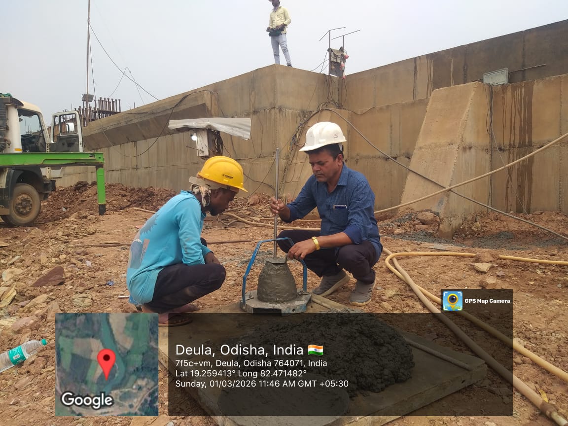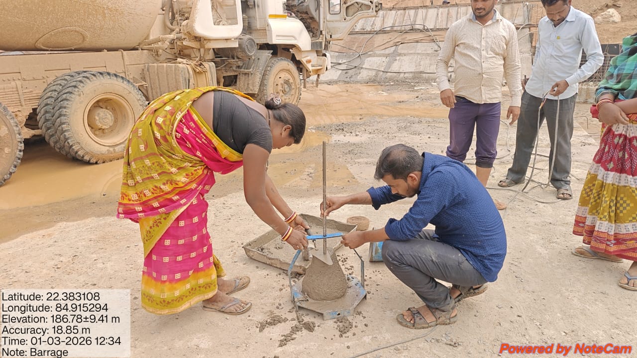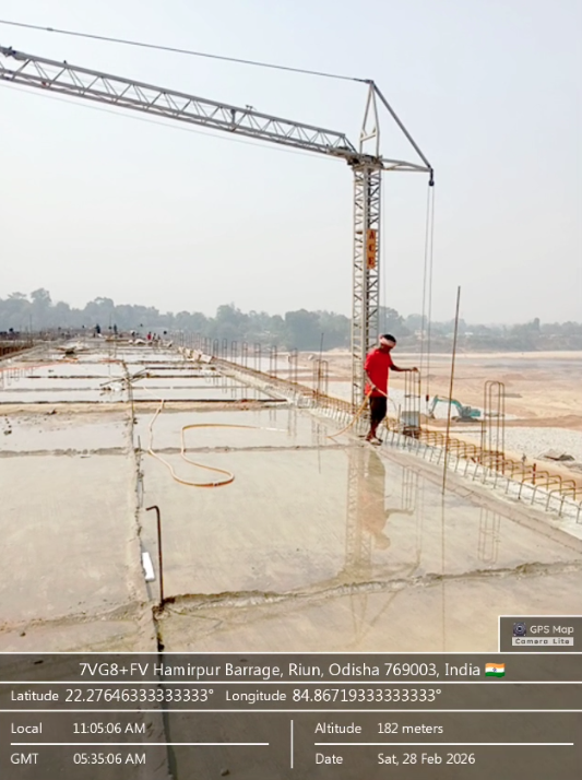 Concrete casting with RCC M35A20 grade of RCC Deck slab of Span-10 at barrage bay-8 of Block-2, using plate vibrator for proper compaction is in progress in presence DTL, Tel basin Bhawanipatna, SDO,ISS Nandgaon,QAC Expert,SHEE of PMC,PM,EPC agency,Site Engineers of PMC & EPC agency. The slump test value is 87mm on 27.02.2026