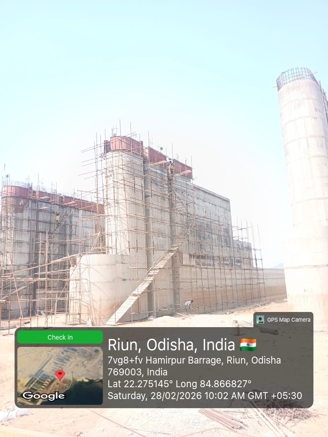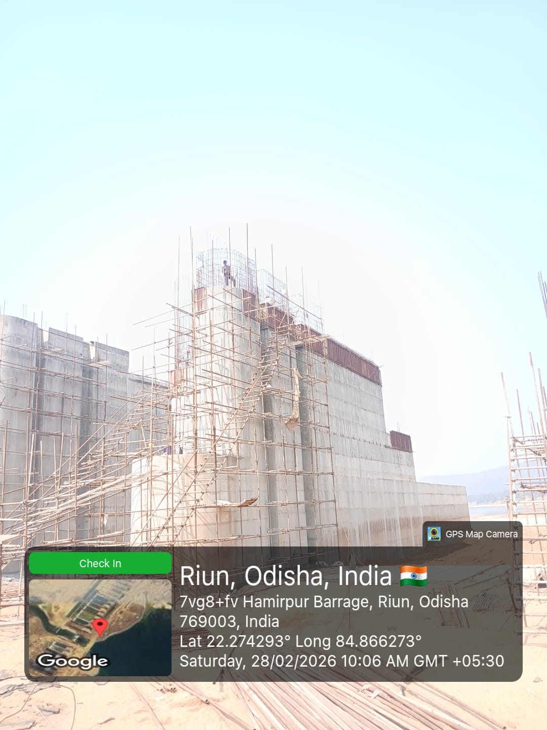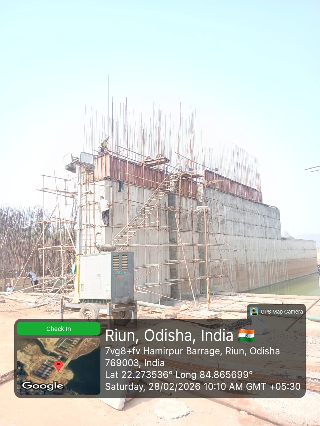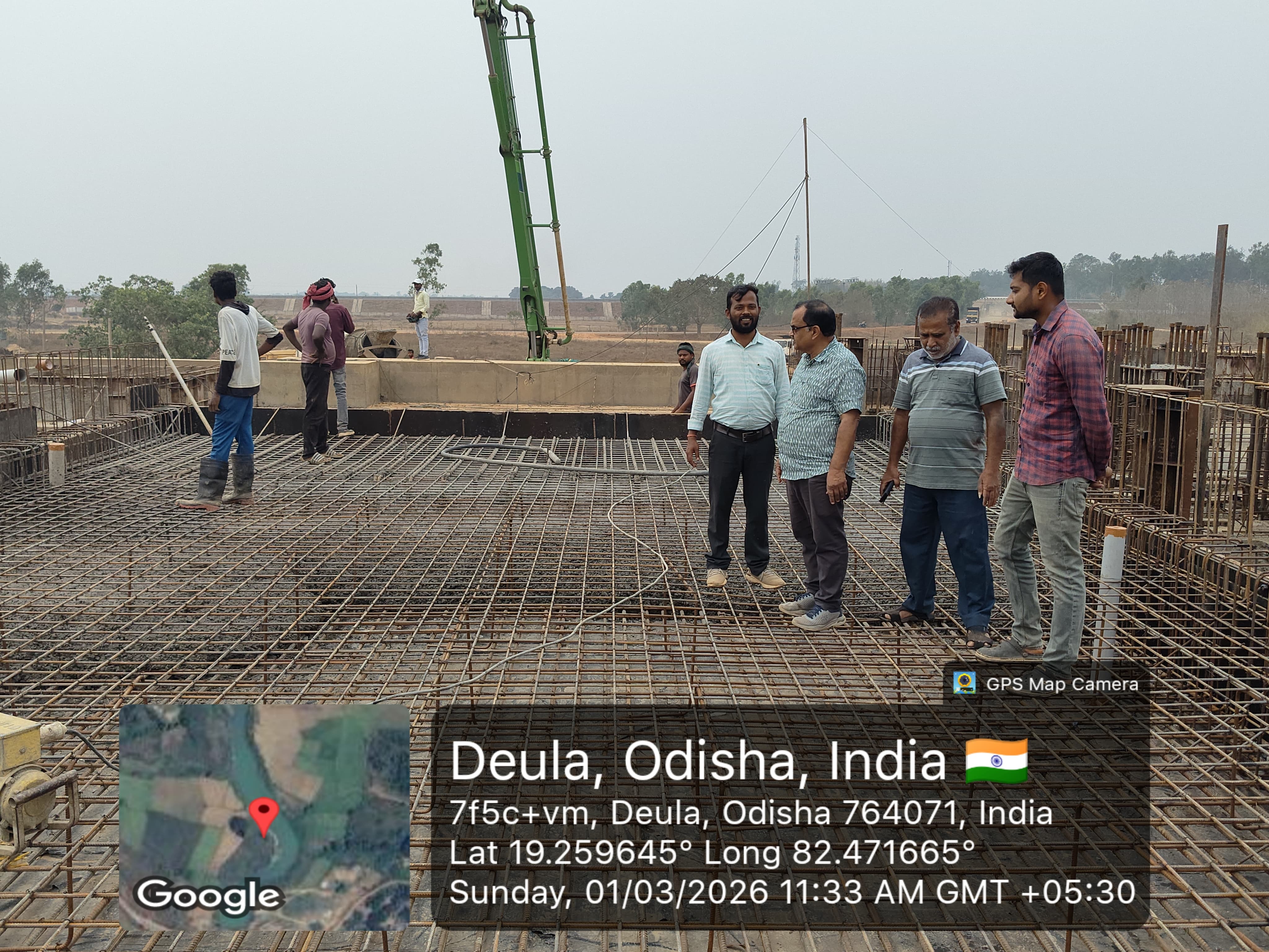 Concrete casting with RCC M35A20 grade of RCC Deck slab of Span-10 at barrage bay-8 of Block-2, using plate vibrator for proper compaction is in progress in presence DTL, Tel basin Bhawanipatna, SDO,ISS Nandgaon,QAC Expert,SHEE of PMC,PM,EPC agency,Site Engineers of PMC & EPC agency. The slump test value is 87mm on 27.02.2026