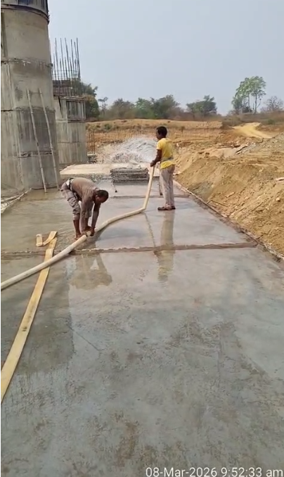Concrete casting with RCC M35A20 grade of RCC Deck slab of Span-13 of Block-2, using plate vibrator for proper compaction is in progress in presence of SDO& JE, ISS Nandgaon, QAC Expert,SHEE of PMC,PM,EPC agency,Site Engineers of PMC & EPC agency. The slump test value is 82mm on 08.03.2026