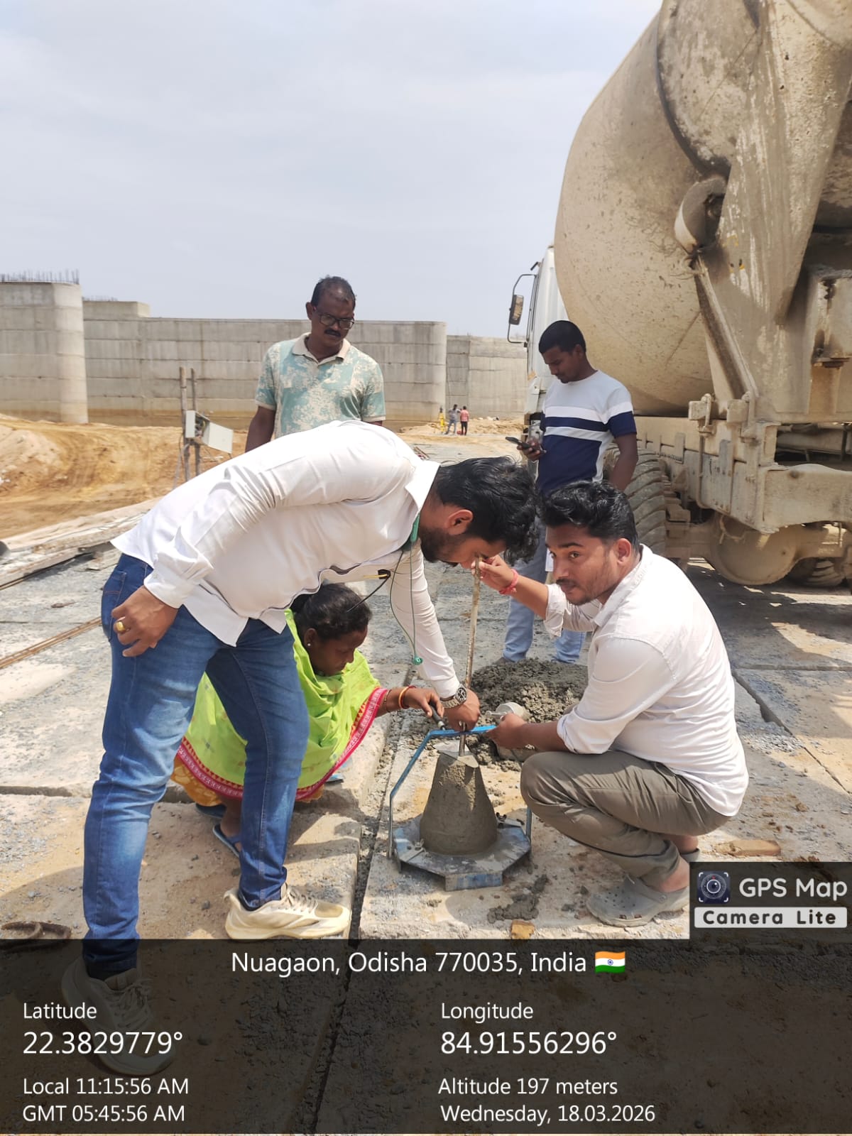 Concrete casting with PCC M20A20 grade of 2nos. CC blocks at D/S right Flared out wall i.e 1no. of size 6.0x1.8x0.6m from sec. 5-5 to sec. 6-6 for 4th lift & 1no. of size 6.0x1.5x0.6m from sec.4-4 to sec.5-5 for 3rd lift upto RL-238.20m is in progress in presence of PM EPC agency,Site Engineers of PMC & EPC agency. The slump test value is 83mm on 18.03.2026