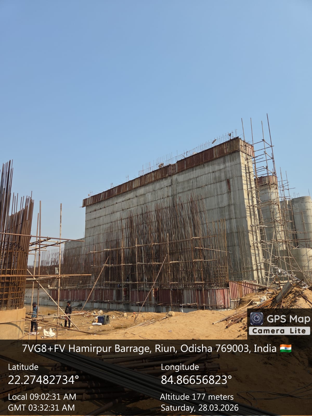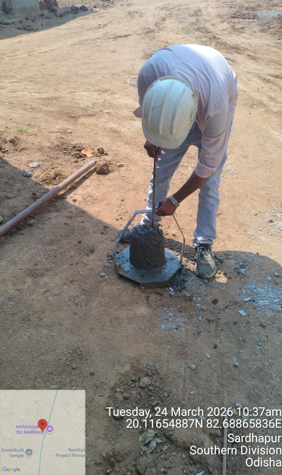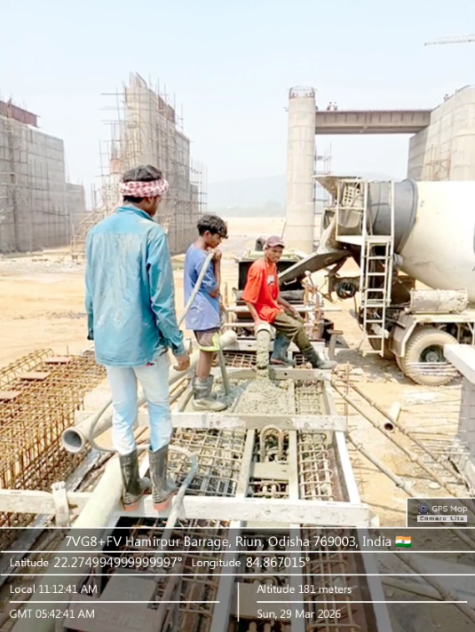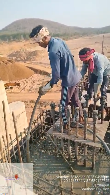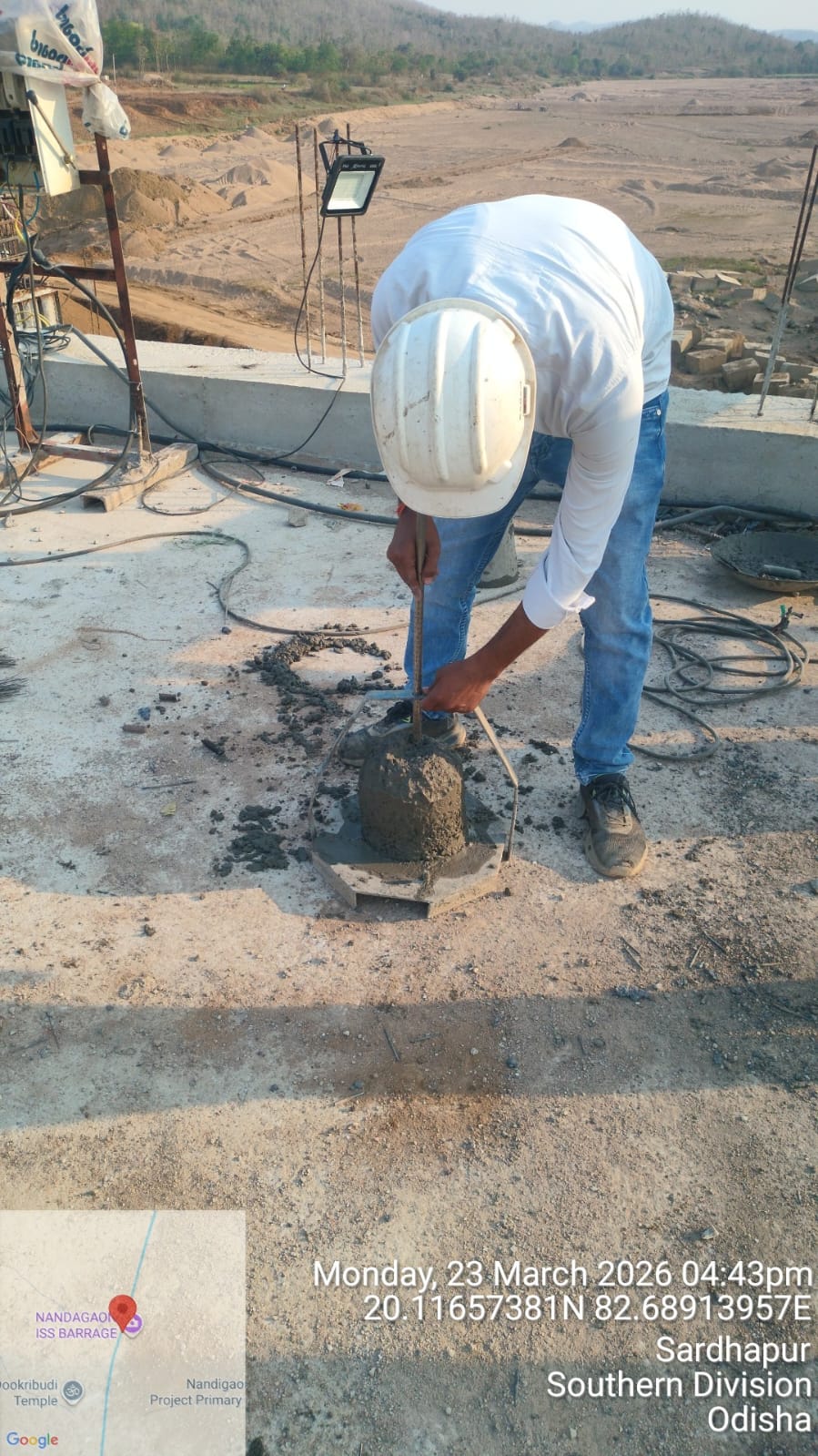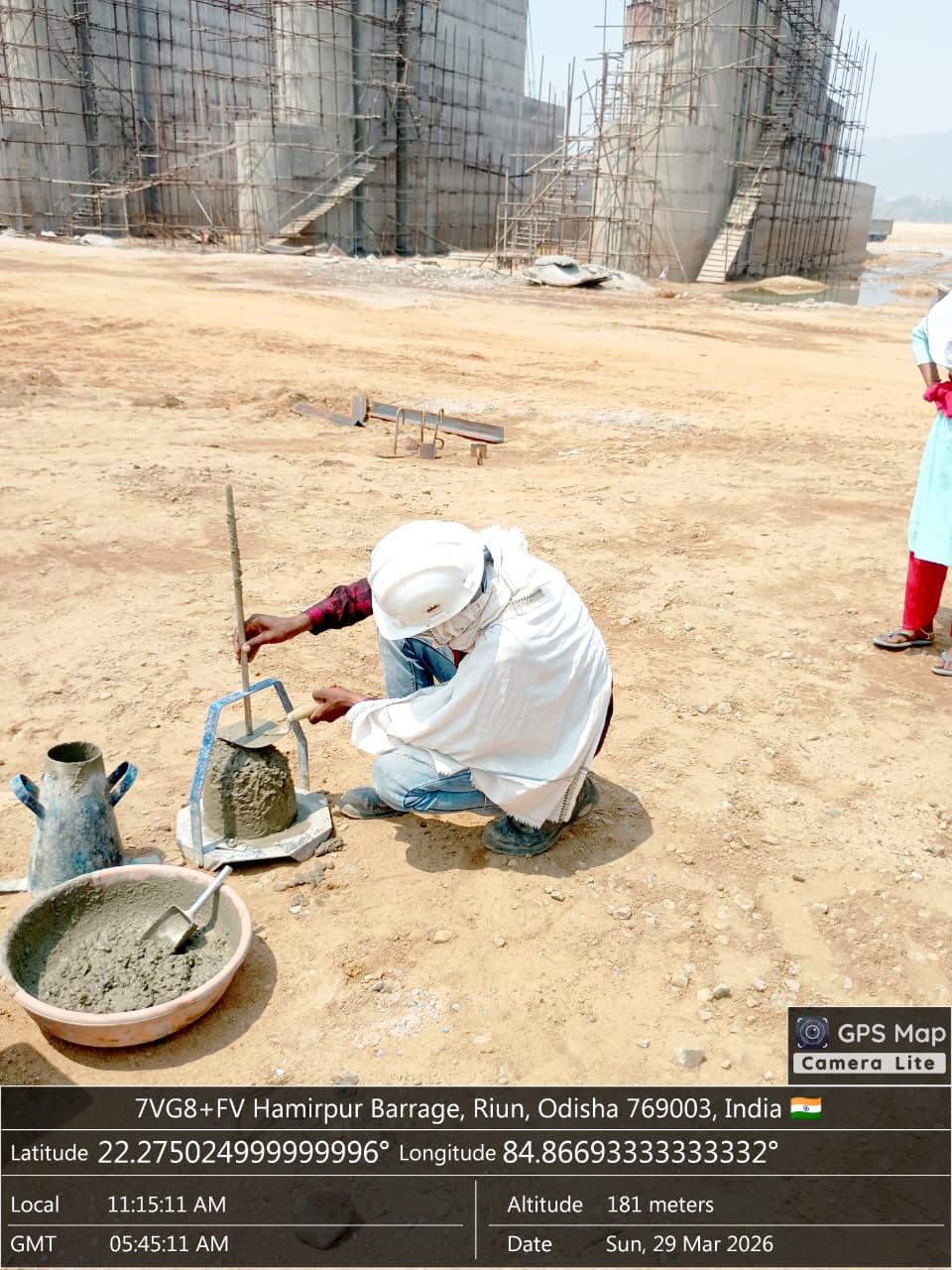 Concrete casting with M35A20 grade of 2nd stage concrete at pier no.1& left abutment for 6th lift of under sluice bay-1 is in progress in presence of Site Engineers of PMC & EPC agency. The slump test value is 84mm on 24.03.2026