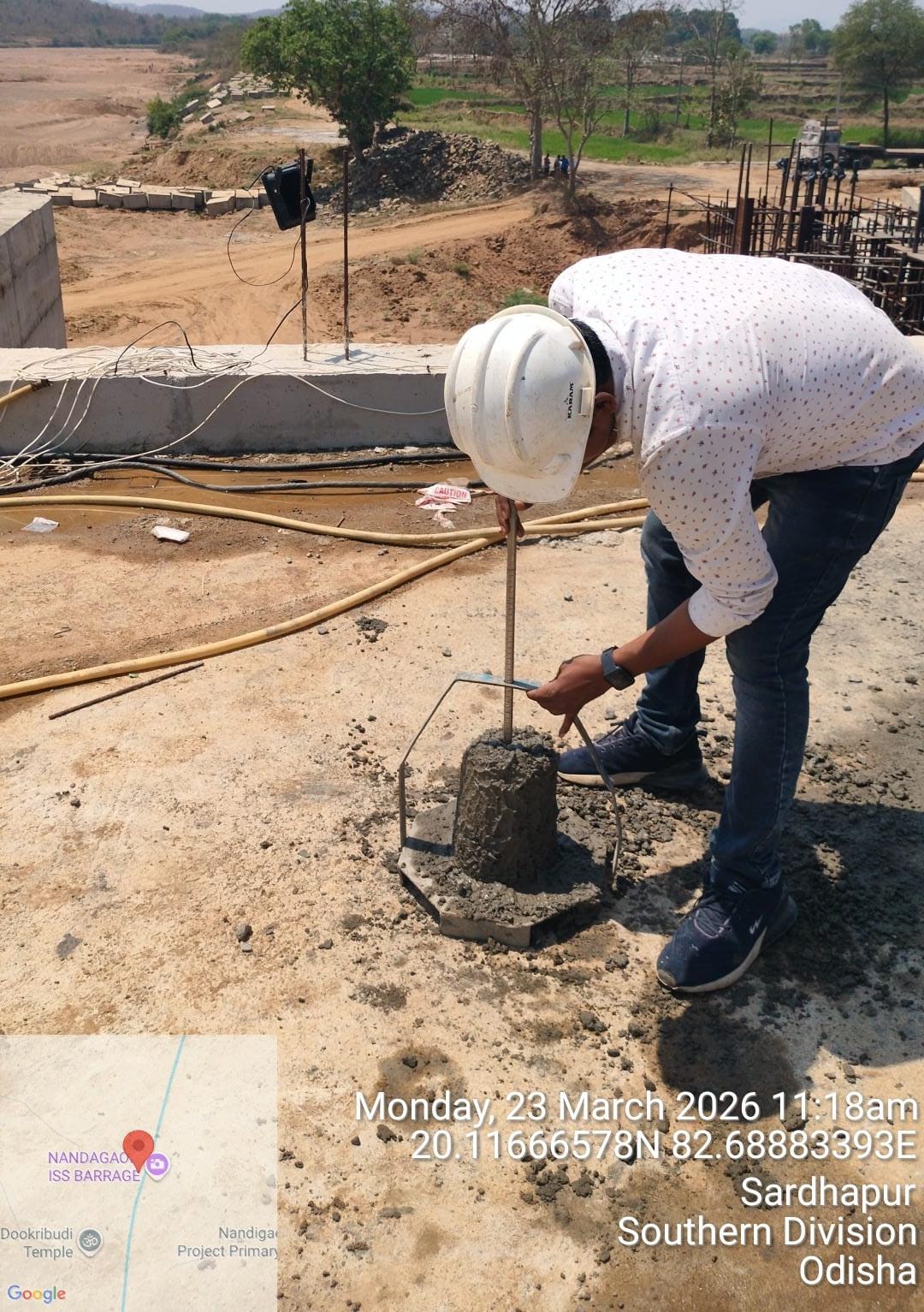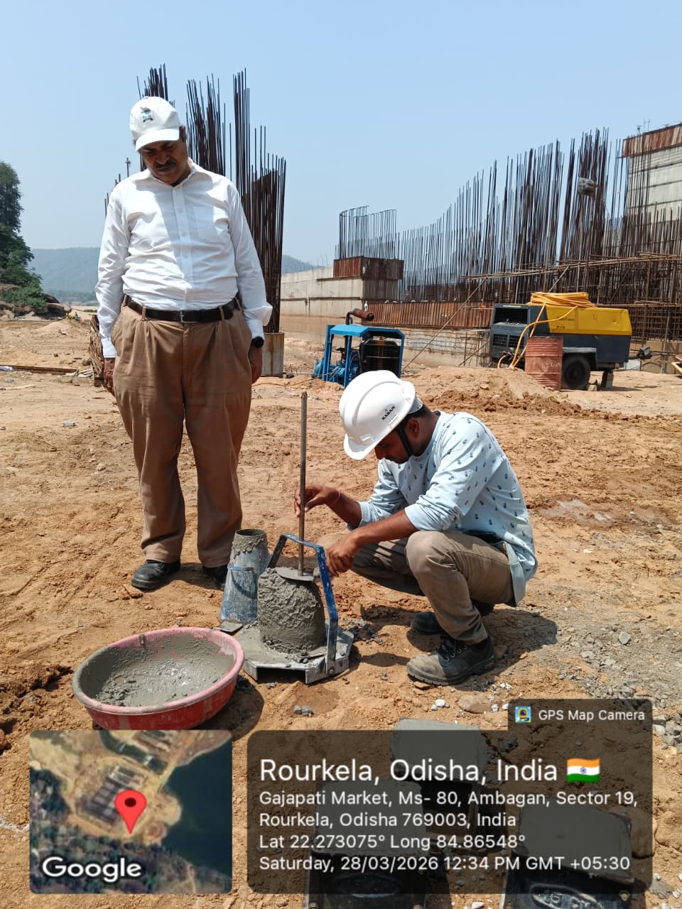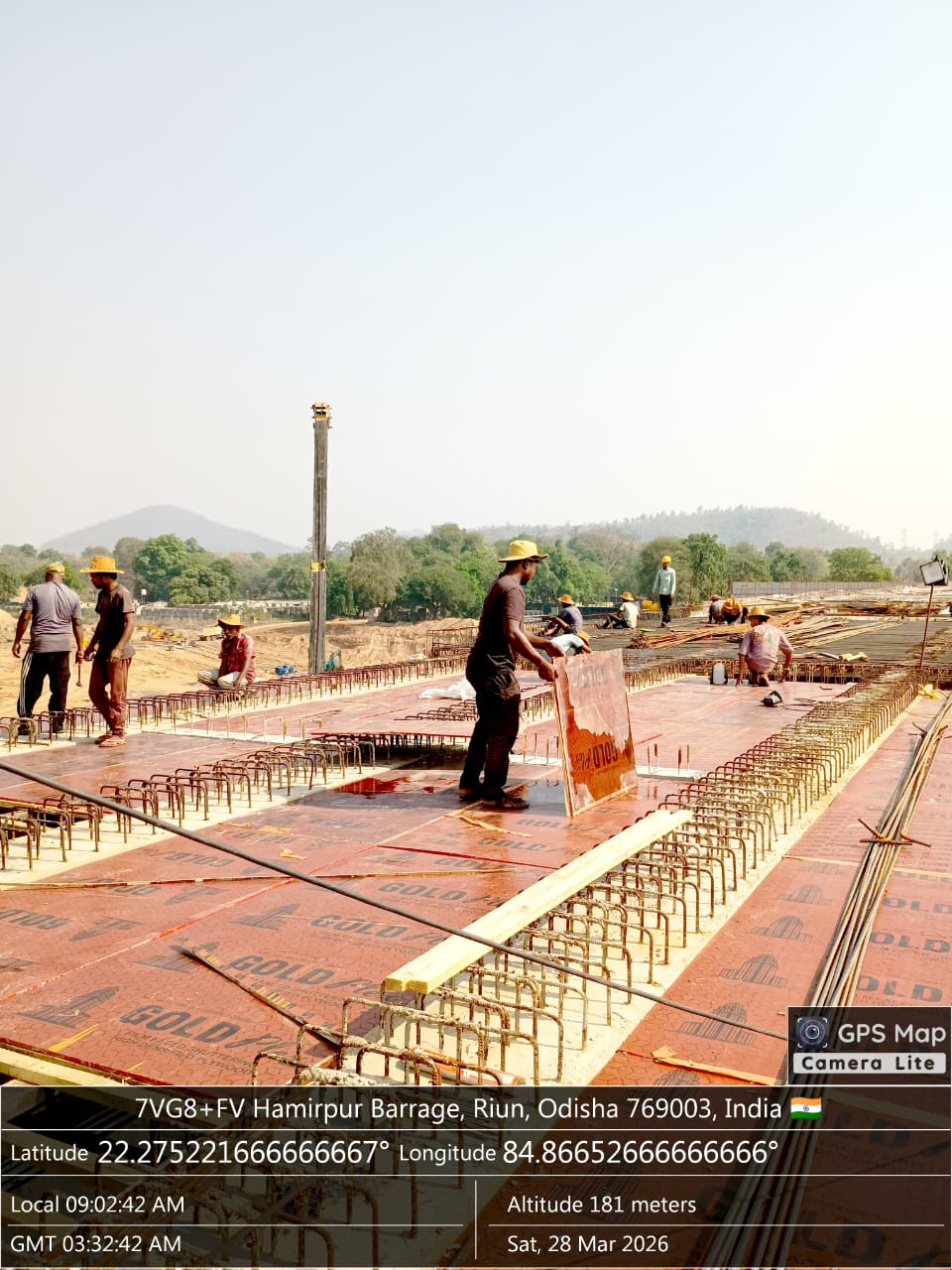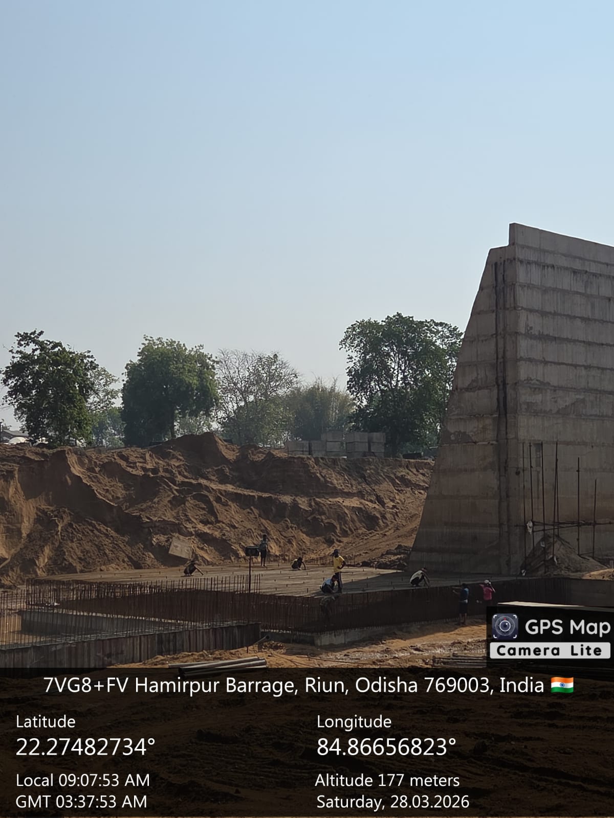 Concrete casting with M35A20 grade of 2nd stage concrete at pier no.1& left abutment for 6th lift of under sluice bay-1 is in progress in presence of Site Engineers of PMC & EPC agency. The slump test value is 84mm on 24.03.2026
