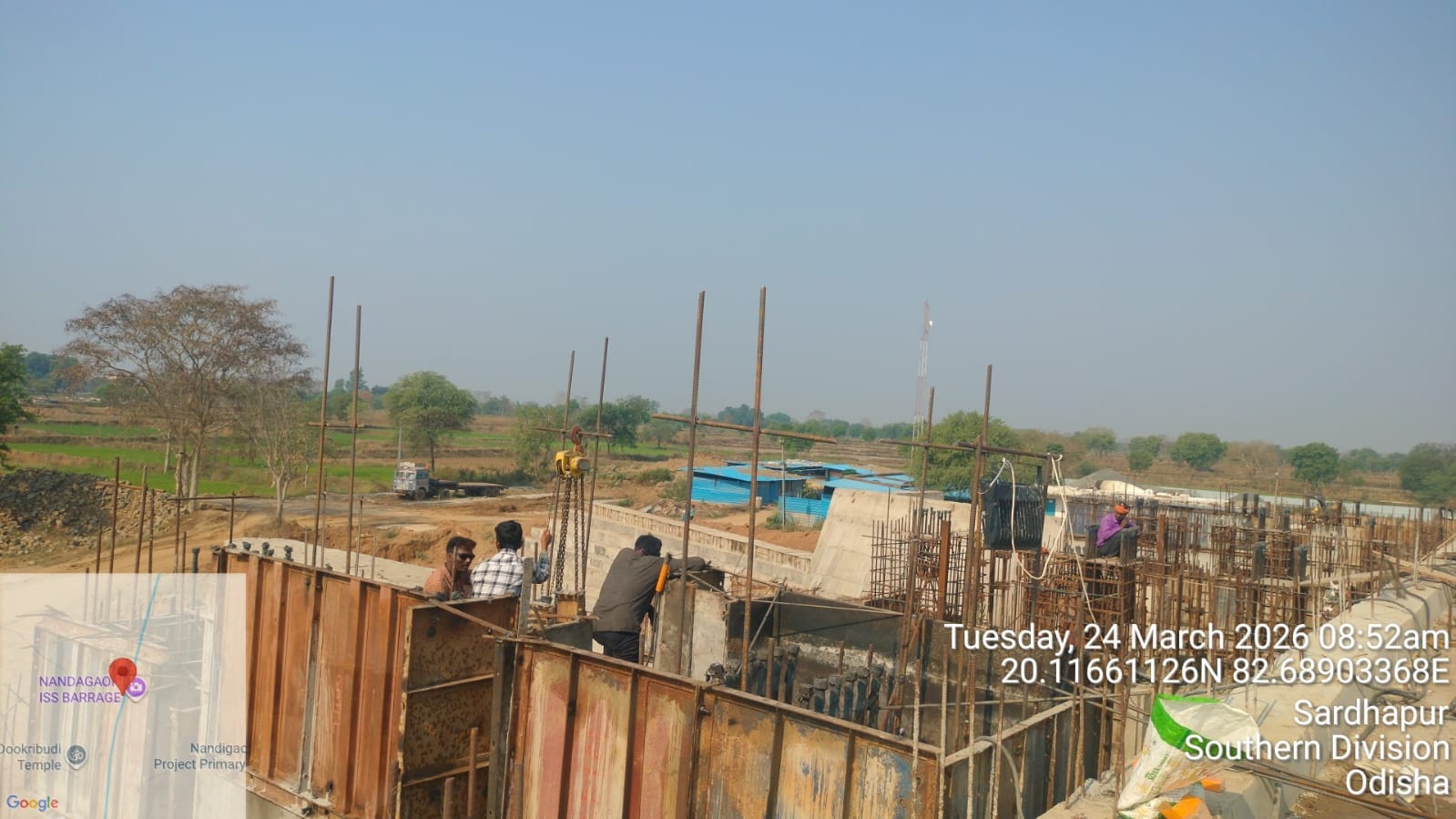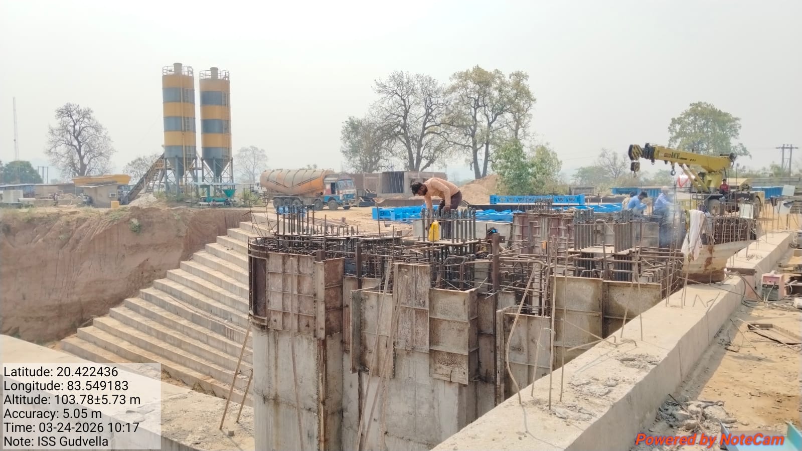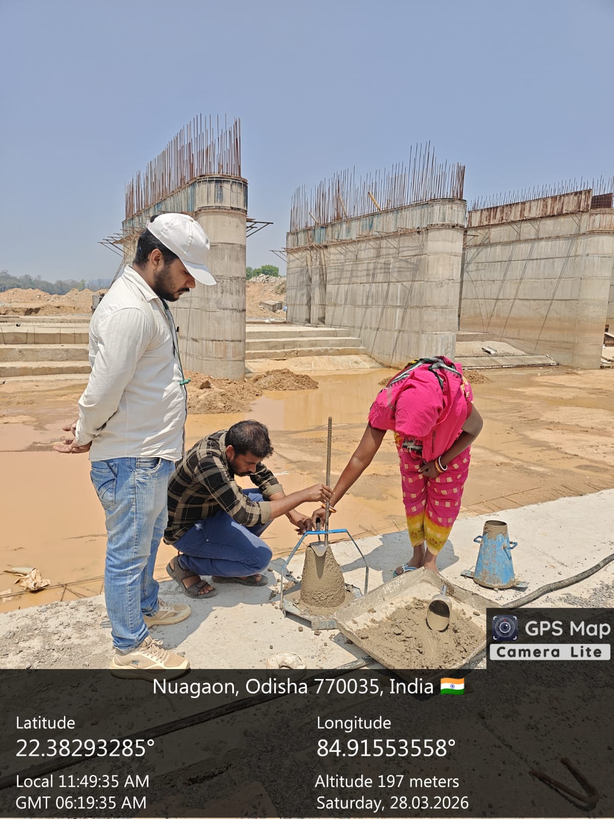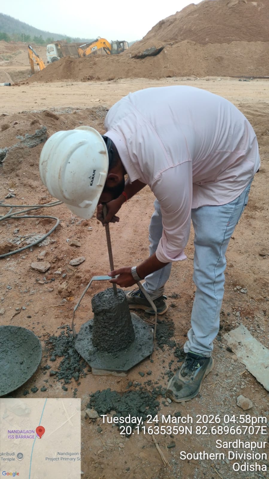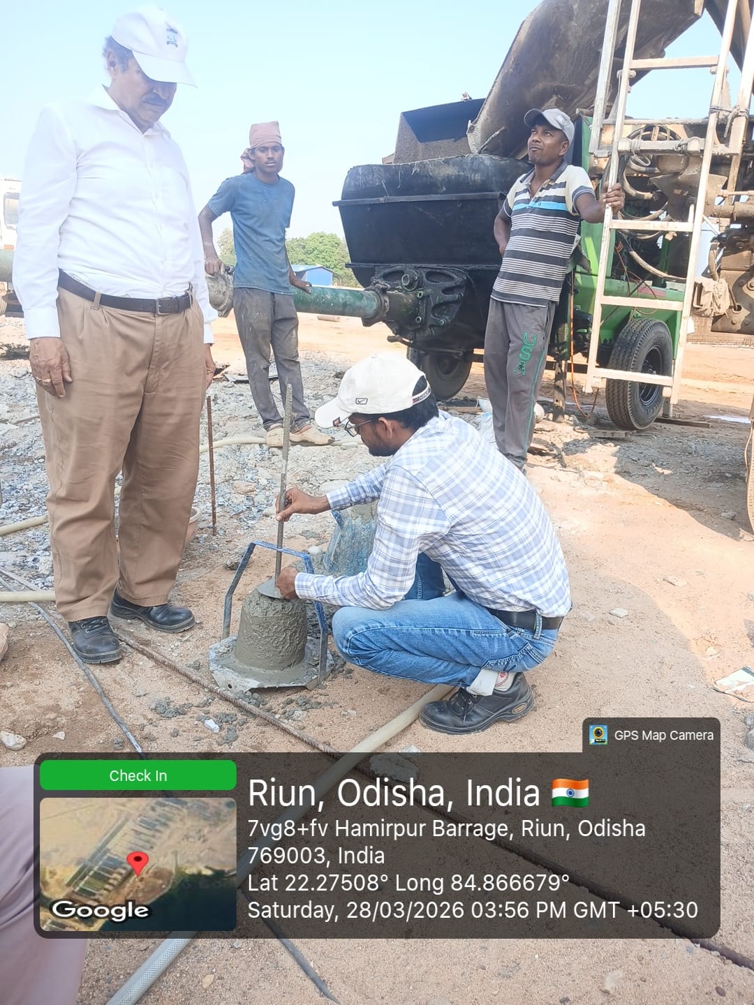Concrete casting with M35A20 grade of 2nd stage concrete at pier no.1& left abutment for 6th lift of under sluice bay-1 is in progress in presence of Site Engineers of PMC & EPC agency. The slump test value is 84mm on 24.03.2026