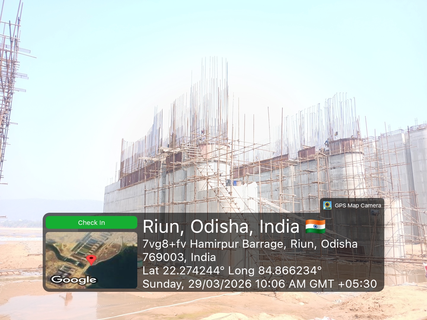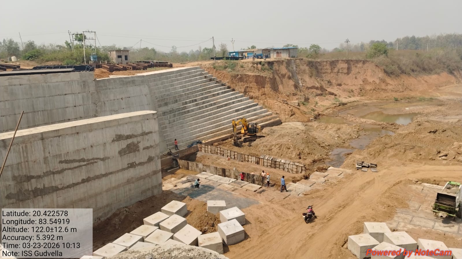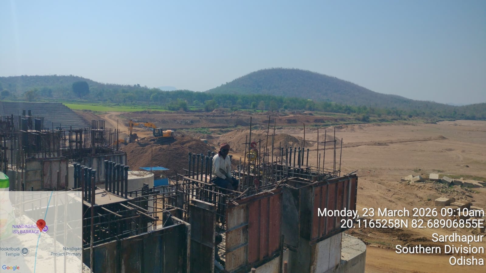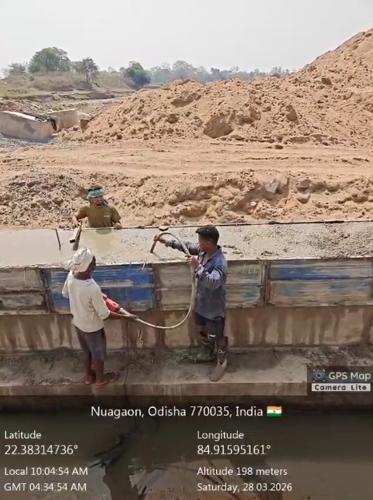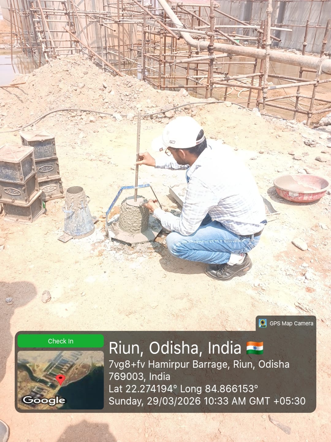 Concrete casting with M35A20 grade of 2nd stage concrete at pier no.1& left abutment for 6th lift of under sluice bay-1 is in progress in presence of Site Engineers of PMC & EPC agency. The slump test value is 84mm on 24.03.2026