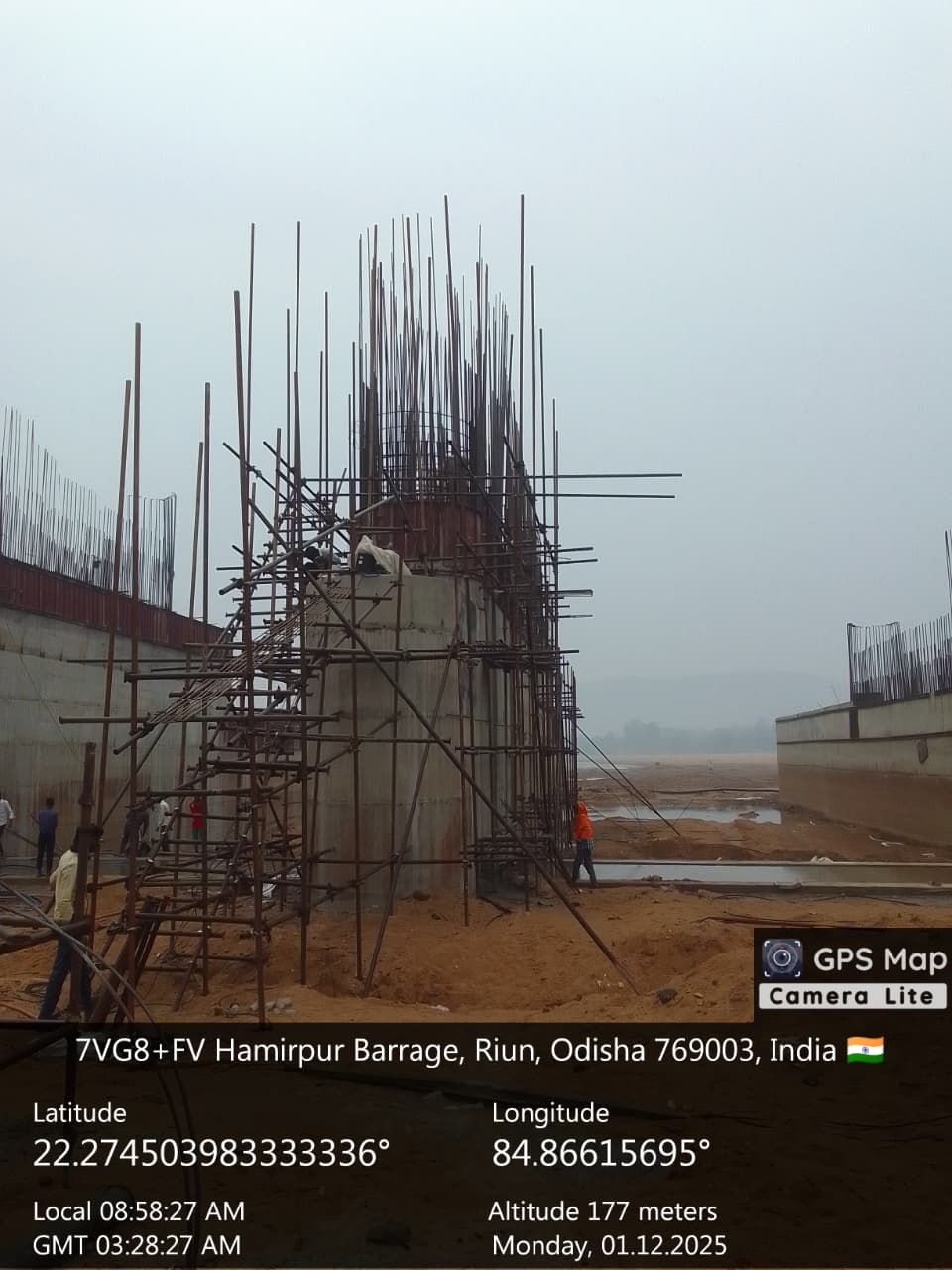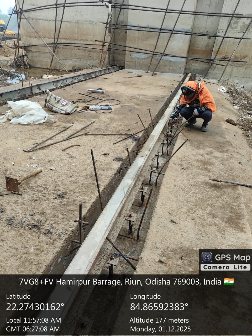 Cast of concrete 3rd lift pocket filling M20A20 grade at right side under sluice bay in between P9 and A2 from RL 146.15 m to 147.10m in the presence of Dept JE, site engineer of PMC and agency at site. Slump achieved 83mm on 01.12.2025